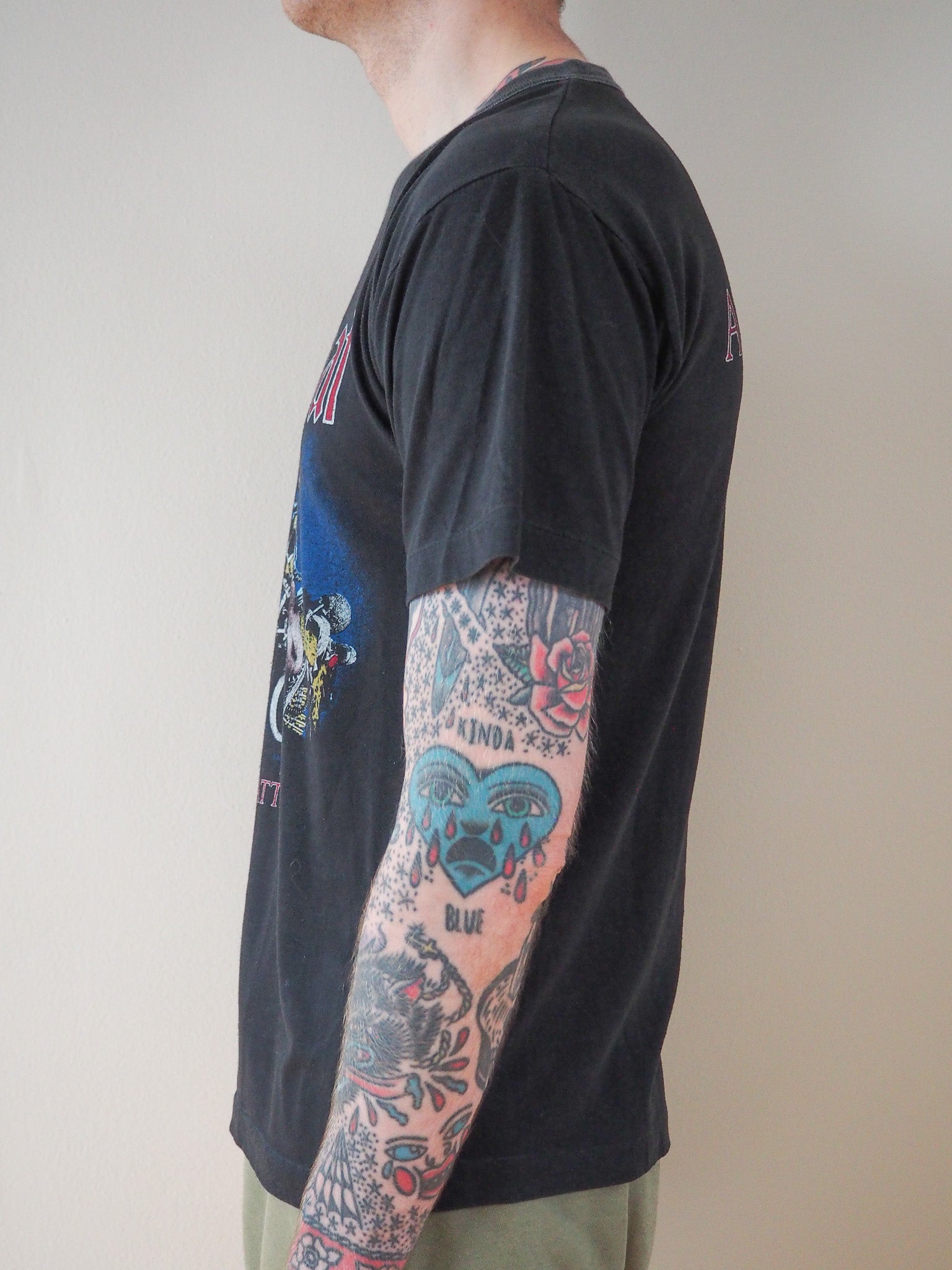 Printed on 80s blank with a cut tag. Great fade on shirt, good vintage condition. Single stitched top and single stitched bottom.