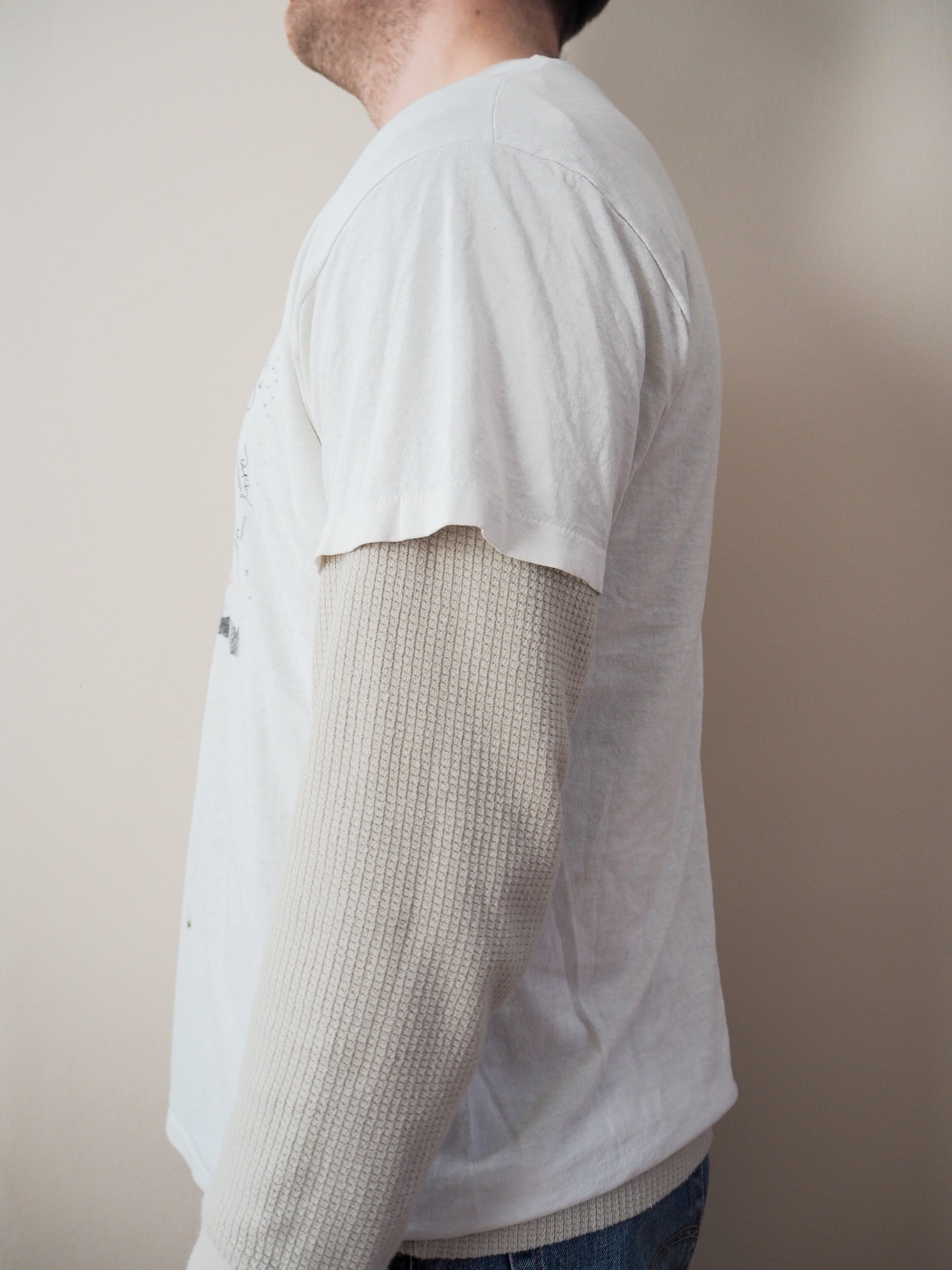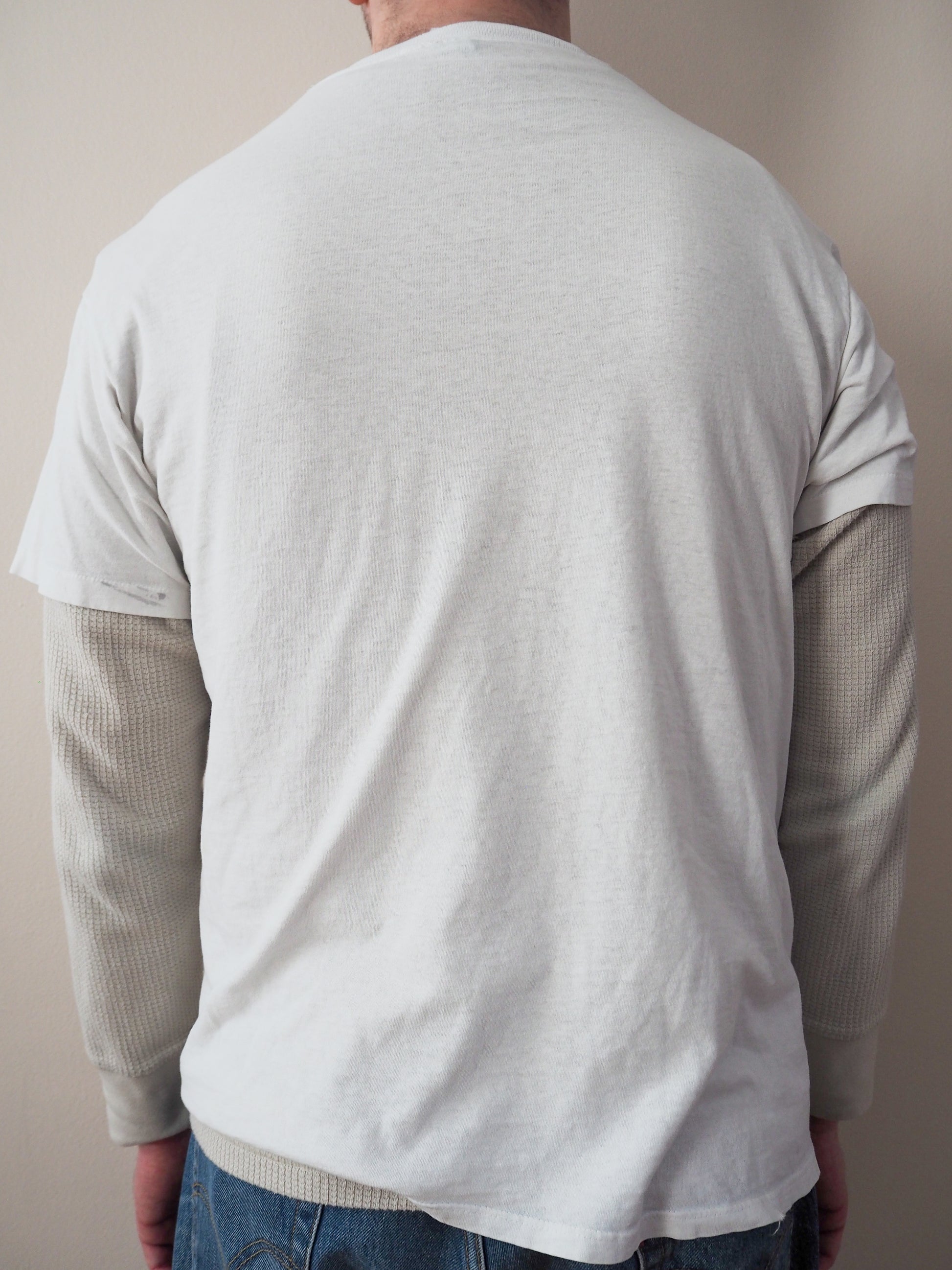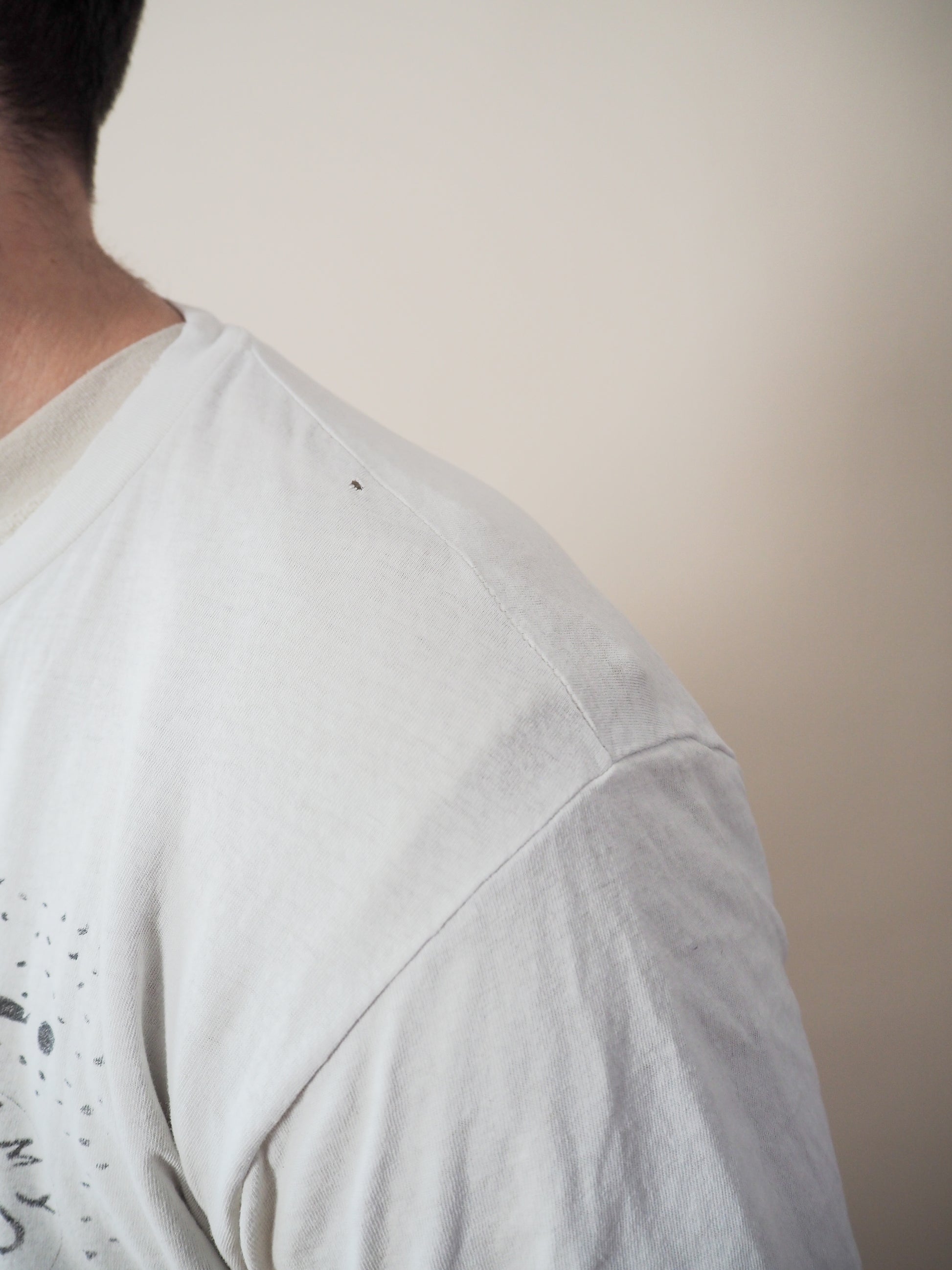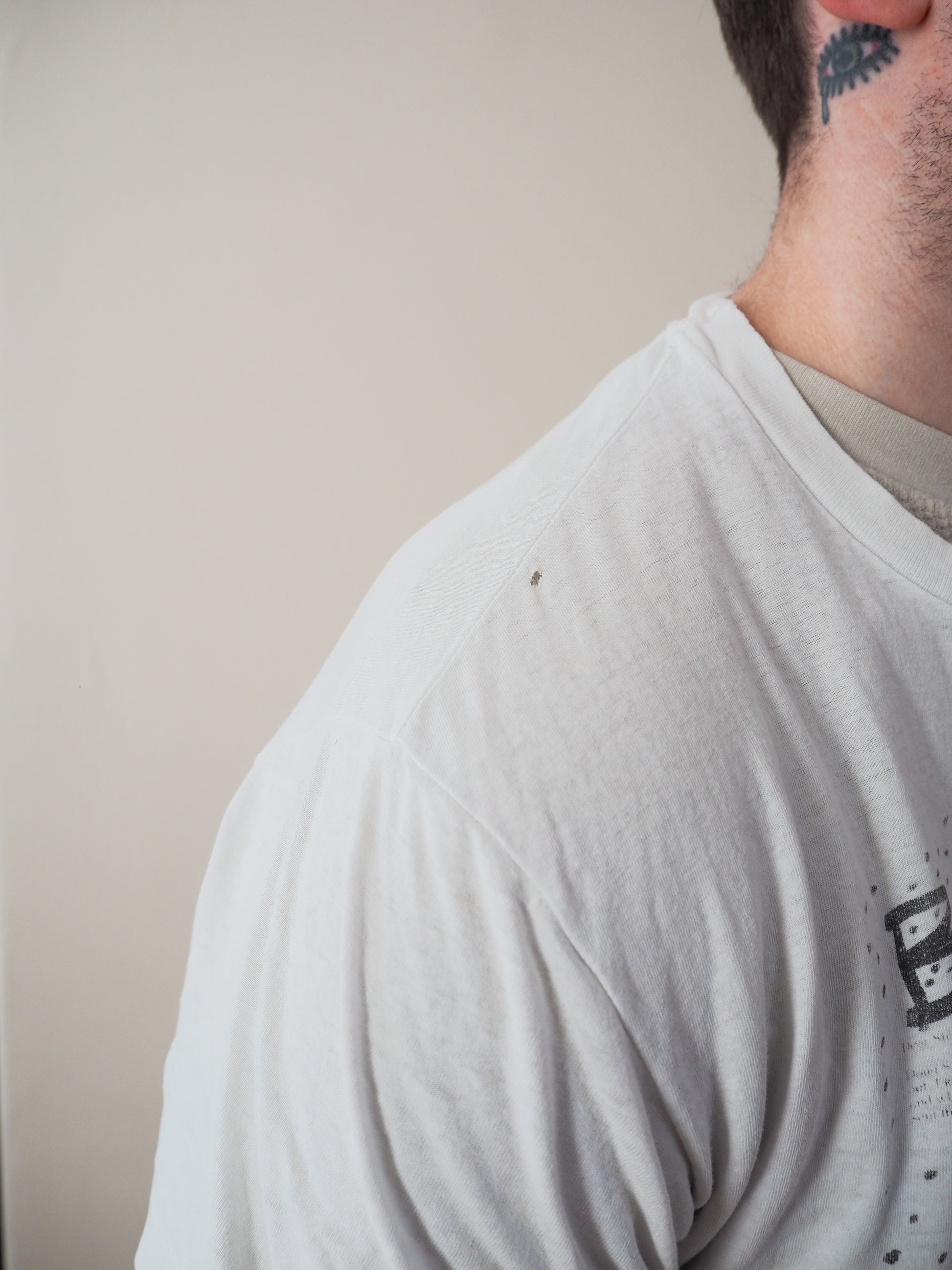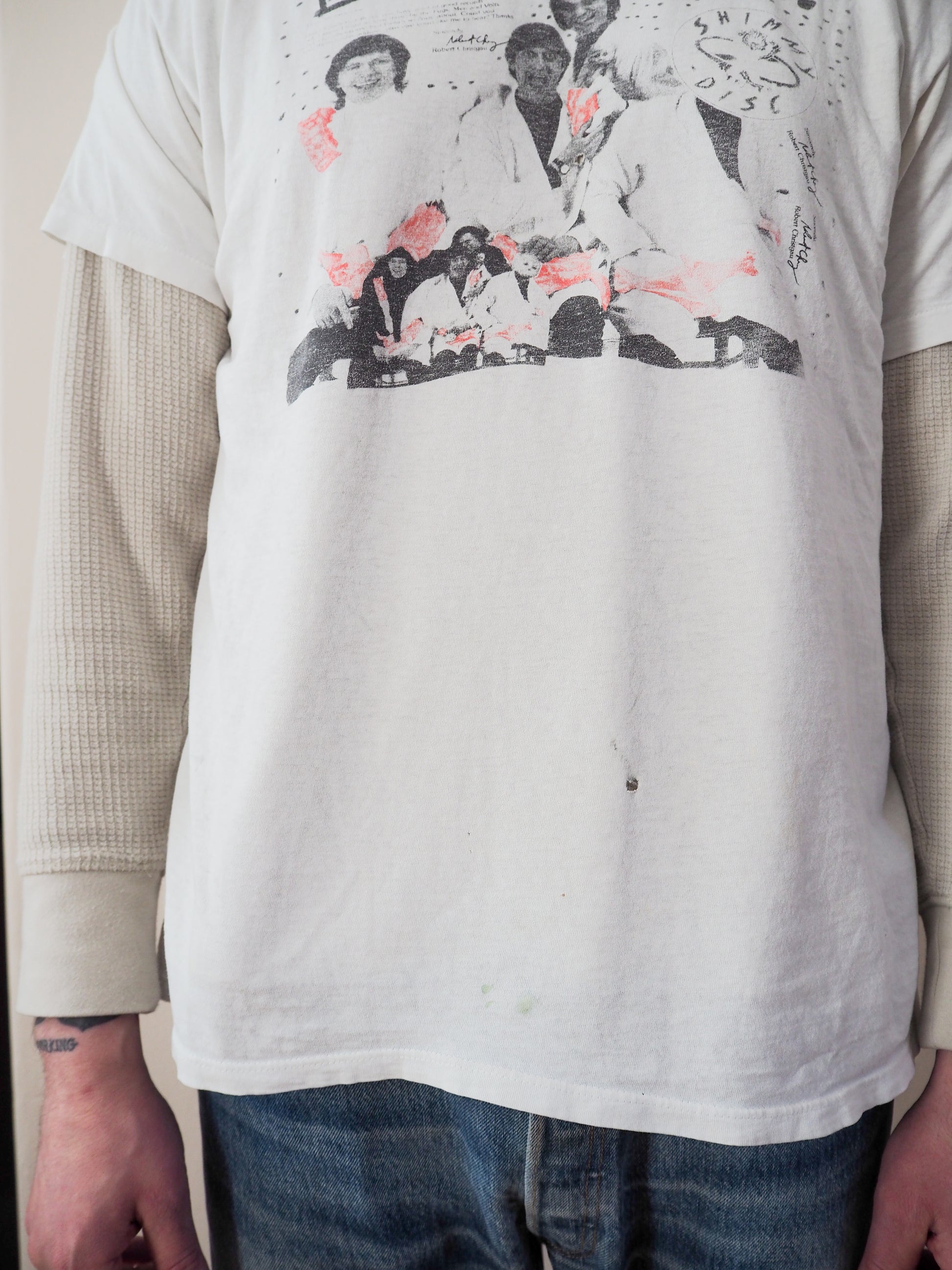 Printed on a Hanes 100% cotton tagged XL. Some holes, pinholes, and staining throughout. Butter soft. Single stitched top and double stitched bottom.