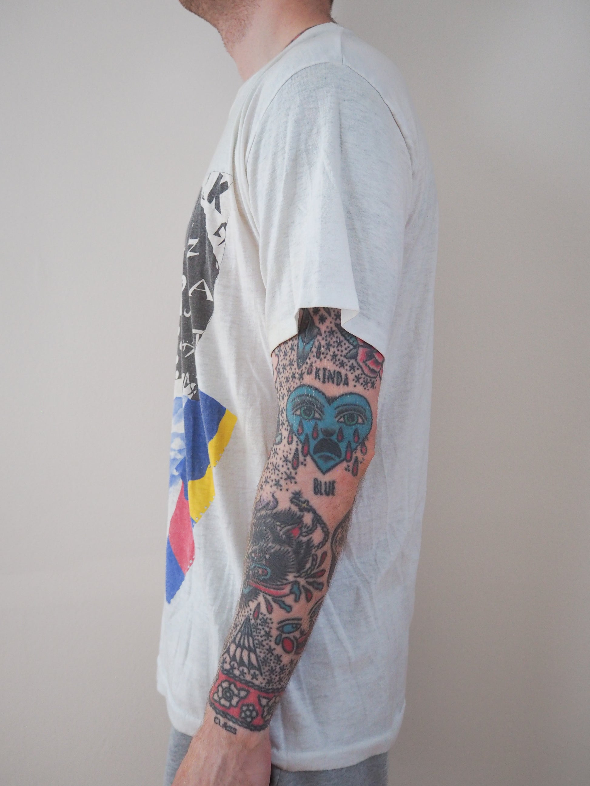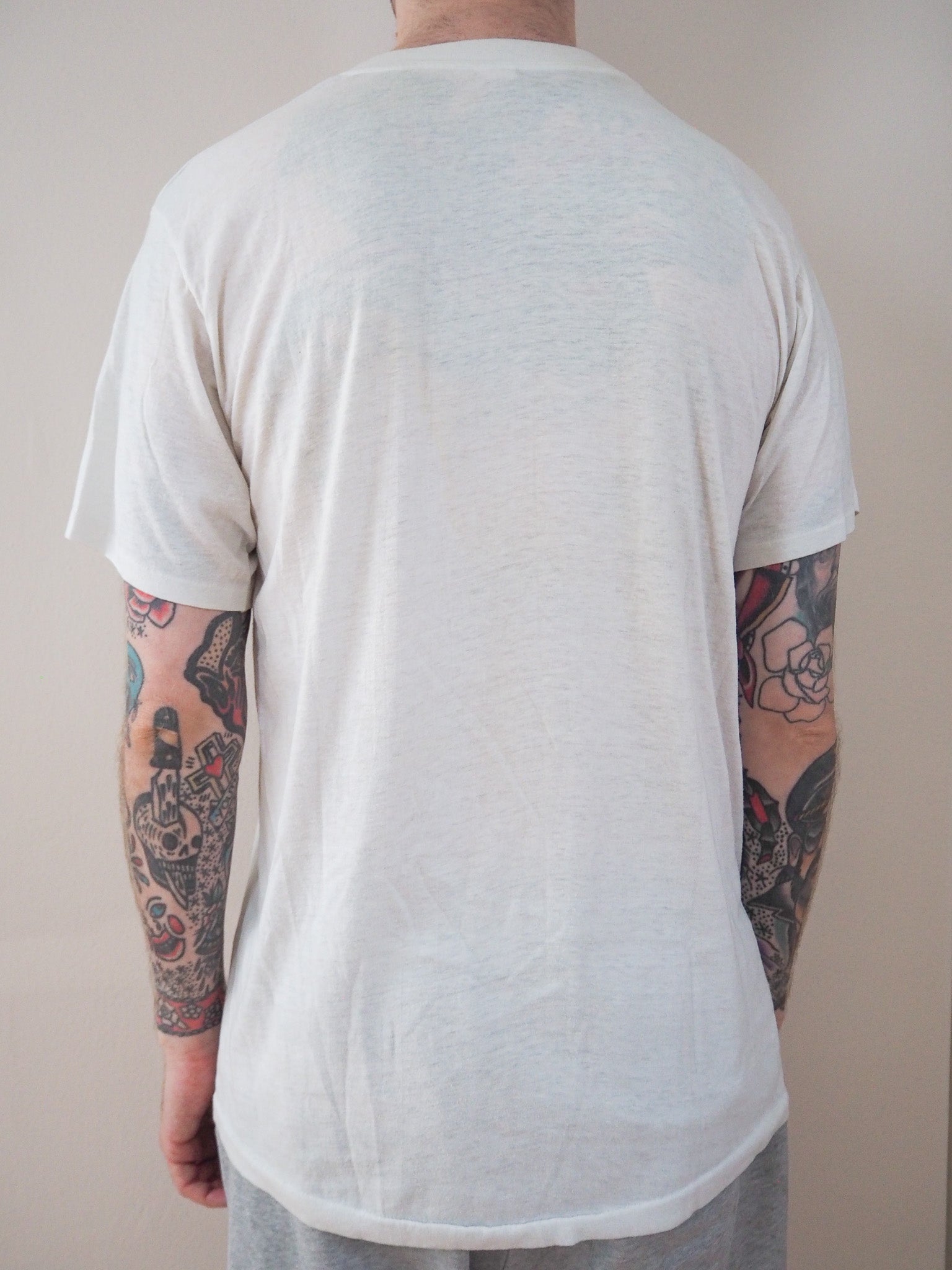 Printed on a 80s tagged XL. Some light staining throughout. Amazing fade. Single stitched top and single stitched bottom.