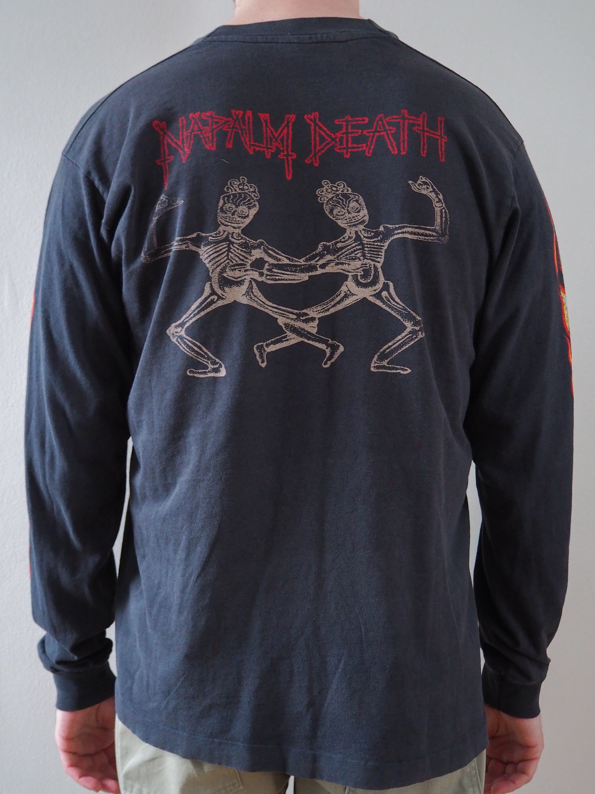 Printed on a Screen Stars best Tagged XL. Great fade with some cracking on the graphic. single stitched bottom with some pinholes throughout.