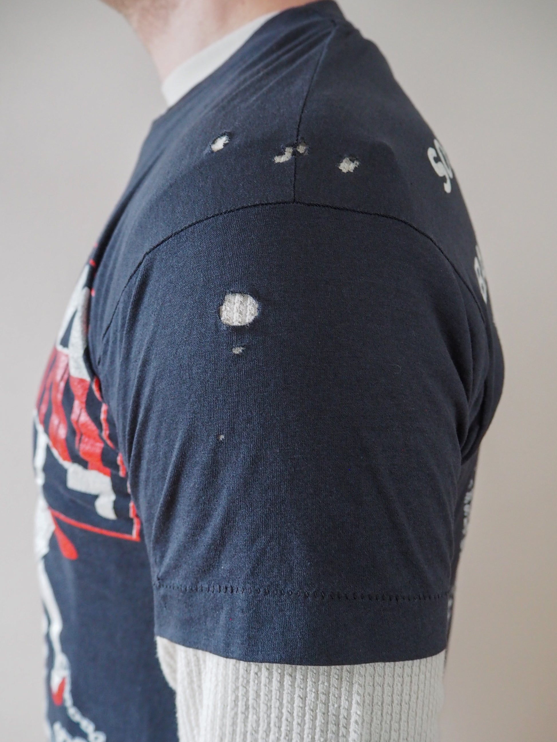 Cut tag and printed on a late 80s 50/50 blank. Great fade and cracking on the graphic some holes on sleeve. Single stitched top and single stitched bottom.