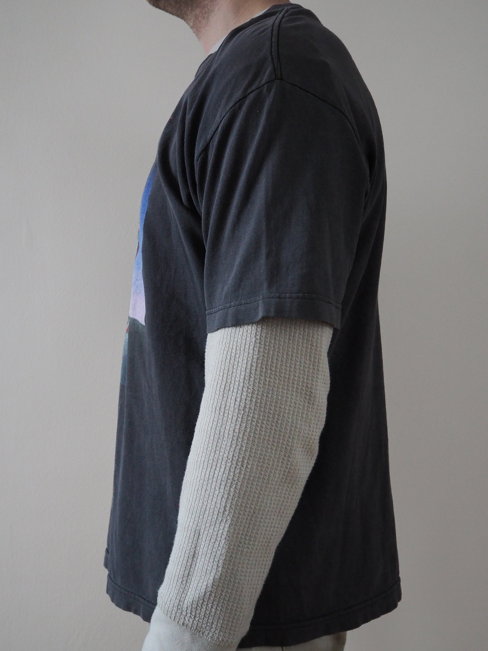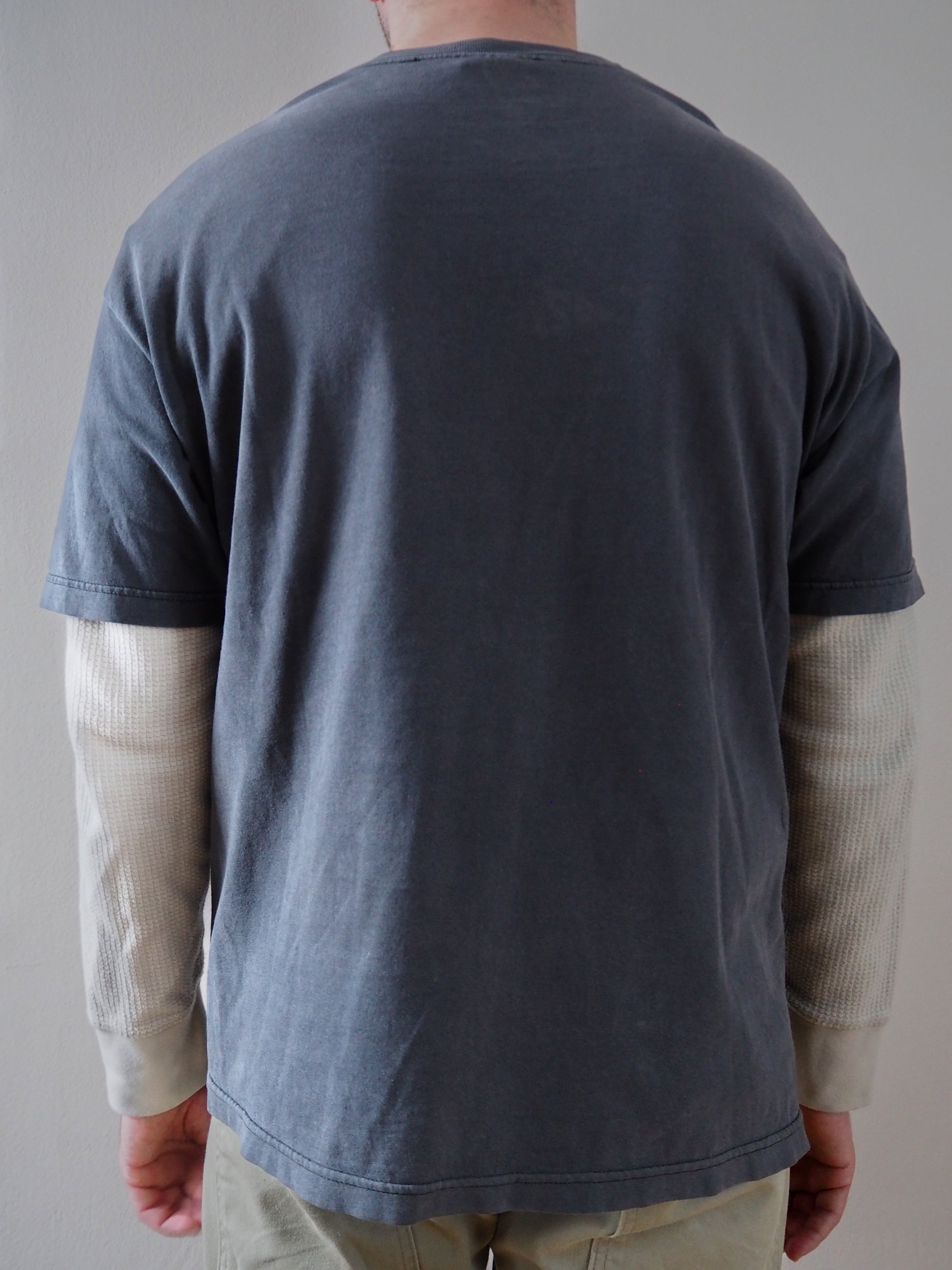 Printed on a Giant tag. Faded with some cracking on graphic. Double stitched top and double stitched bottom.