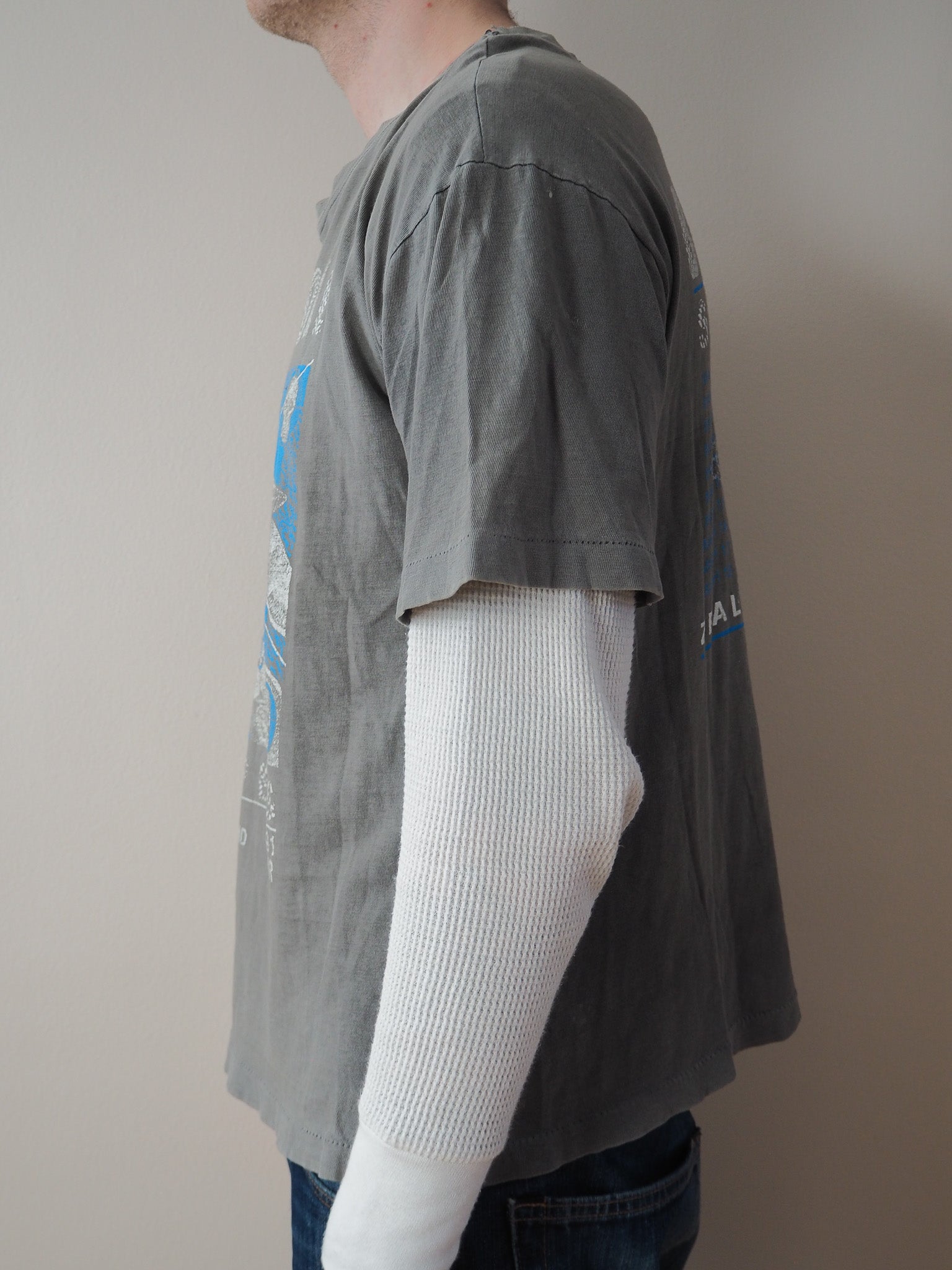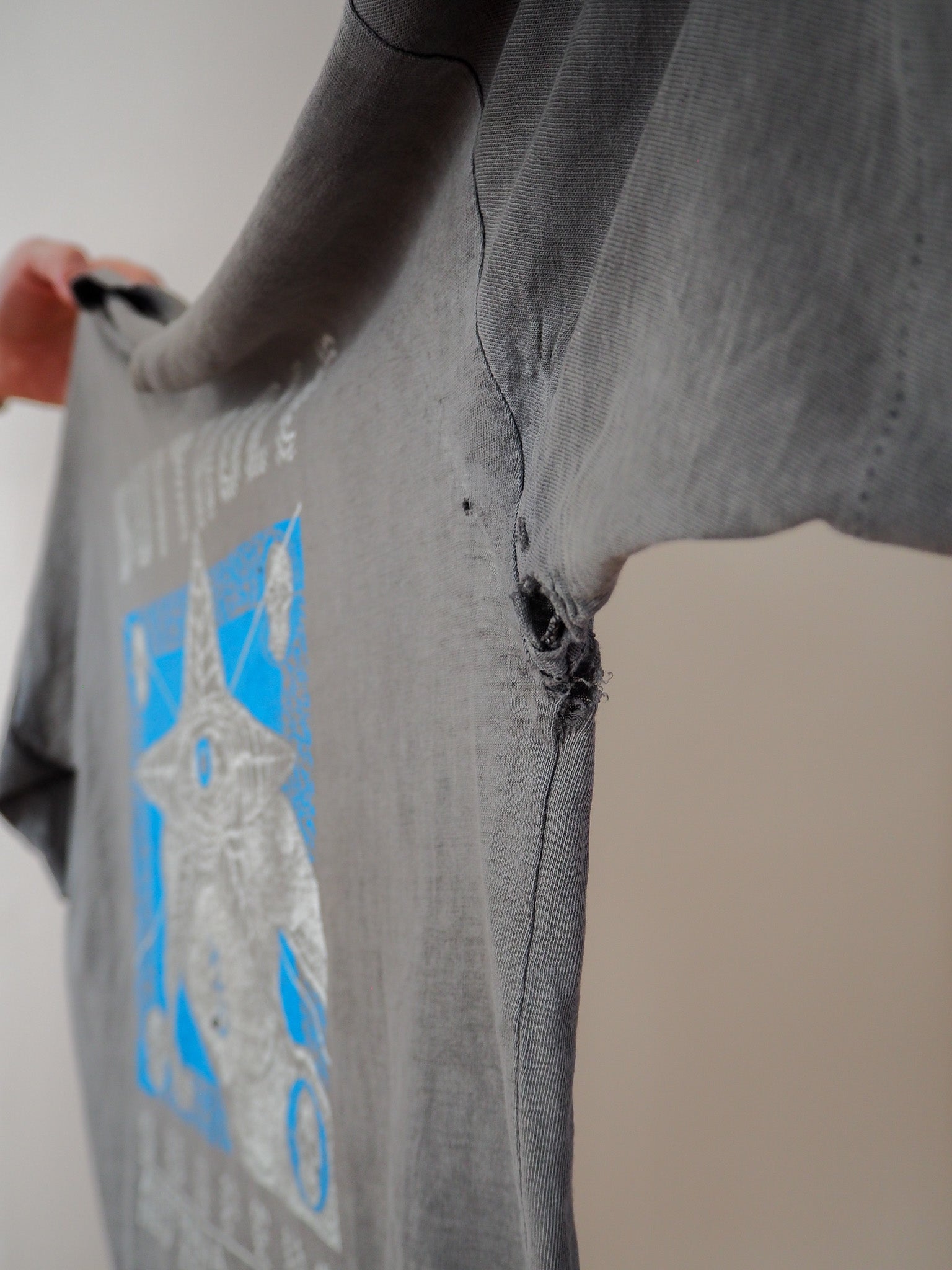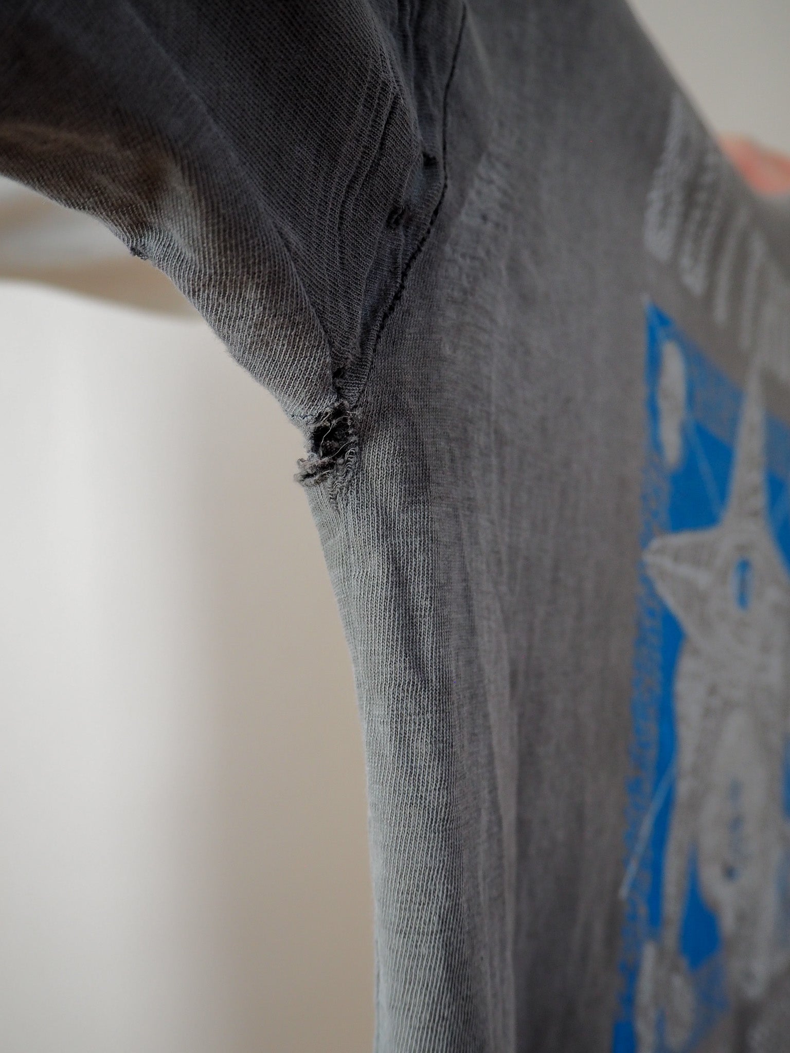 Printed on a faded out Australian tag. Distressed in pits, stretched neck, fading and thrashing throughout. Single stitched top and single bottom.