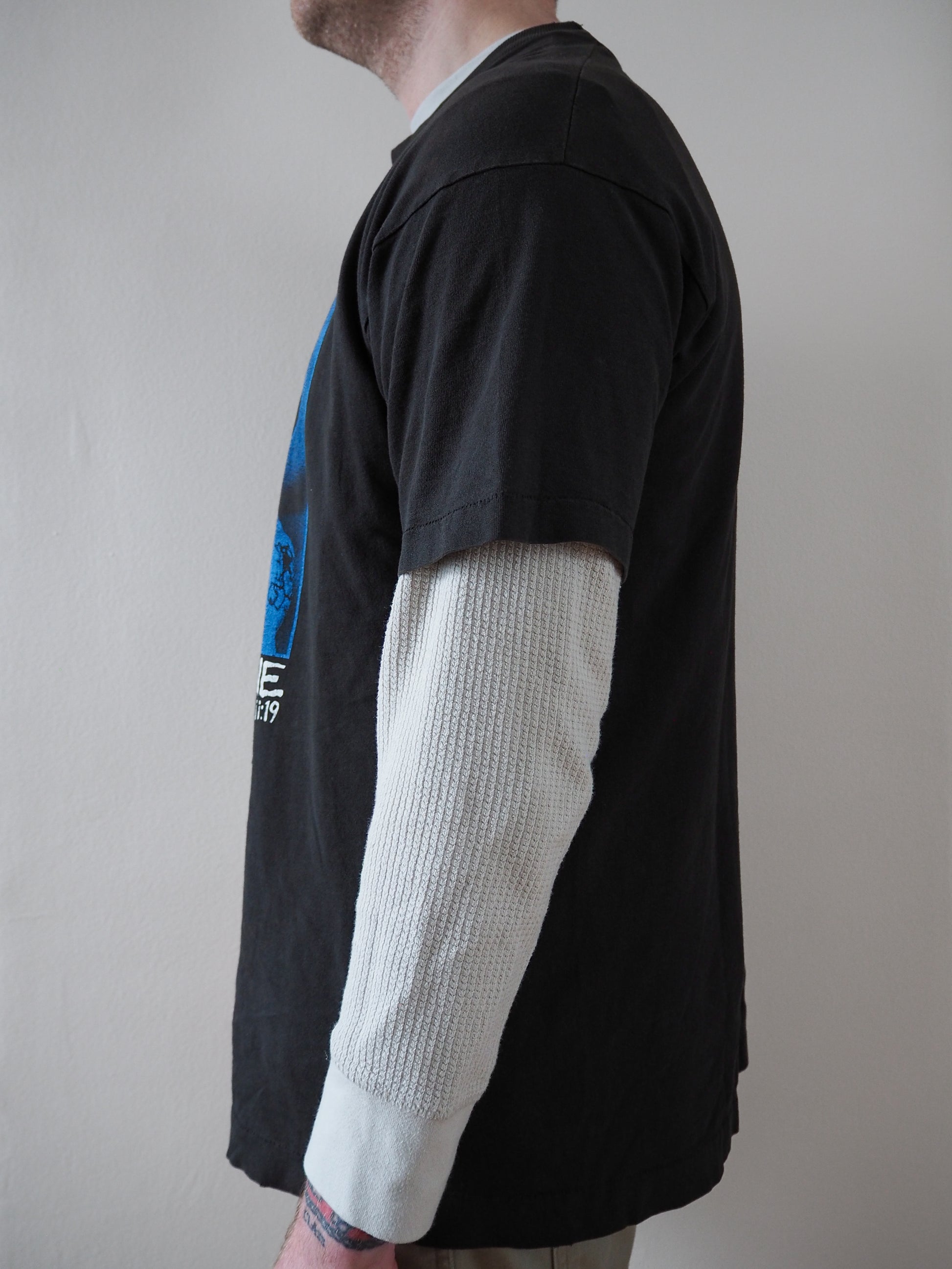 Printed on a Fruit of the Loom tagged XL. Great fade with a few pinholes scattered throughout. single stitched top and single stitched bottom.