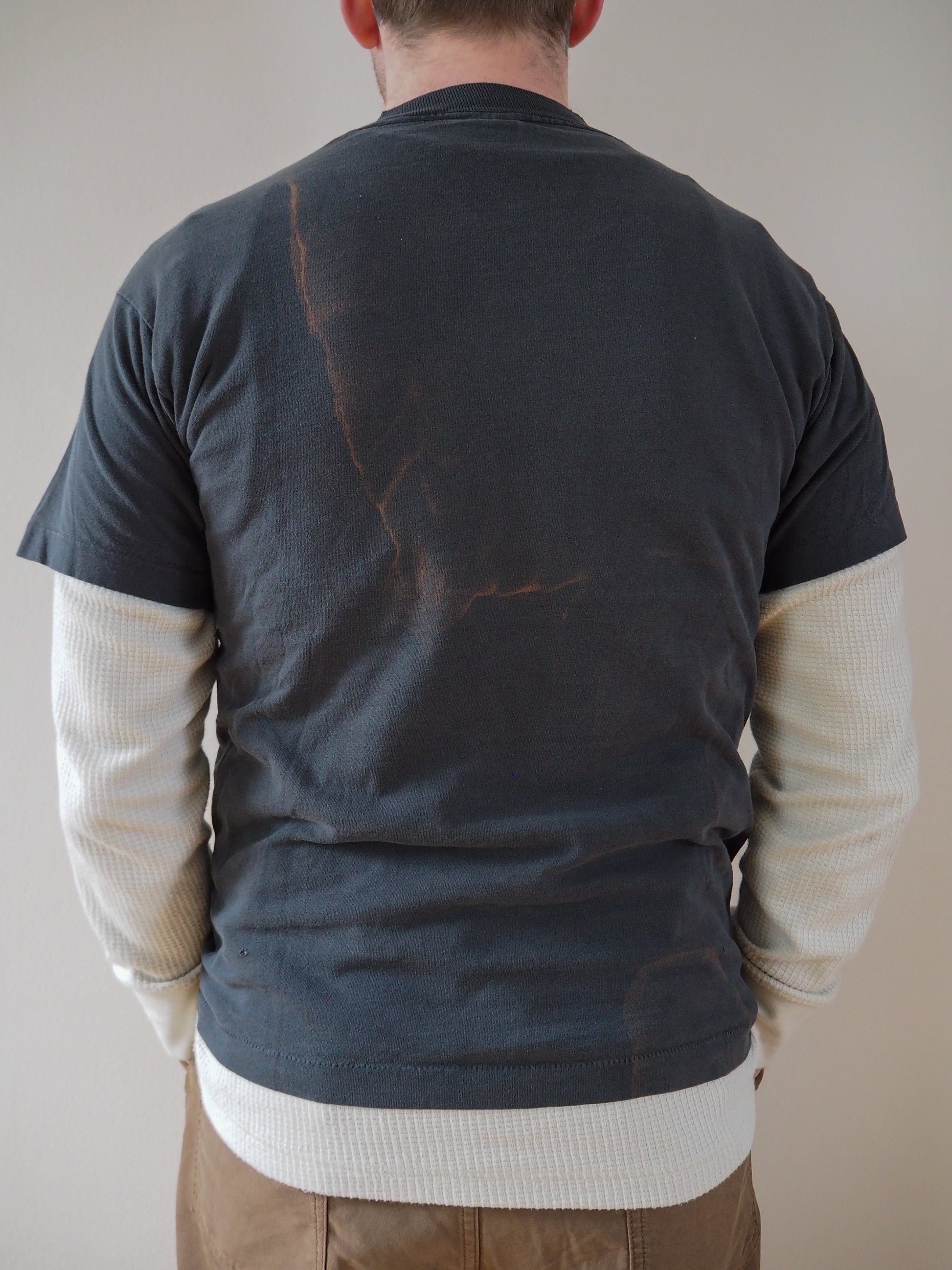 Printed on a 90s Fruit of the Loom tagged large. great fade with marks from some bleach staining throughout shirt. Single stitched top and single stitched bottom.