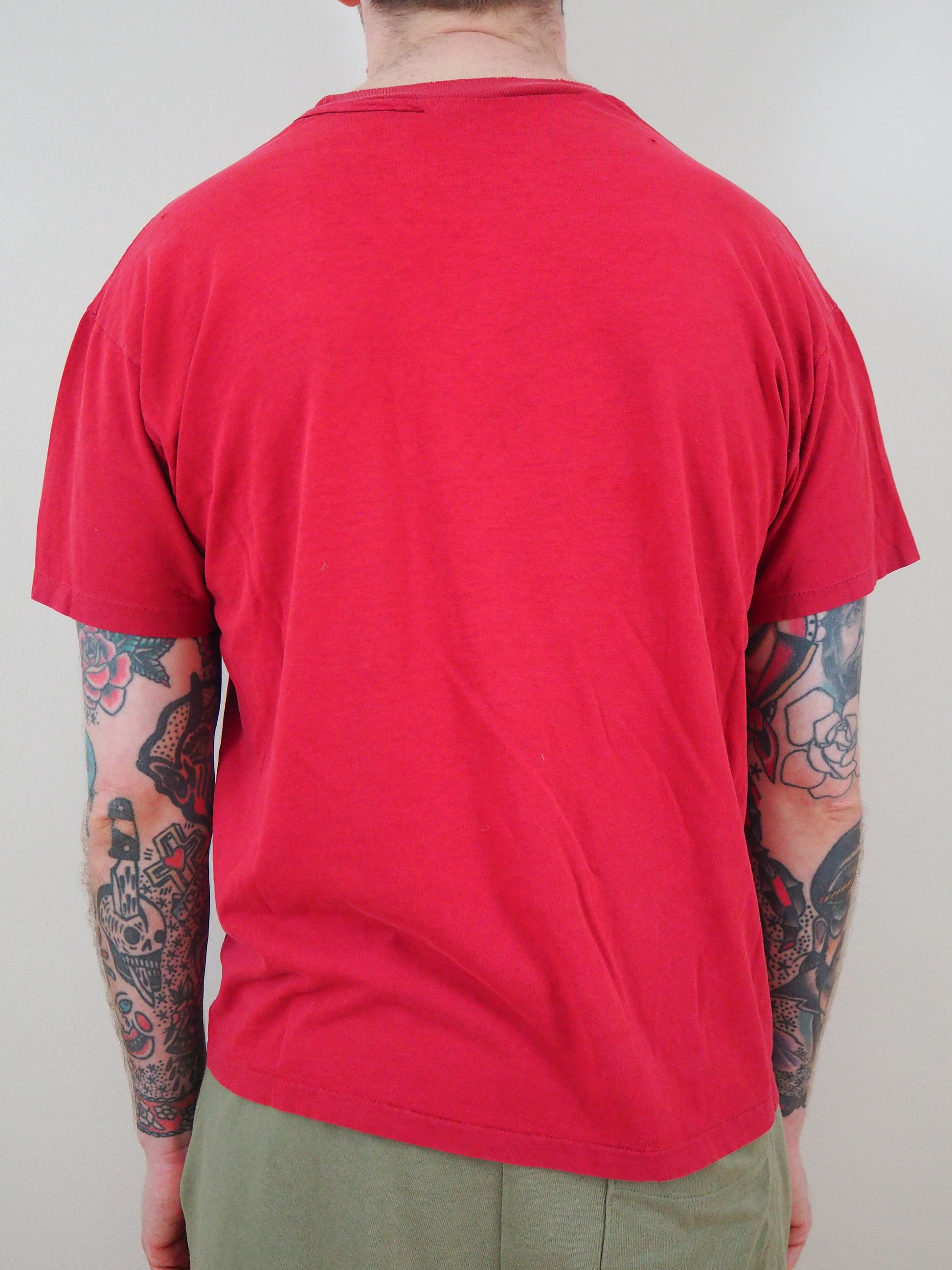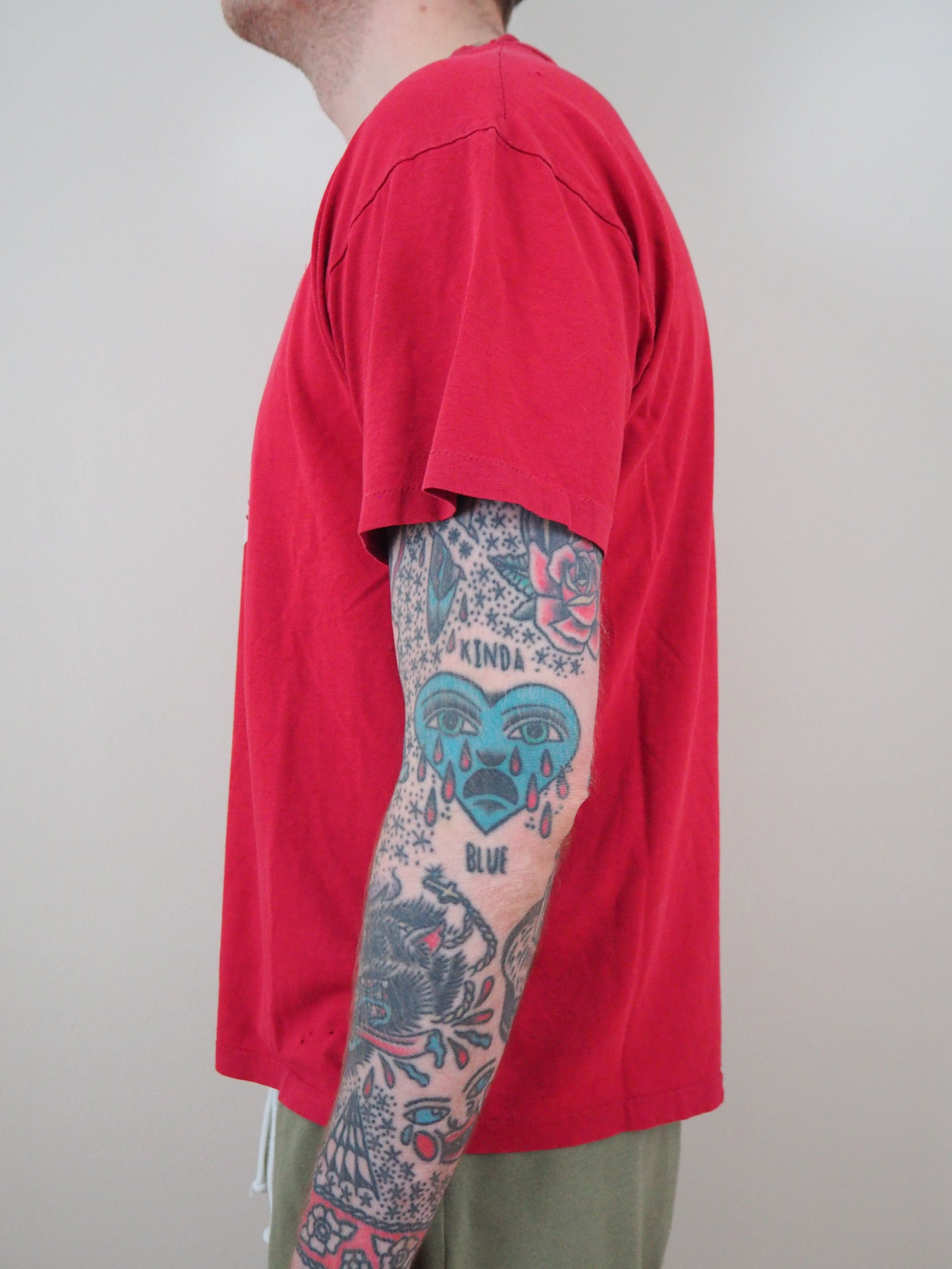 Printed on a cut tag. Thrashing throughout shirt with slight tear in collar. Sinle stitched top and single stitched bottom.