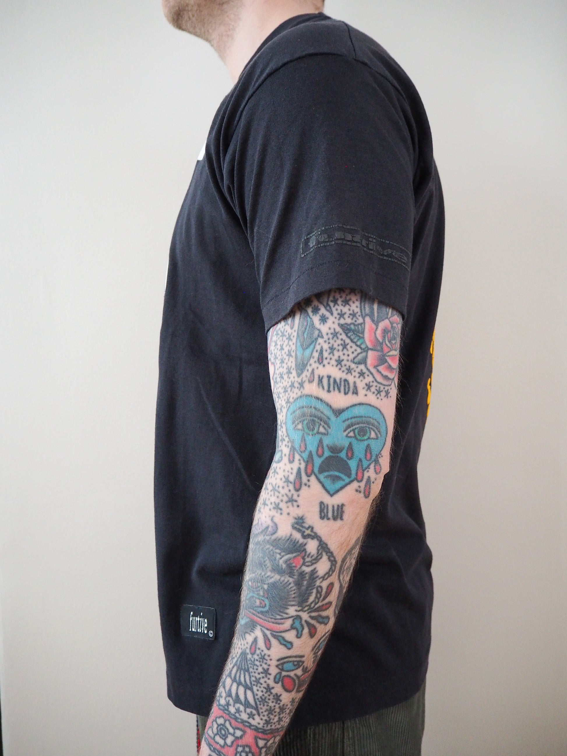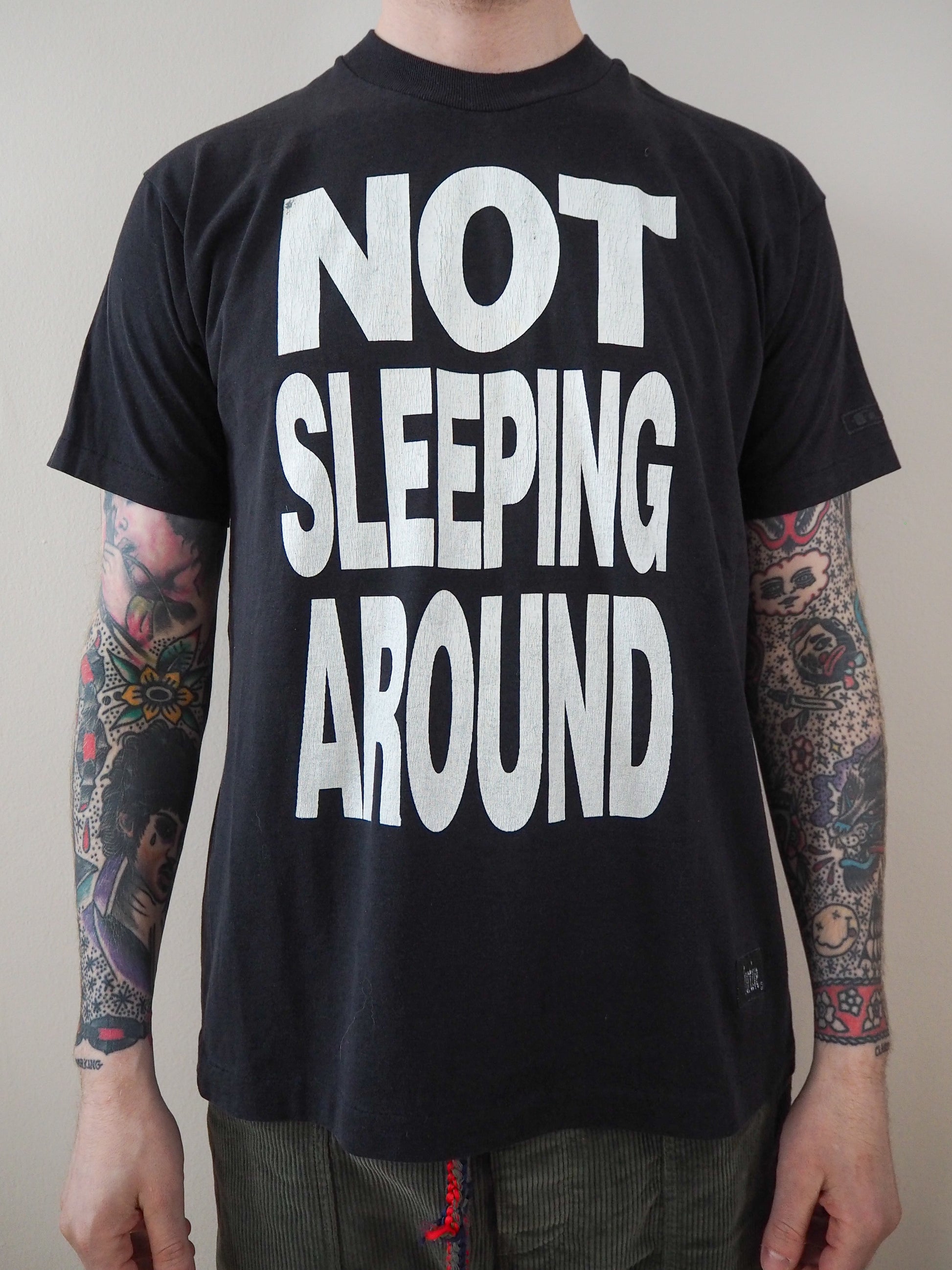 Printed on a cut tag. Cracking in the graphic. Single stitched top and single stitched bottom.