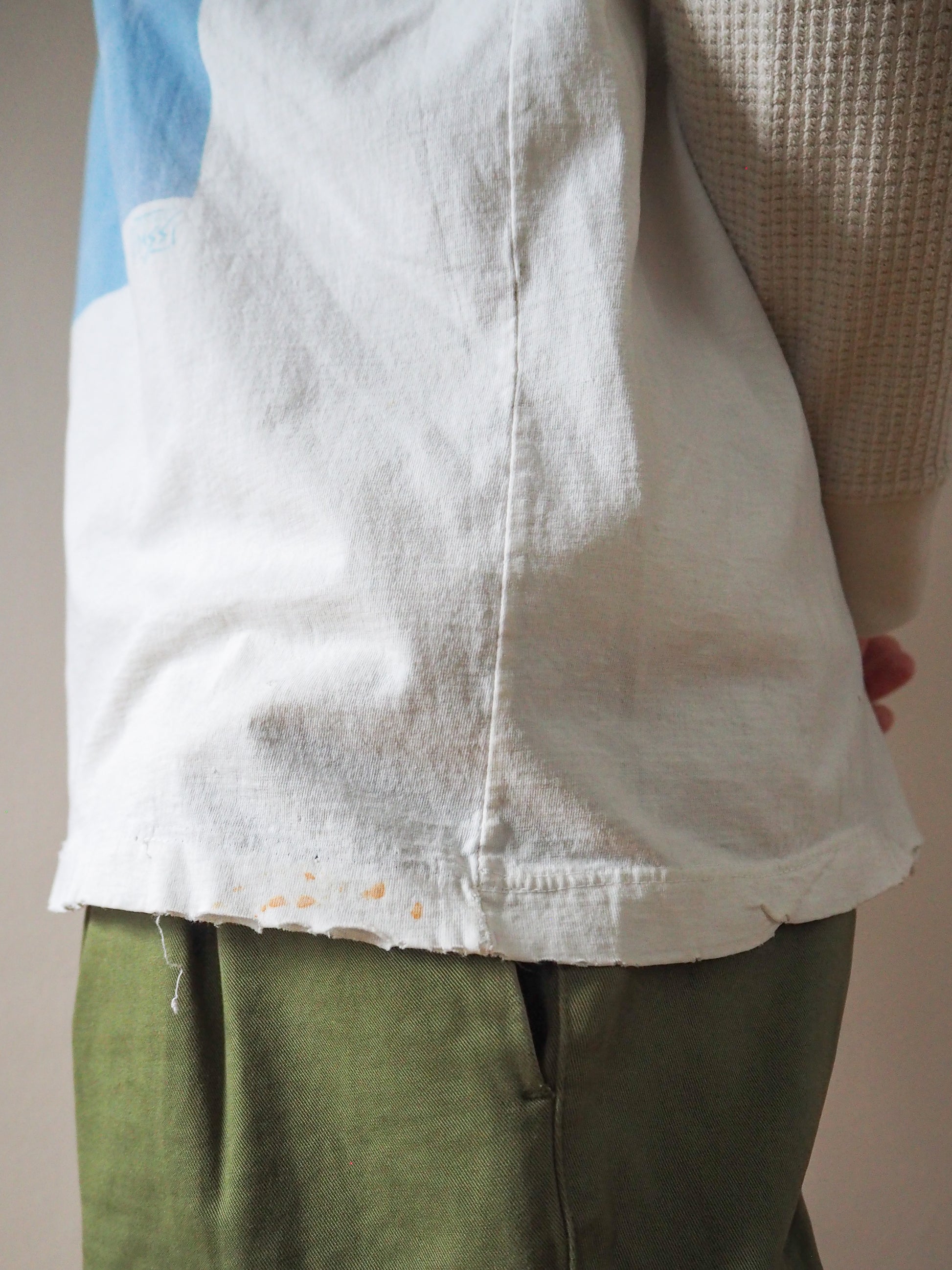 This is an item licensed by Backstage Pass for the release of the “Nevermind” album. Tagged an XL of a faded Australian tag. Has a number of pinholes, fraying on the color, staining on the back, and a loose seam. This is very worn in but beautiful nonetheless. Double stitched top and bottom.