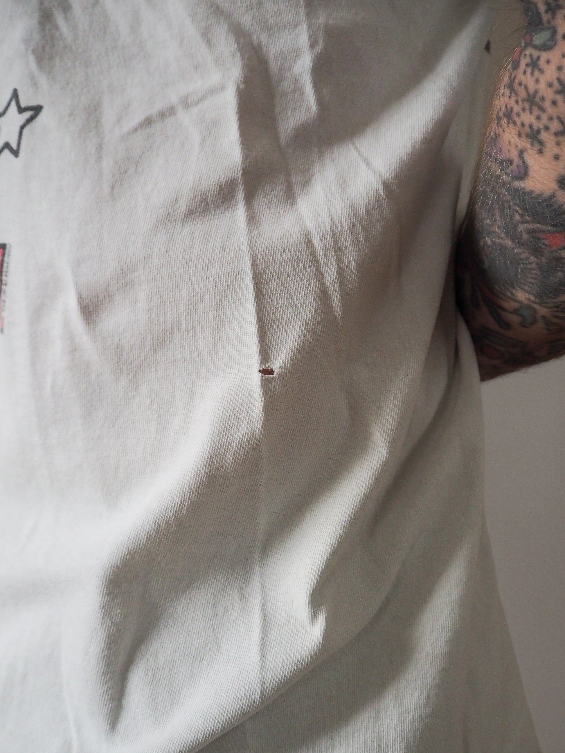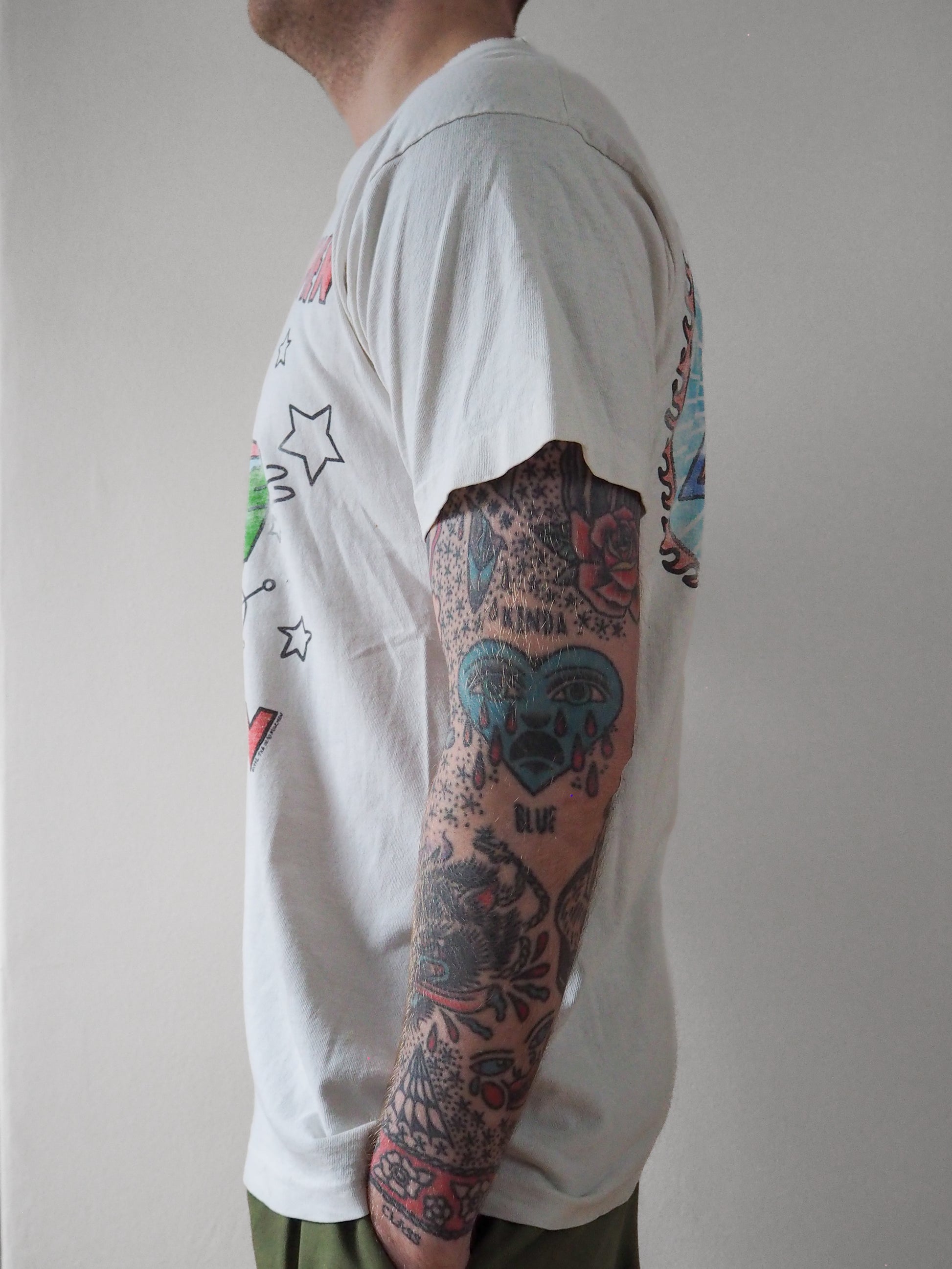Printed on a 90s Fruit of the Loom XL tag. This item has single stitching on top and bottom, this item has a great fade and worn in look with some light staining on color and front and back of shirt.