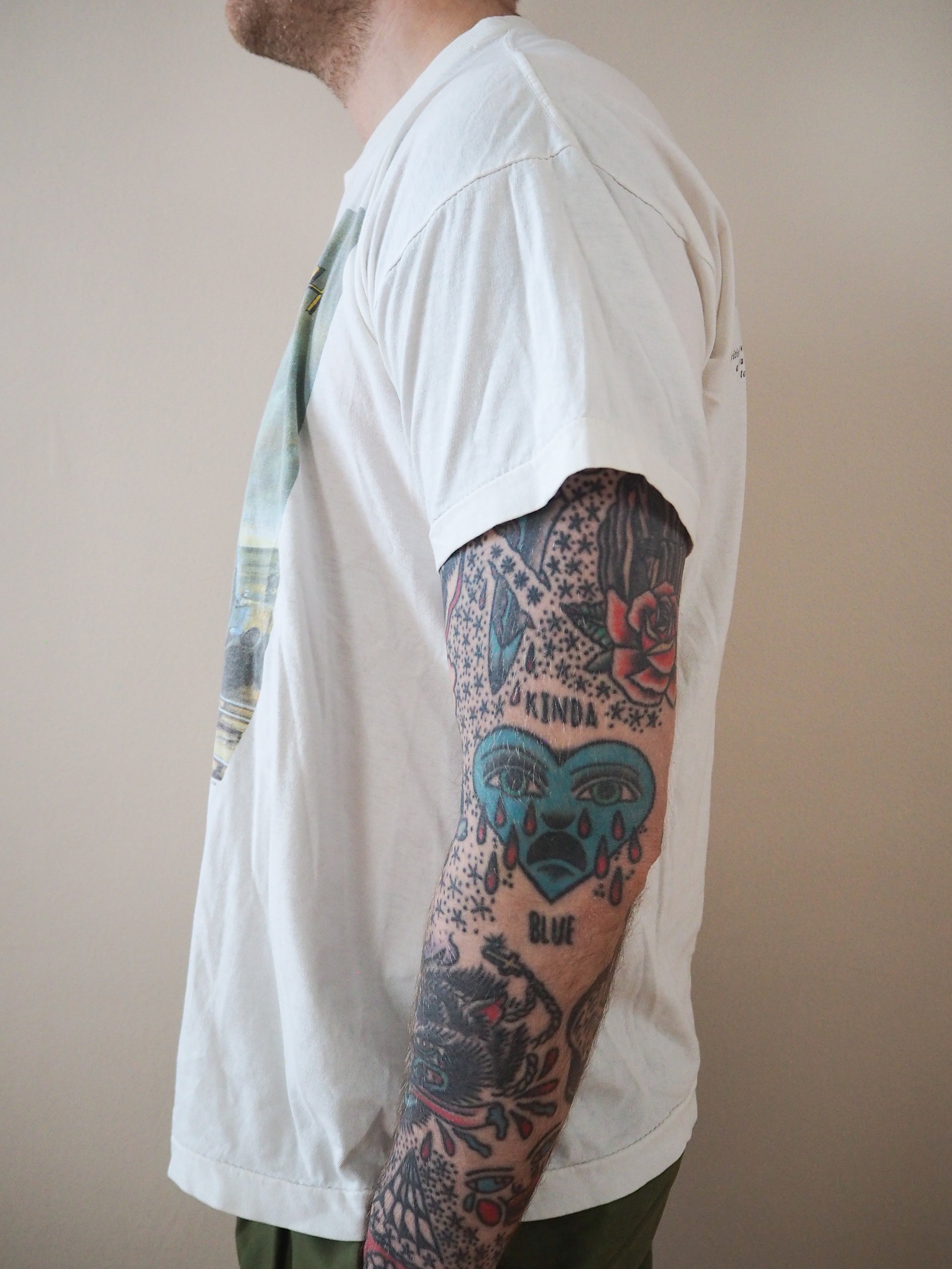 Faded euro tag. Great fade on tee and graphic. some pinholes throughout. Single stitched top and single stitched bottom.