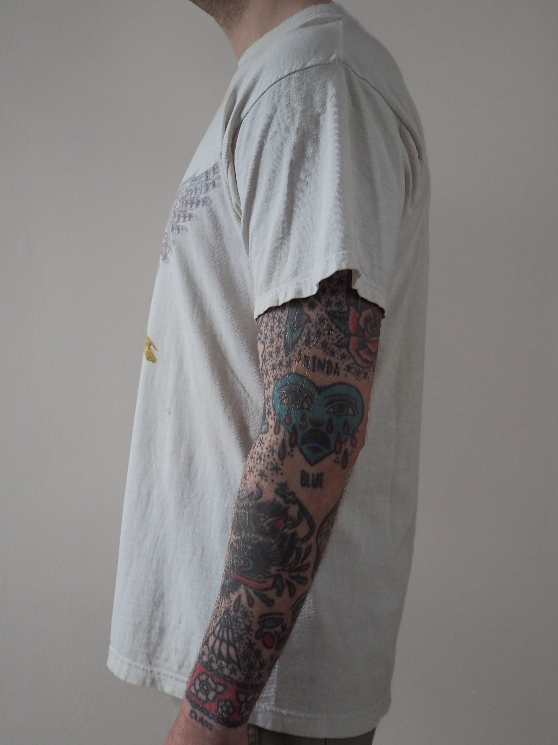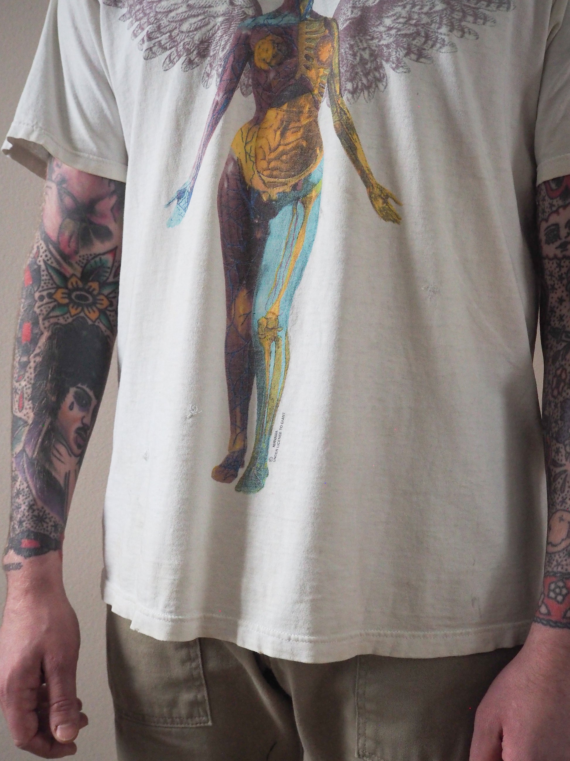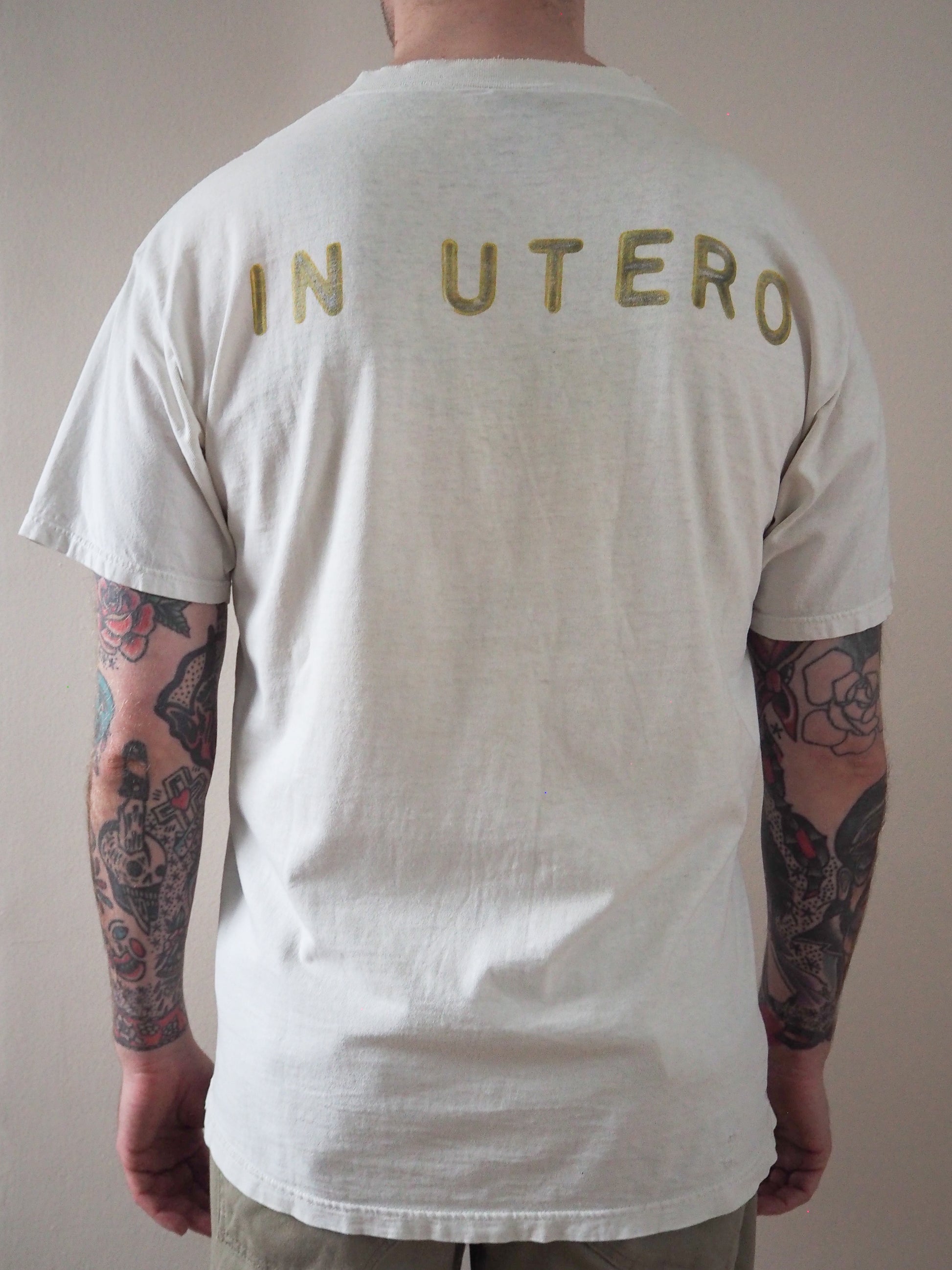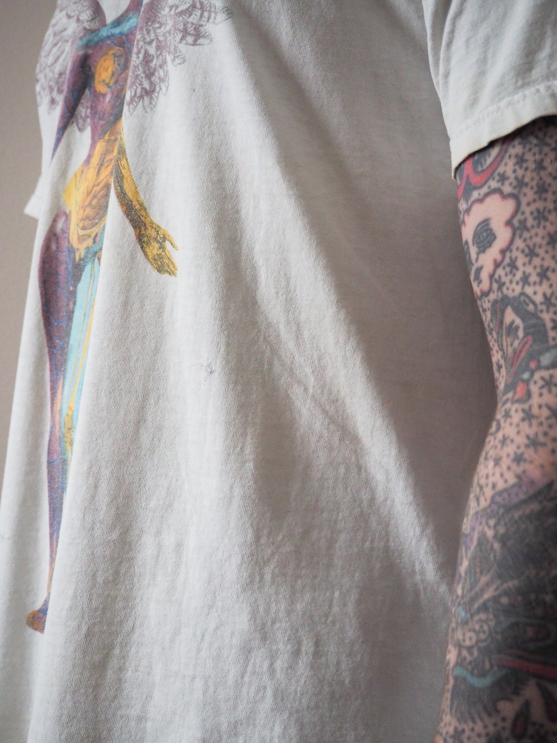 Licensed and printed on a Giant tagged XL. Double stitched to and bottom. Fraying on collar, hand done repairs, and some light staining thoroughout. A loved shirt for sure.
