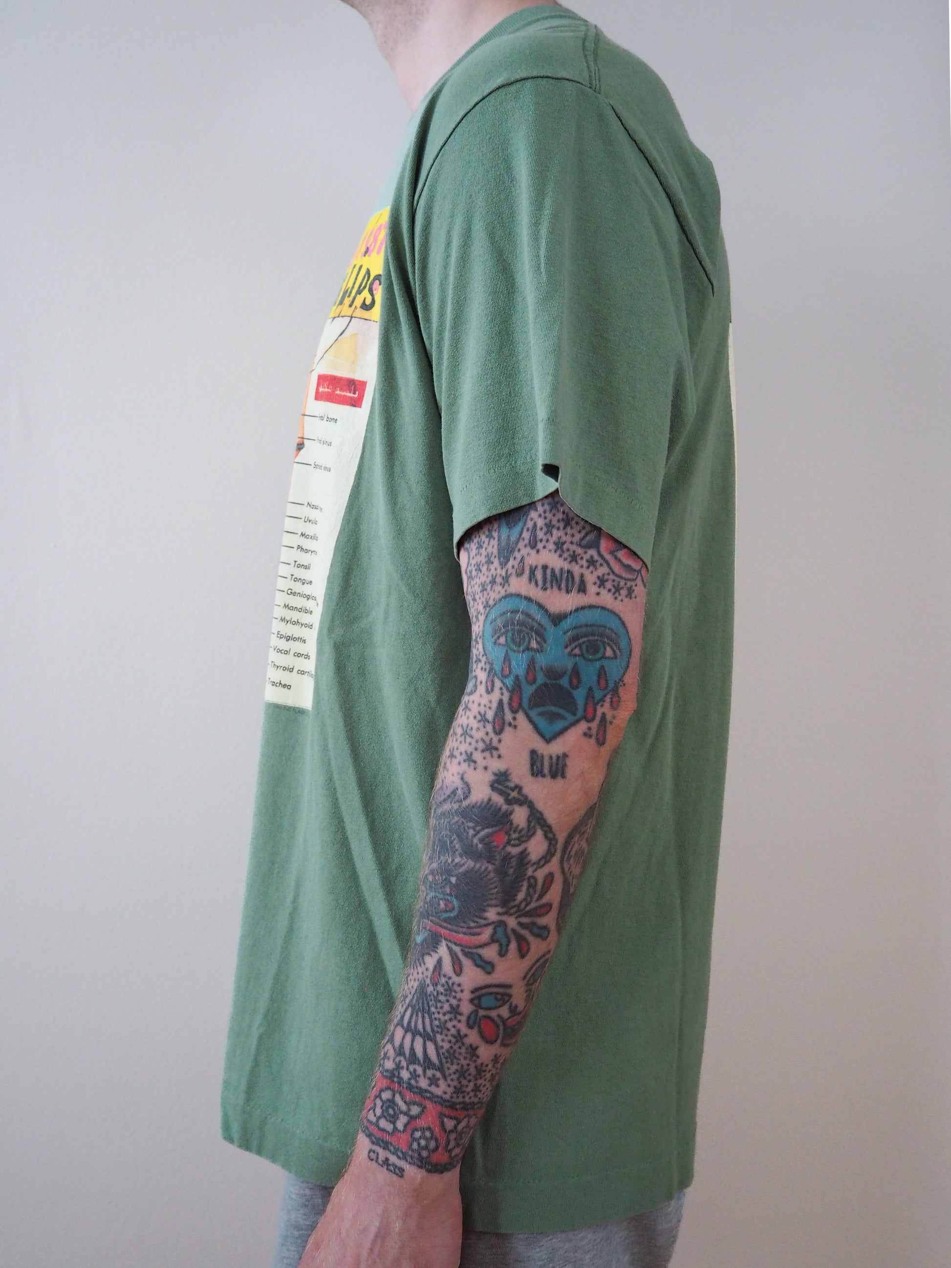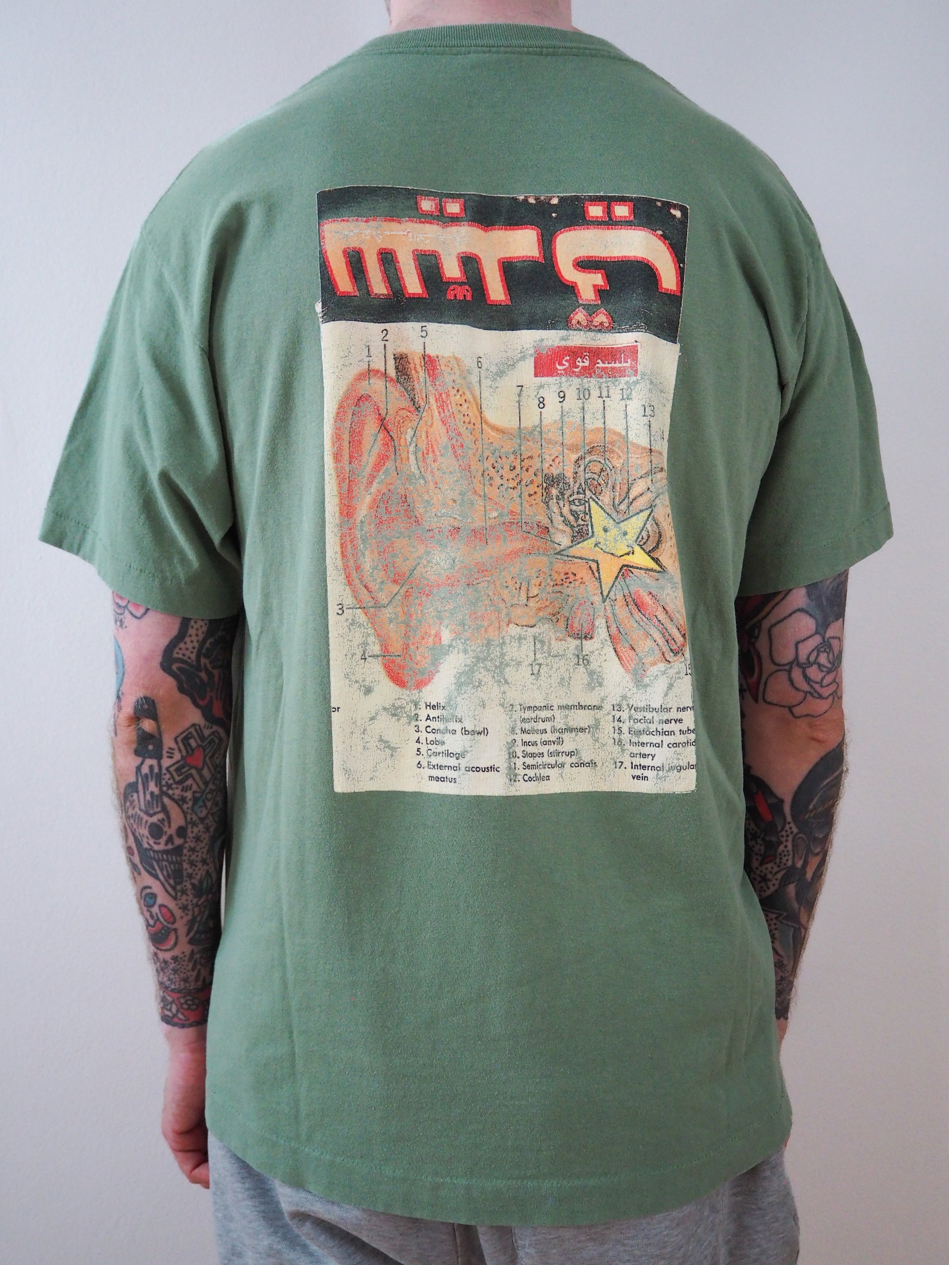 Printed on Softee tagged XL. Greeat fading on shirt and graphic as well as cracking. Single stitched top and single stitched bottom.