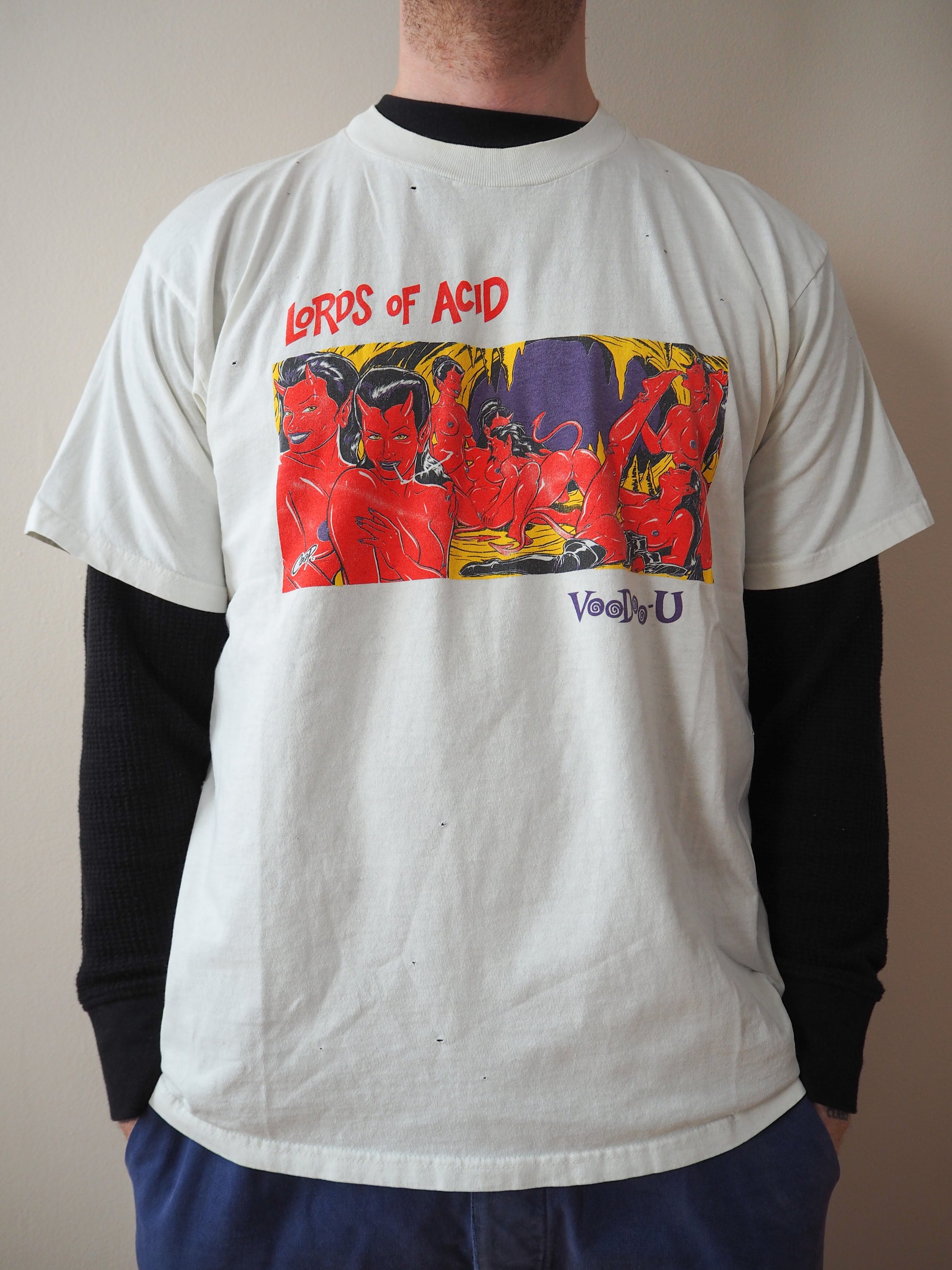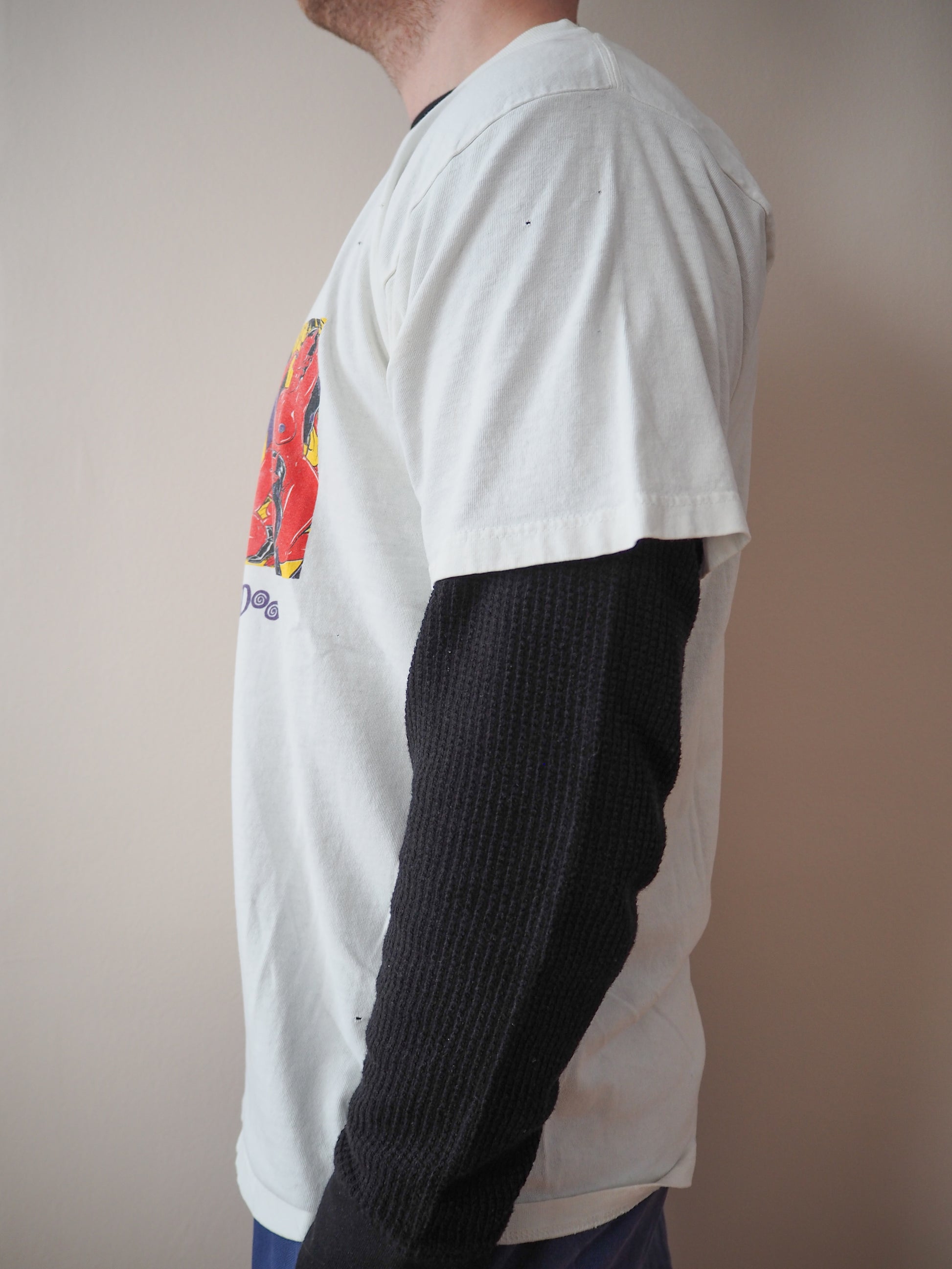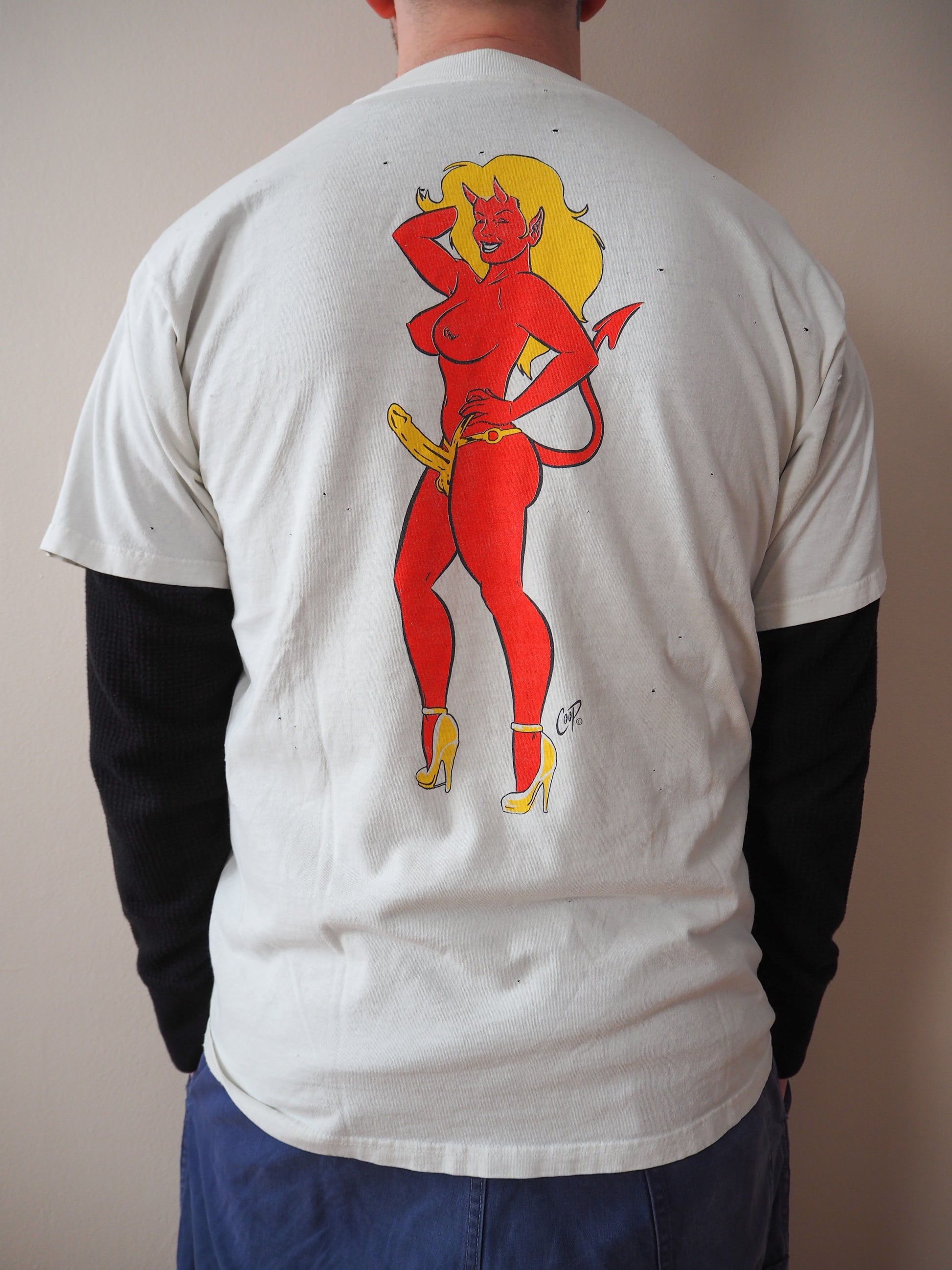 Printed on a Gildan Heavyweight tagged XL. Many scattered pinholes throughout wit some light staining. Double stitched top and double stitched bottom.