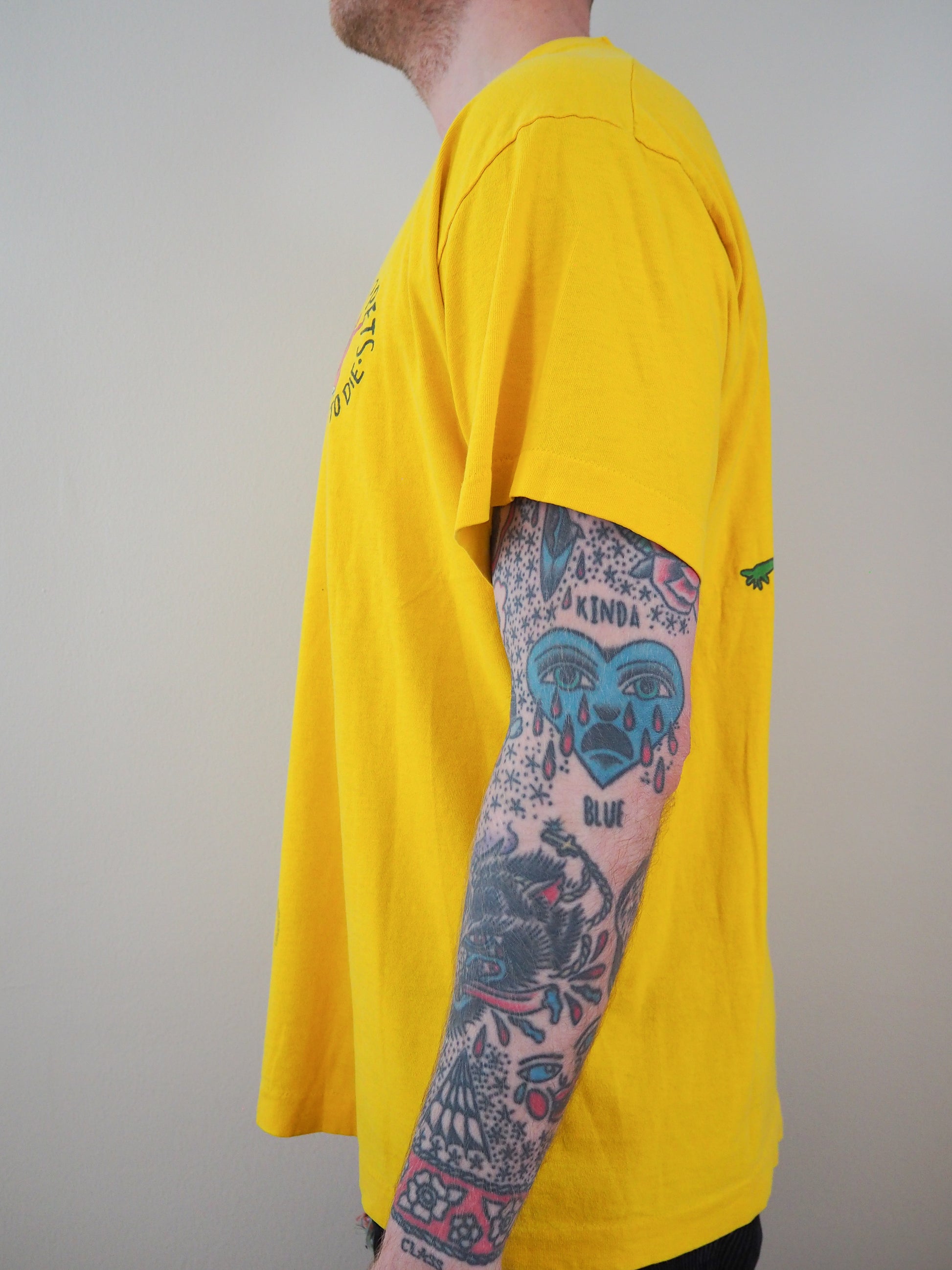Printed on a Fruit of the Loom tagged XL. Some stainng on the front. Good fade. Single stitched top and single stitched bottom.