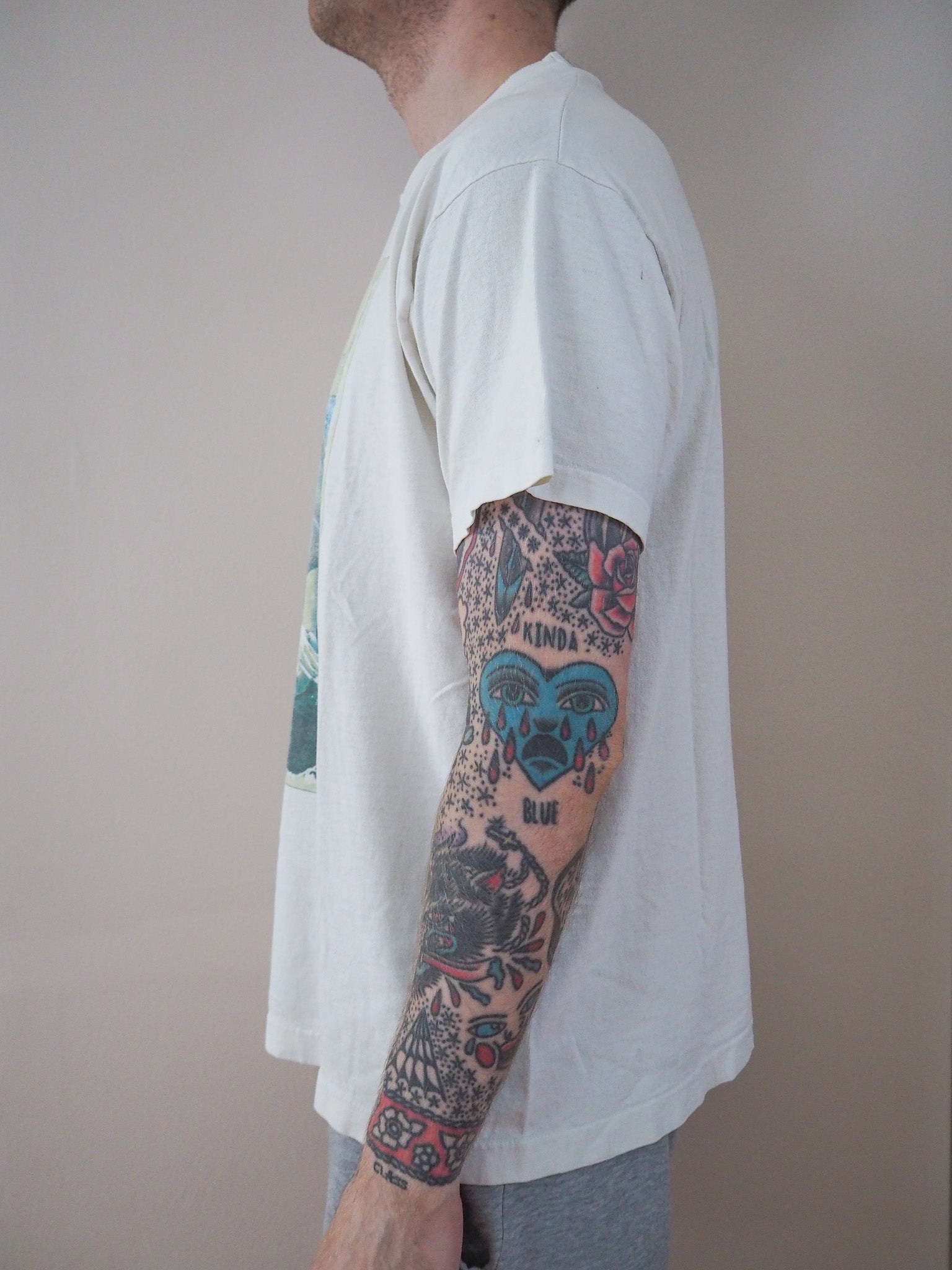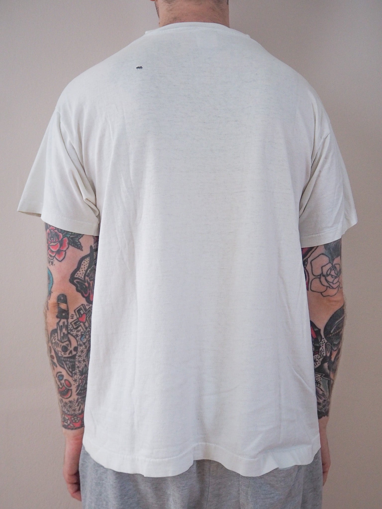 Printed on a XL Made in Canada tagged XL. Some light staining throughout. small hole in one pit. Fraying on the collar. A few pingoles and butter soft. Single stitched top and single stitched bottom.