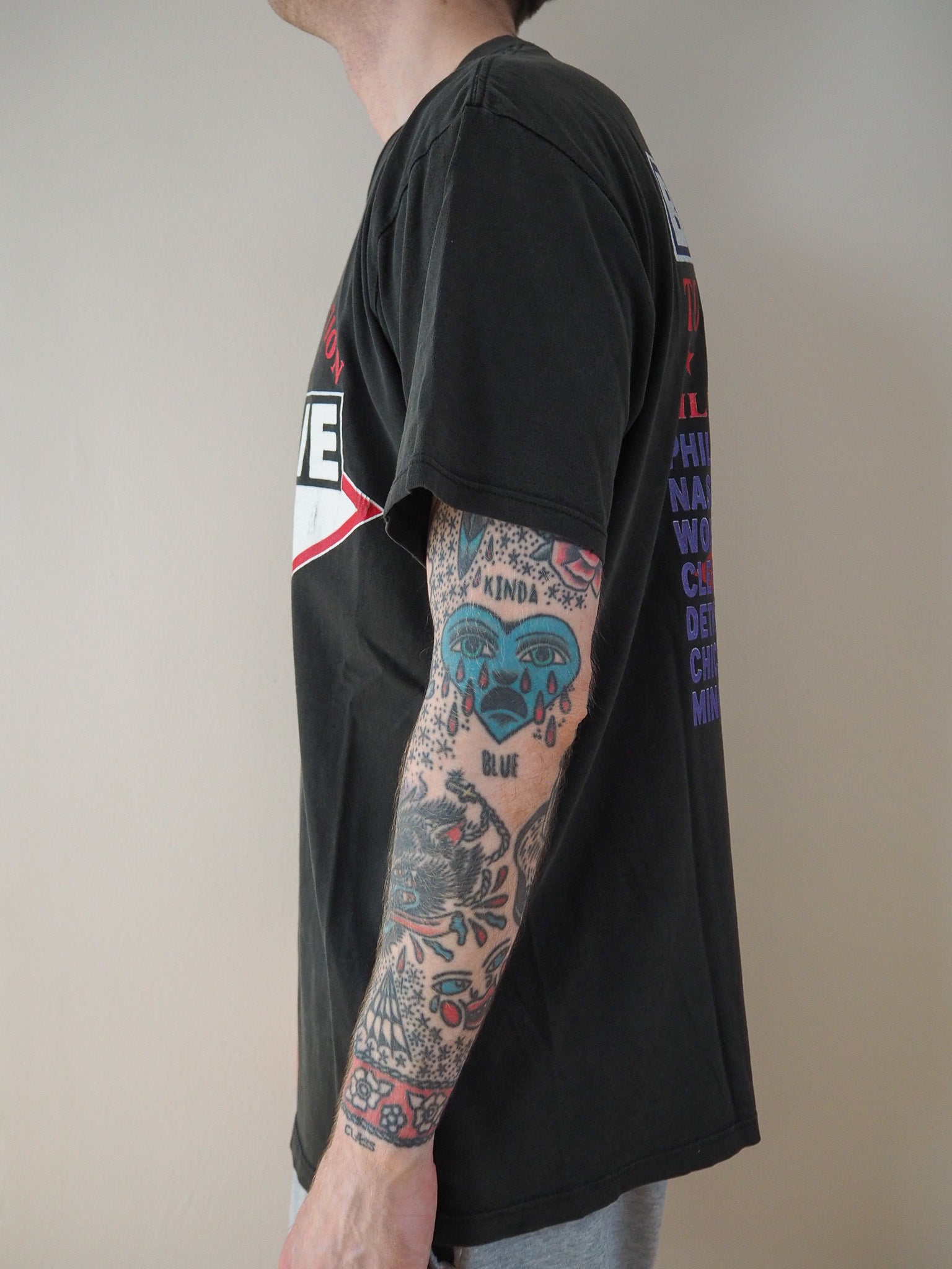 Printed on a fade out tag. Great fade on shirt and cracking on the graphic. Double stitched top and double stitched bottom.