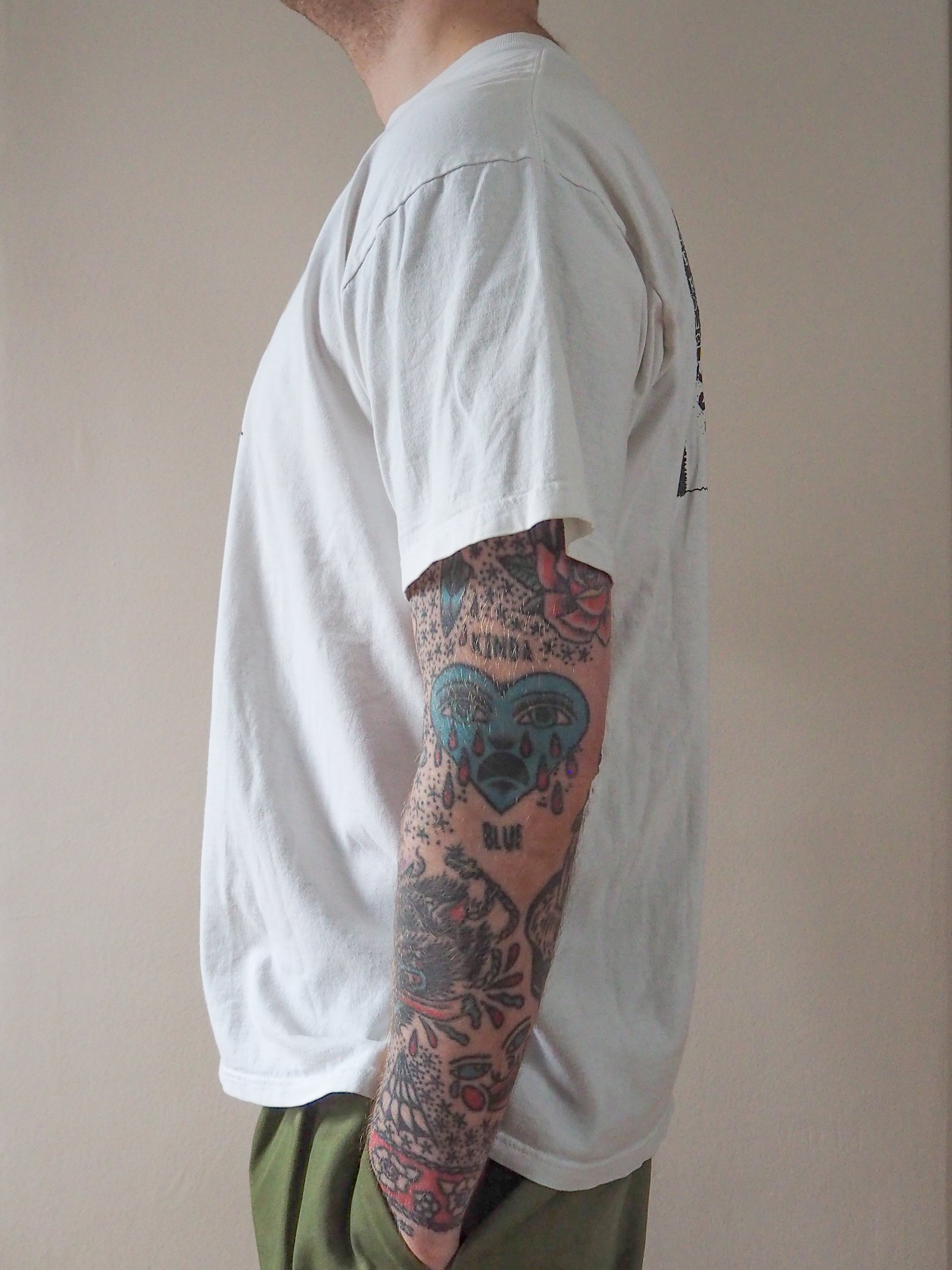 Licensed and printed on a Niceman tagged XL. Double stitched top and double stitched bottom. Shirt is in great condition with no some light staining just a light worn fade.