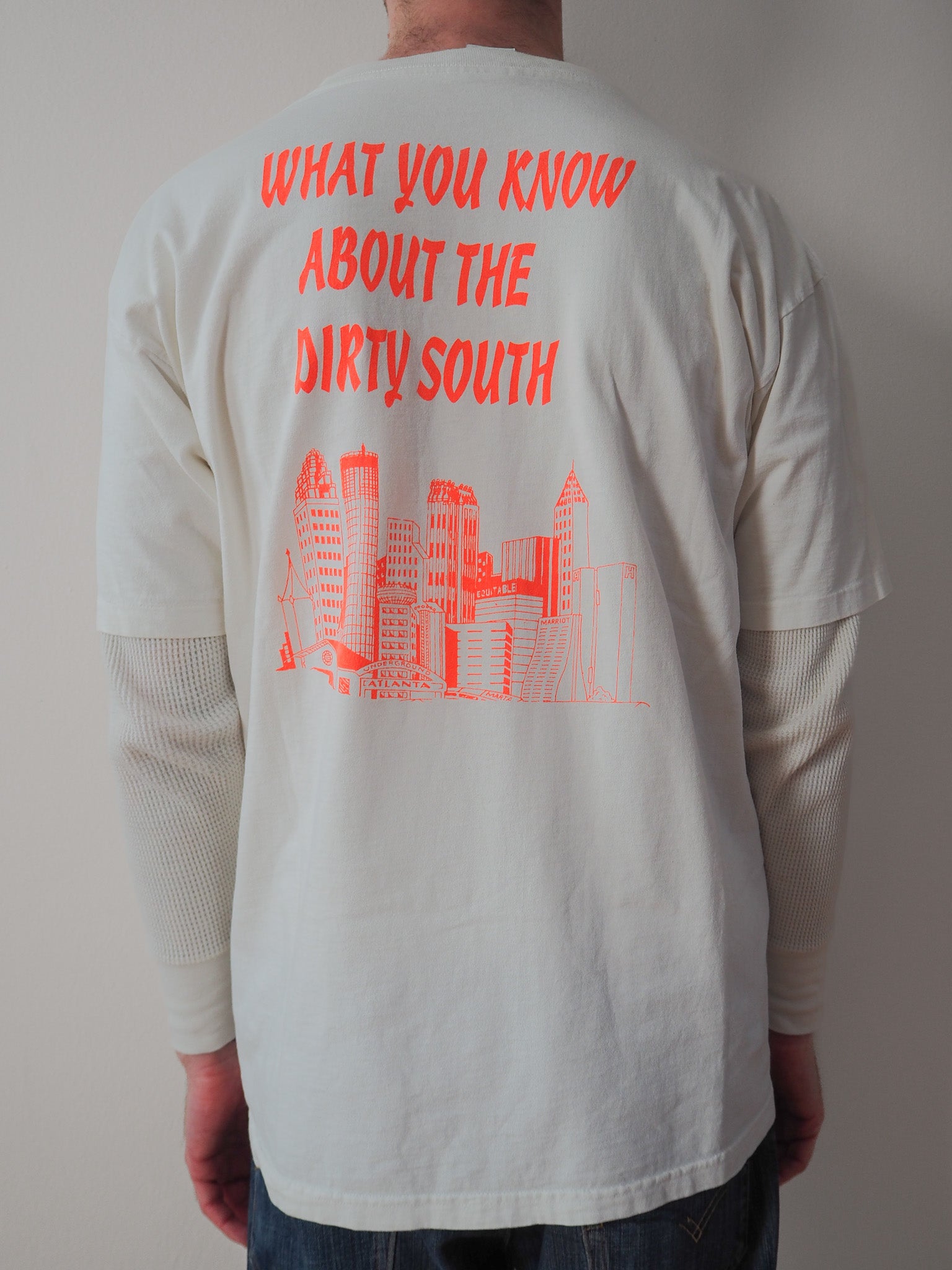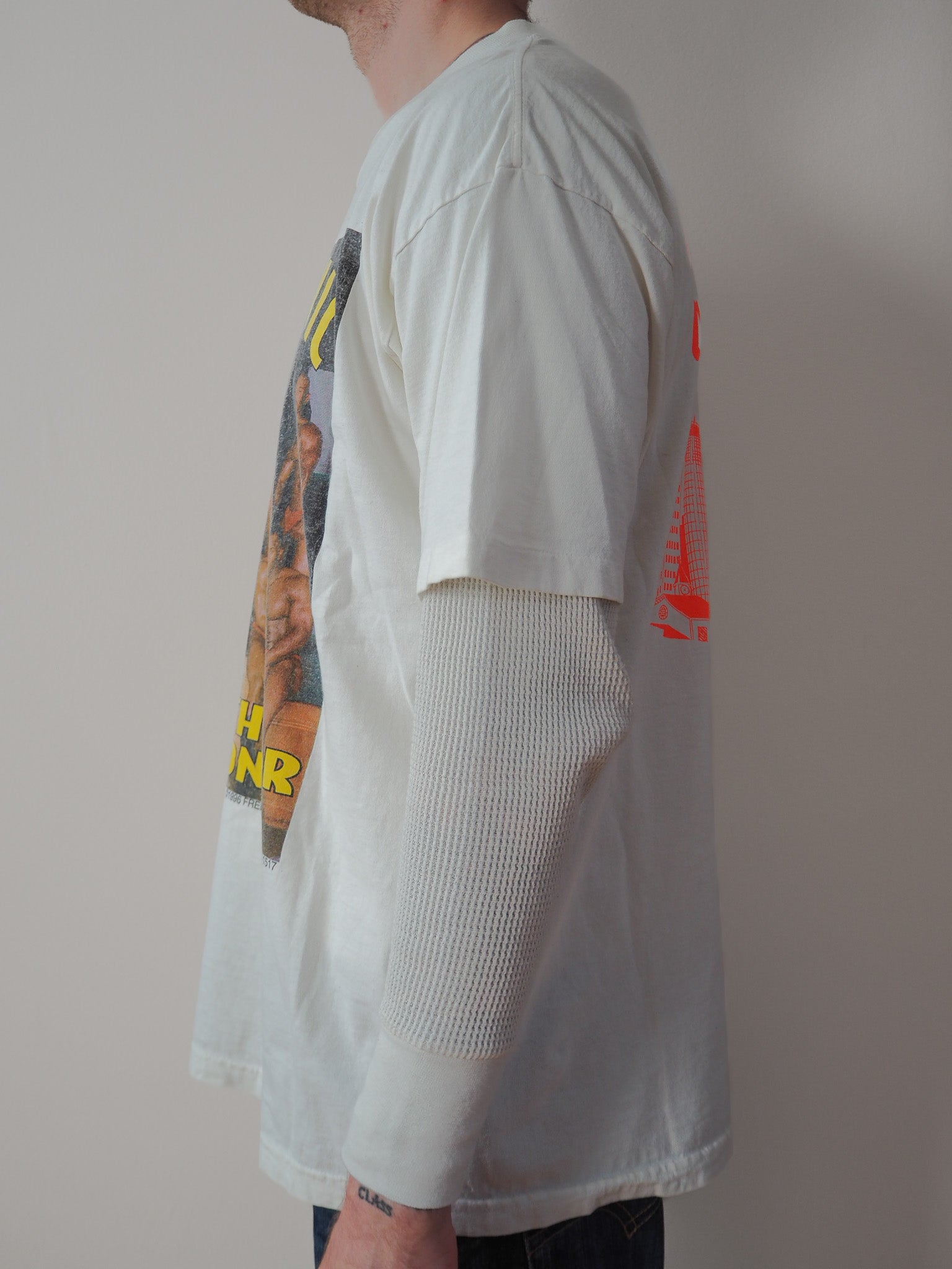 Printed on Reebok tagged XL. Some fading on shirt and cracking on graphic. Single stitched top and double stitched bottom.