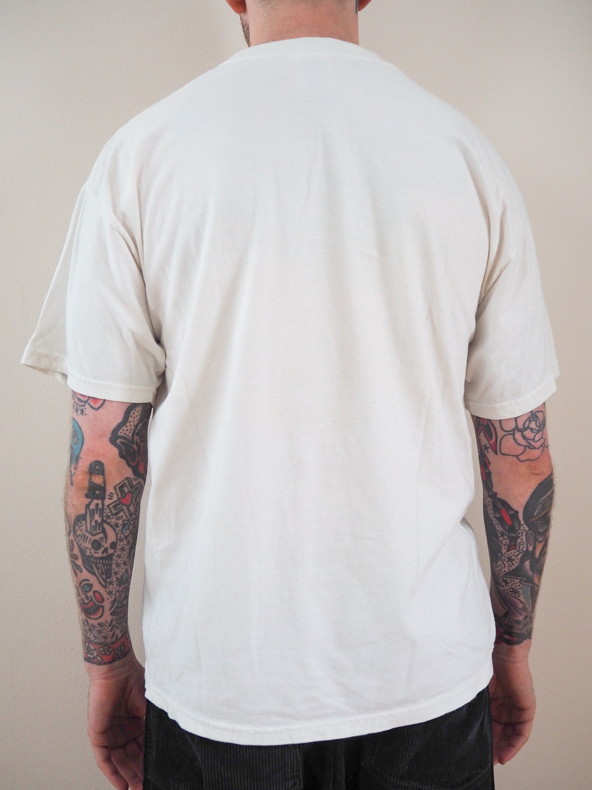Printed on a M and O knits tagged XL. Some staining and specles thoughout. Double stitched top and double bottom