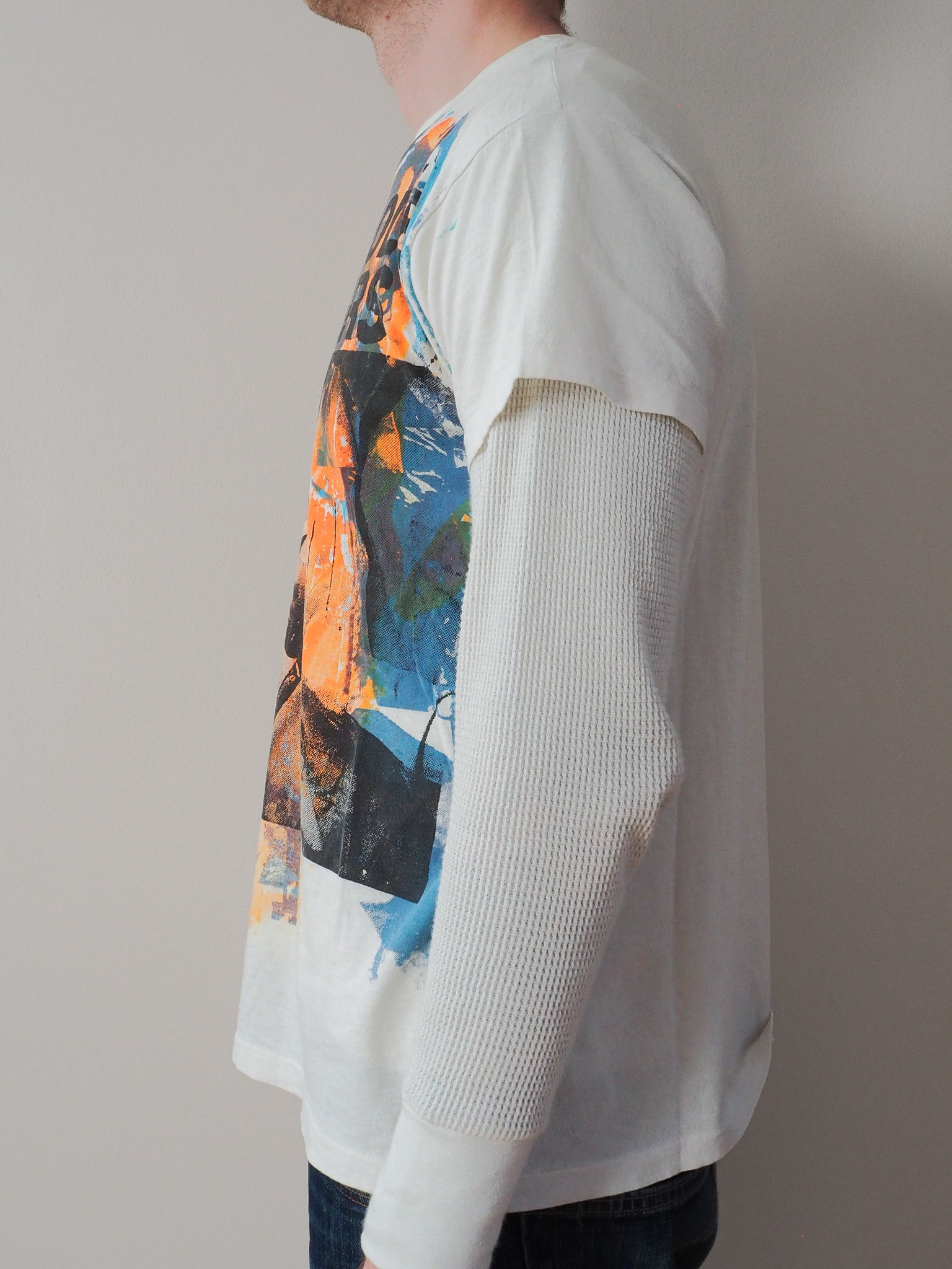 Printed on an 80s tagged large. Some fading and wear throughout blank. Single stitched top and single stitched bottom.