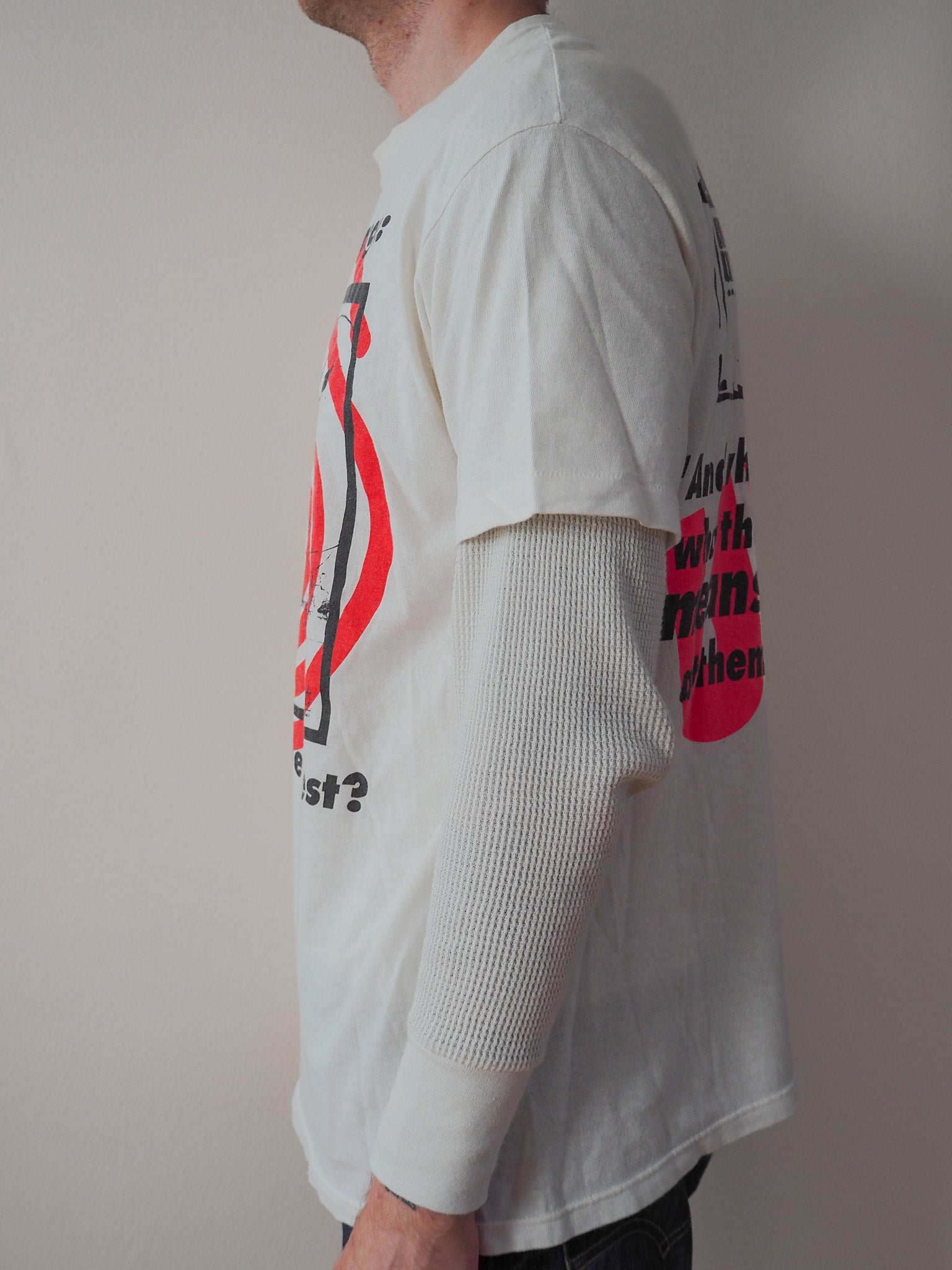 Printed on a 100% Hanes tagged XL. Some wear throughout graphic. Single stitched top and double stitched bottom.