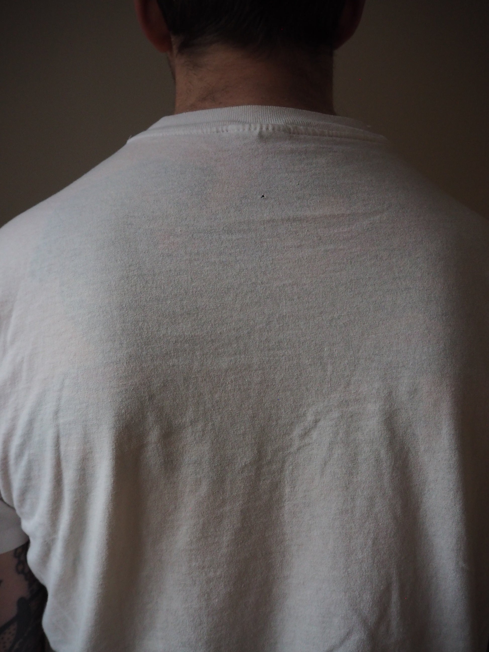 Faint yellowing throughout with some pinholes on back of shirt. Single-stitched sleeves and double-stitched bottom.