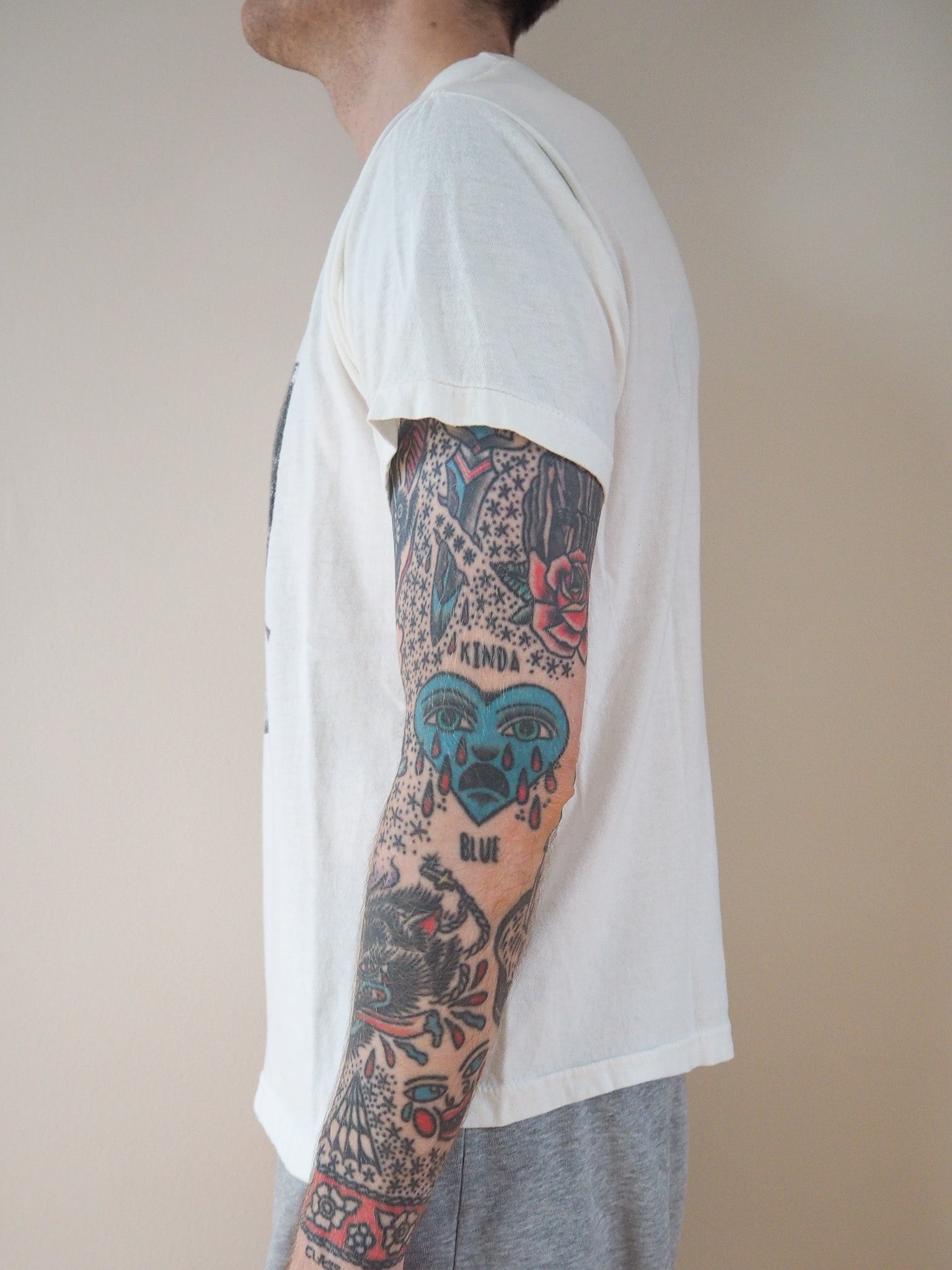 Printed on a 100% cotton tagged XL. Fading in graphic and minor wear across shirt. Single stitched top and single stitched bottom.