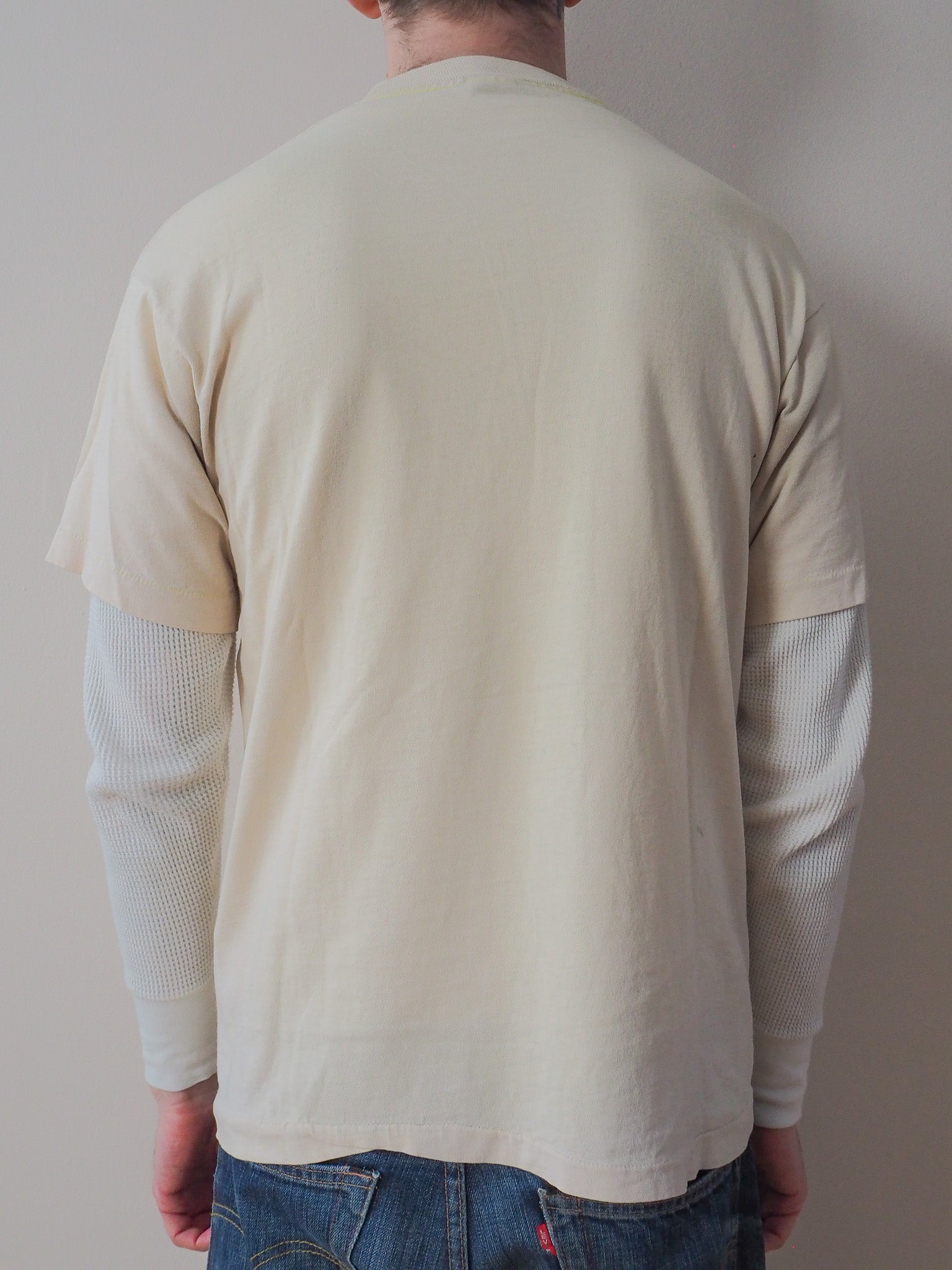 Printed on a Fruit of the Loom tagged large. Staining in pits. Single stitcehd top and single stitched bottom.