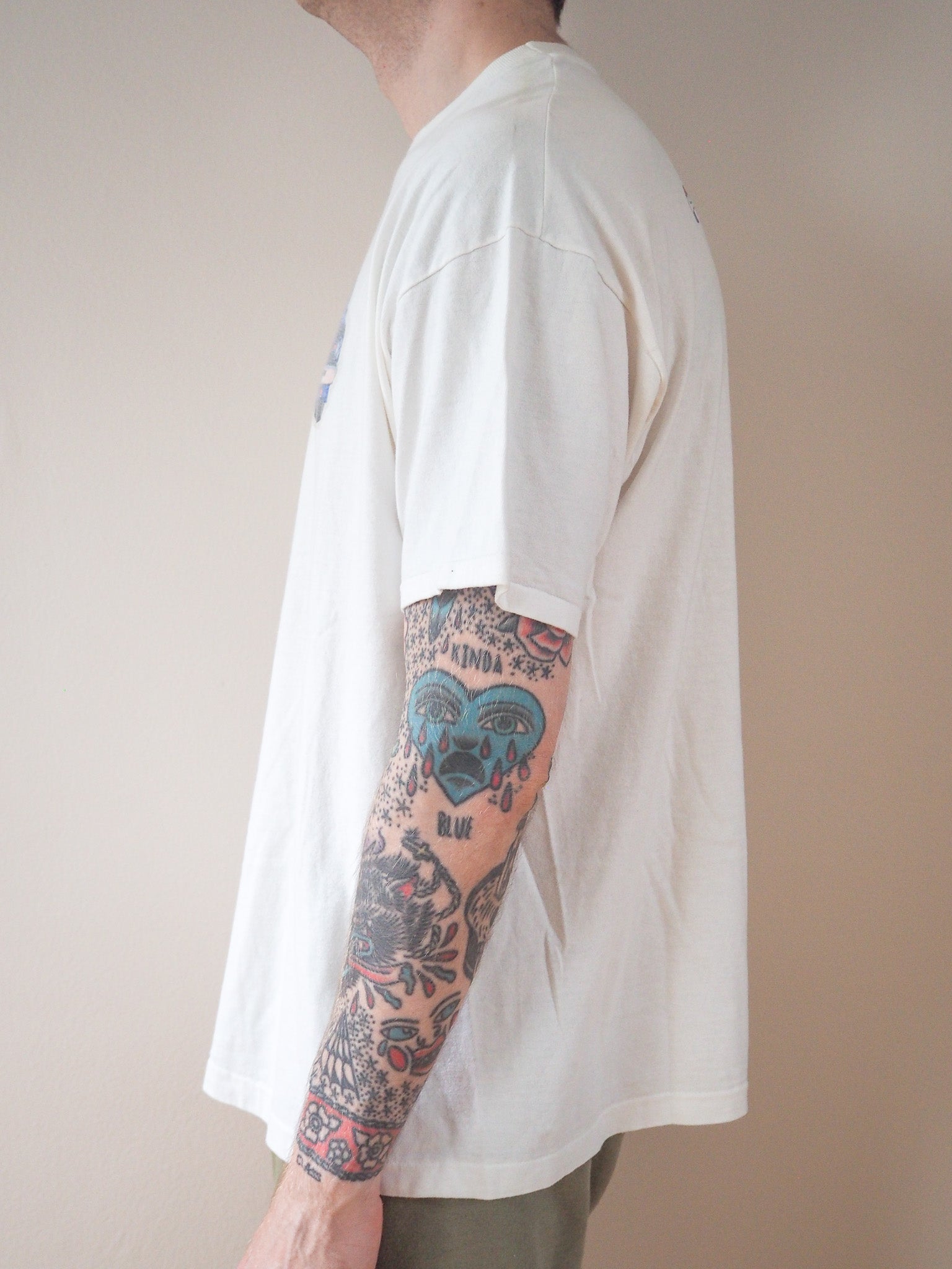 Printed on a Hanes Beefy tagged XL. Some light flaws throuhgout and a good fade. Single stitched top and single stitched bottom.