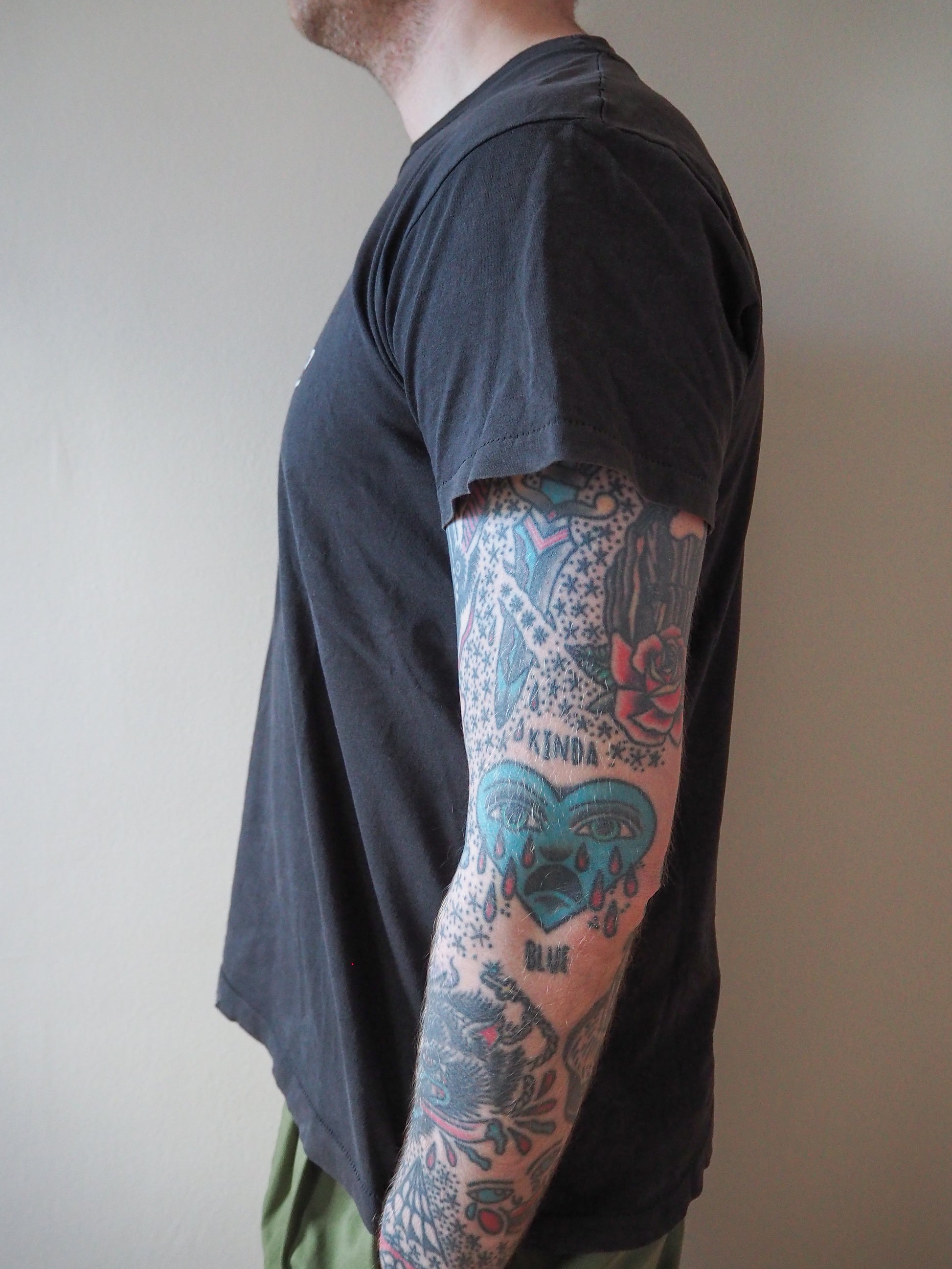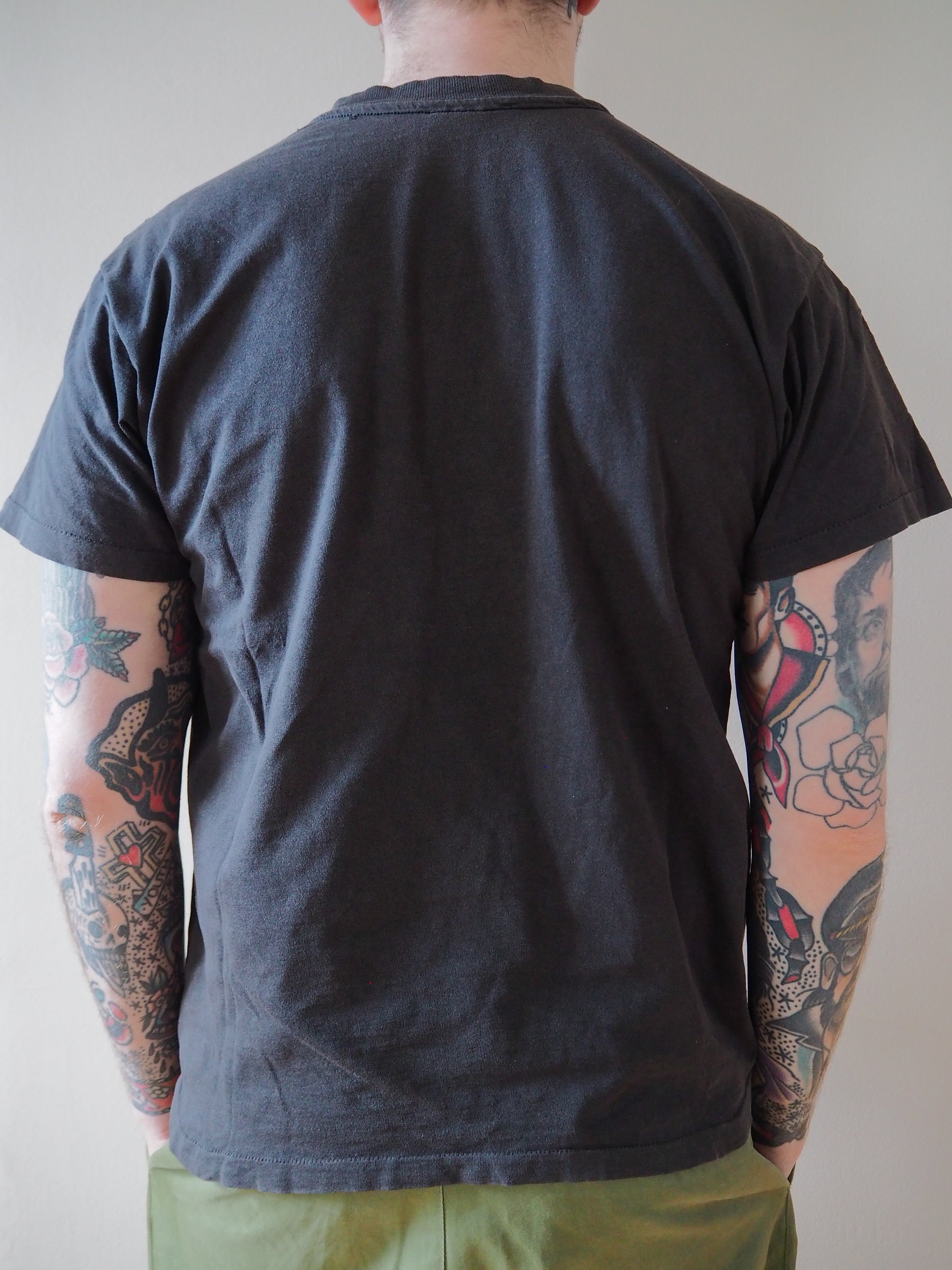 Printed on a early 90s Hanes tagged large. Holes in collar ad pits. Fading on shirt. Single stitched top and single stitched bottom.