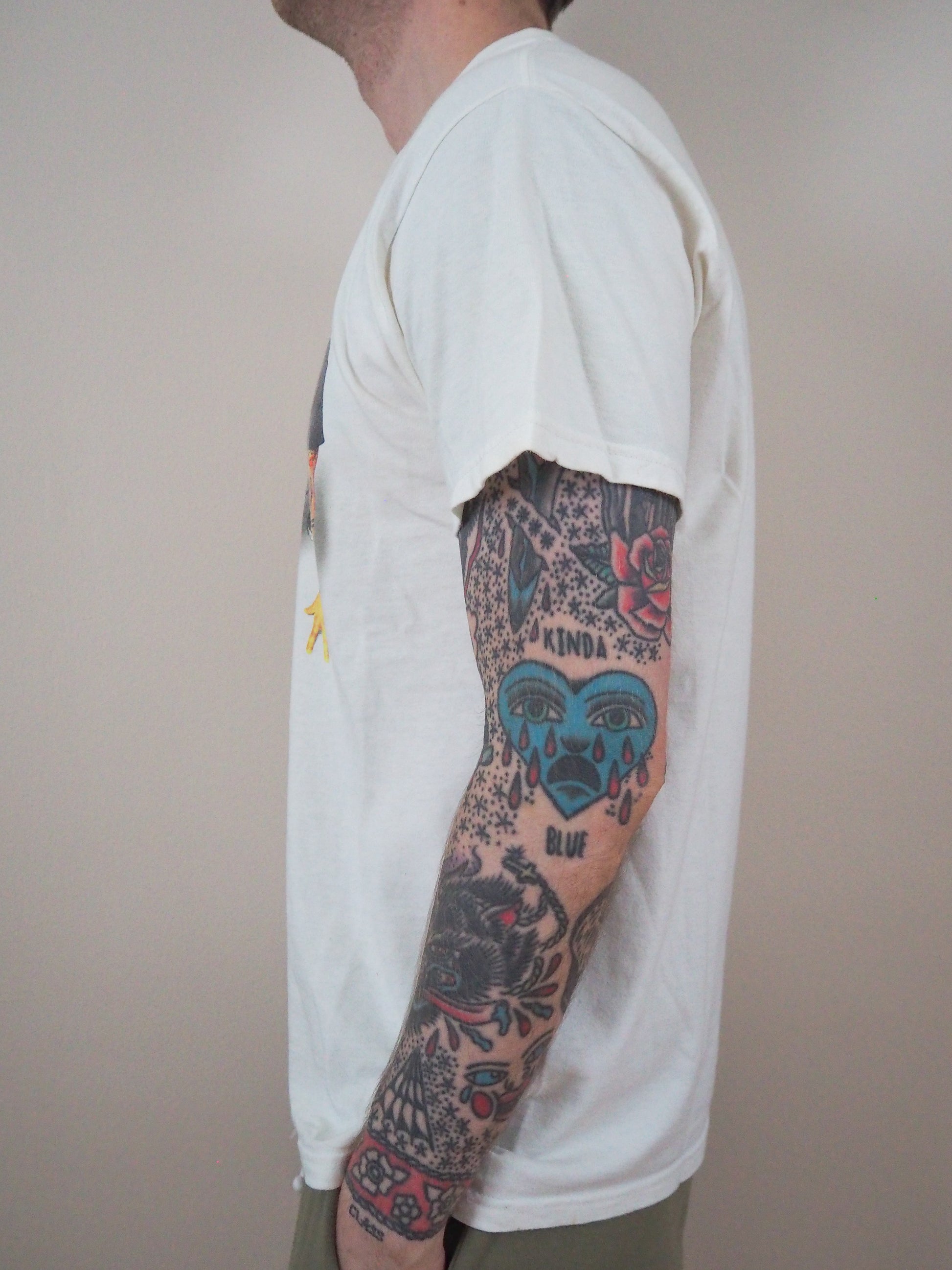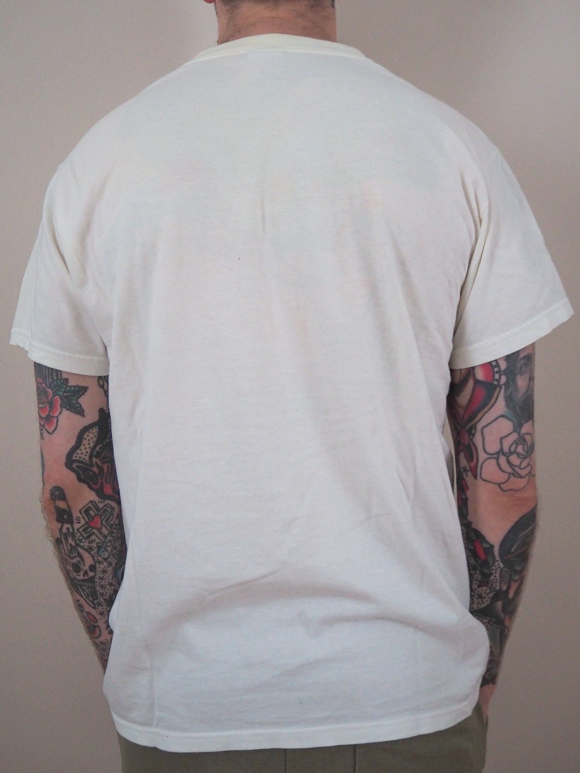 Printed on cotton Delux tagged large. Some heavy yellowing thoughout tee. Double stitched top and double stitched bottom.