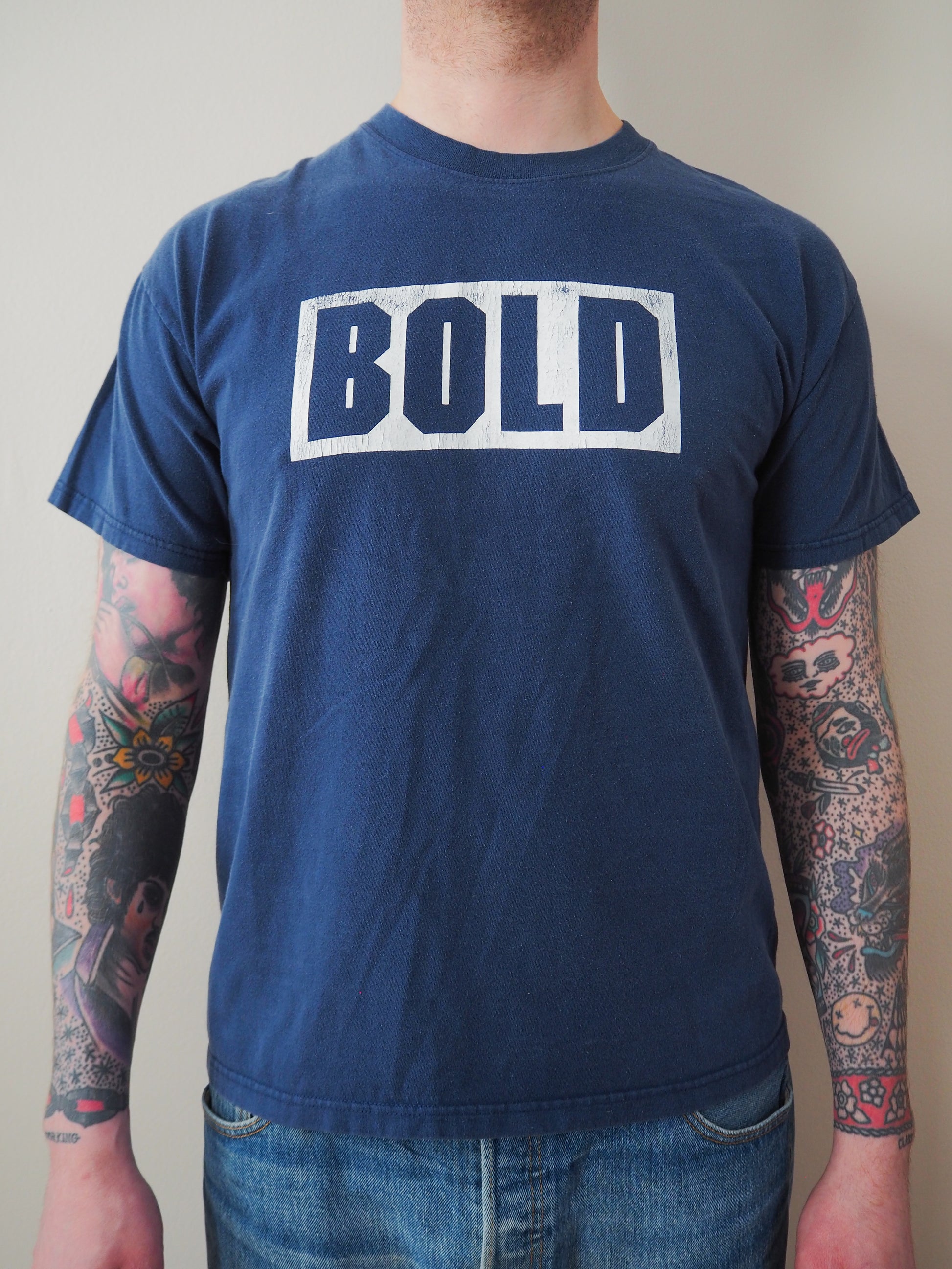 Cut tag. Cracking and faded graphic. Double stitched top and double stitched bottom.