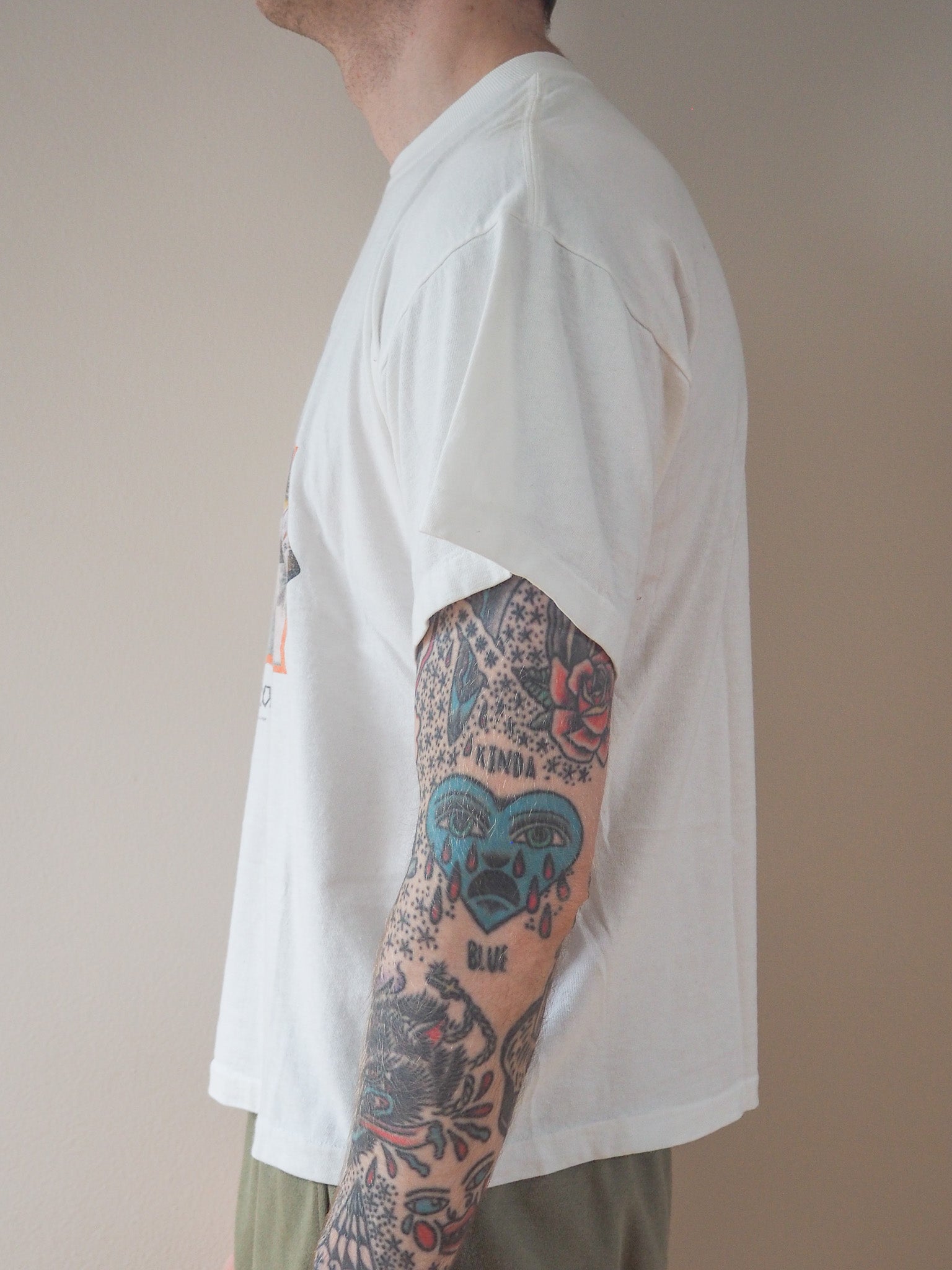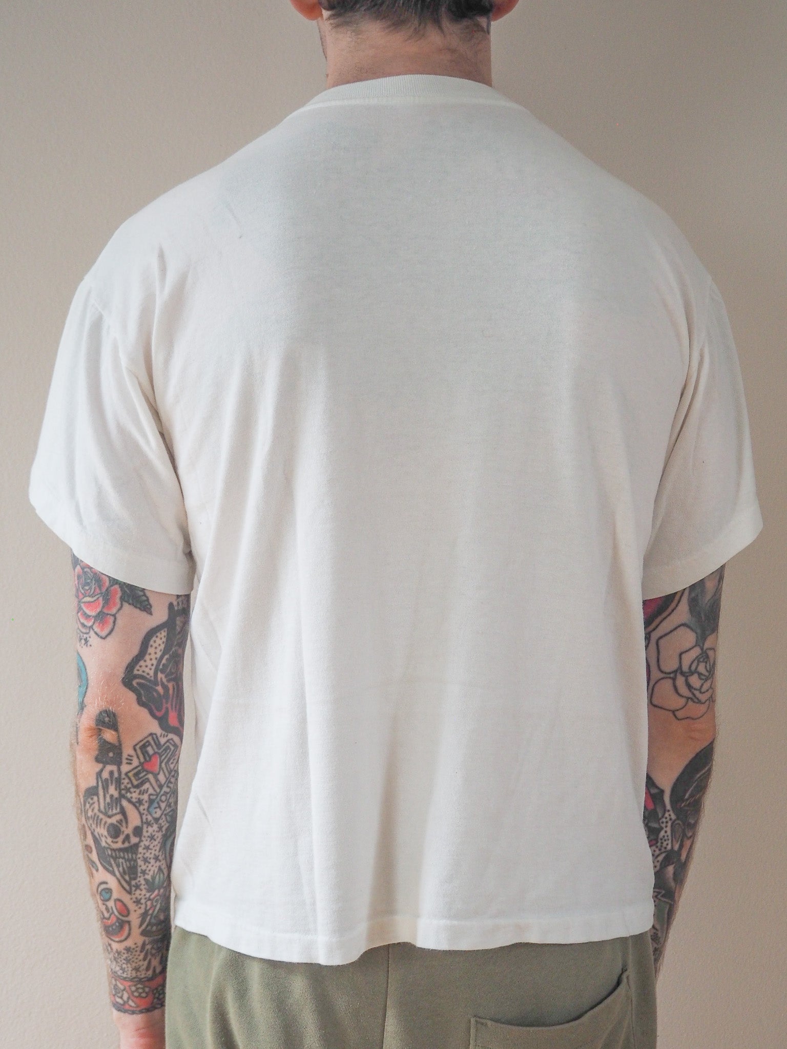 Printed on a faded out tag. Some flaws throughout. Single stitched top and single stitched bottom.