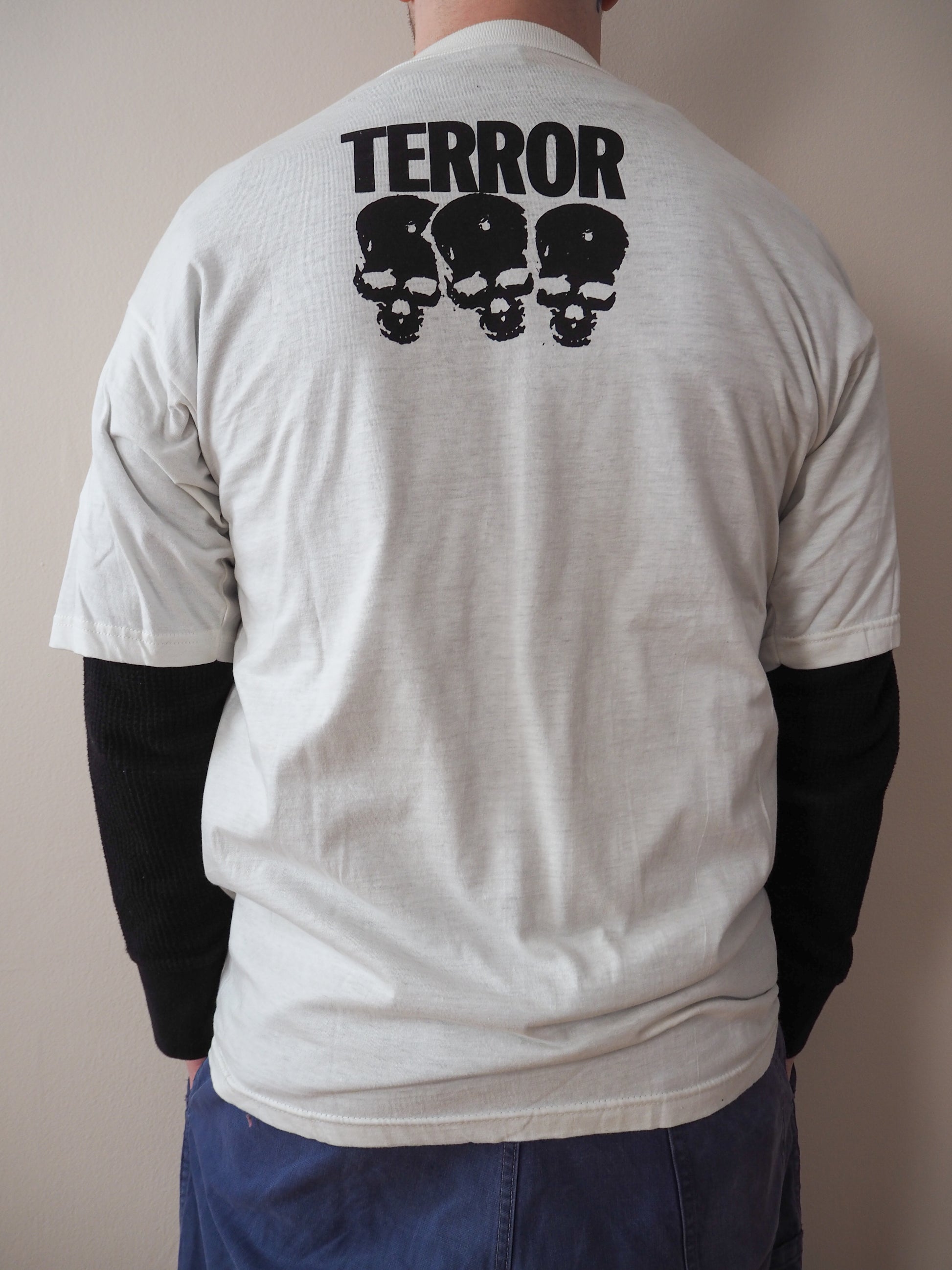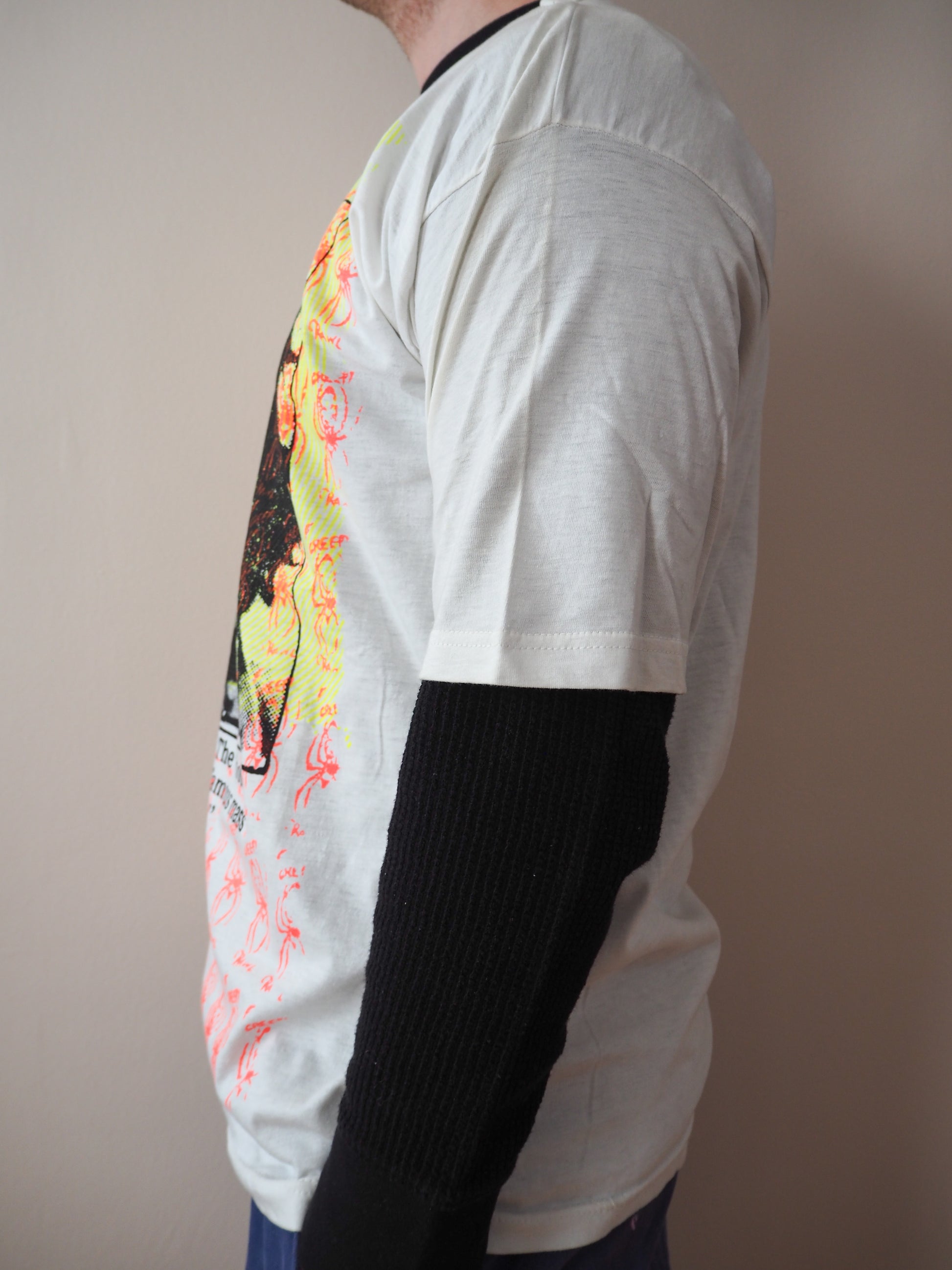 Printed on a Sierra Teez tagged XL. Great overall condition with one very slightly loose thread. Double stitched top and double stitched bottom.