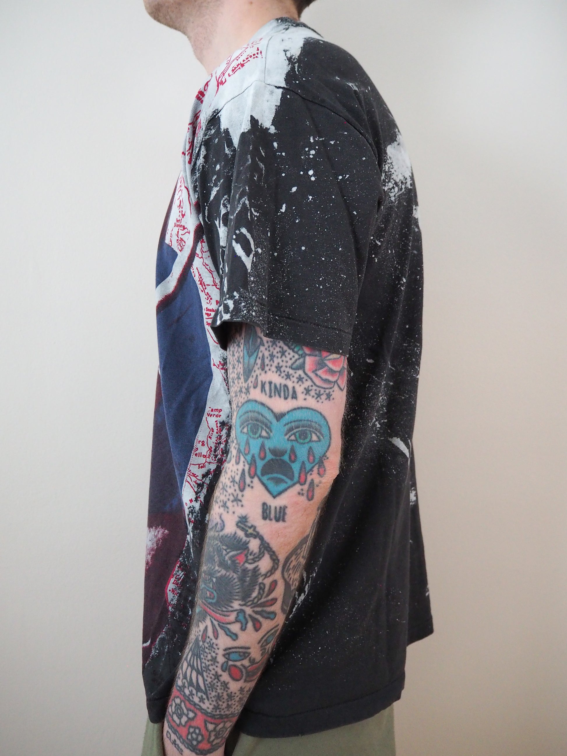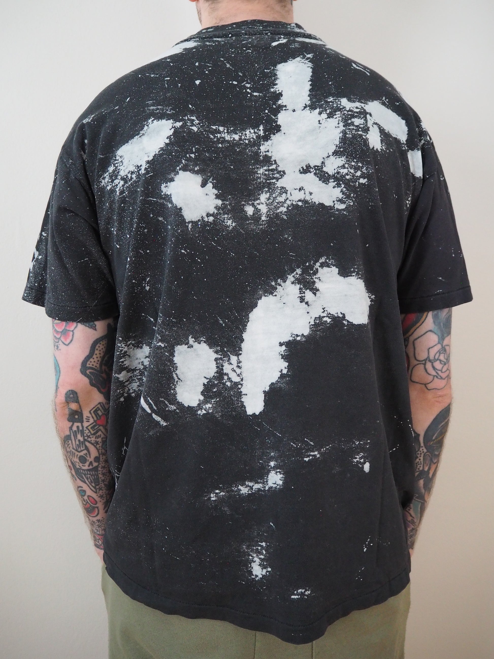 Printed on a Hanes Heavyweight tagged XL. Some pinholes throughout. Great wear and fade on shirt. Single stitched top and single stitched bottom.