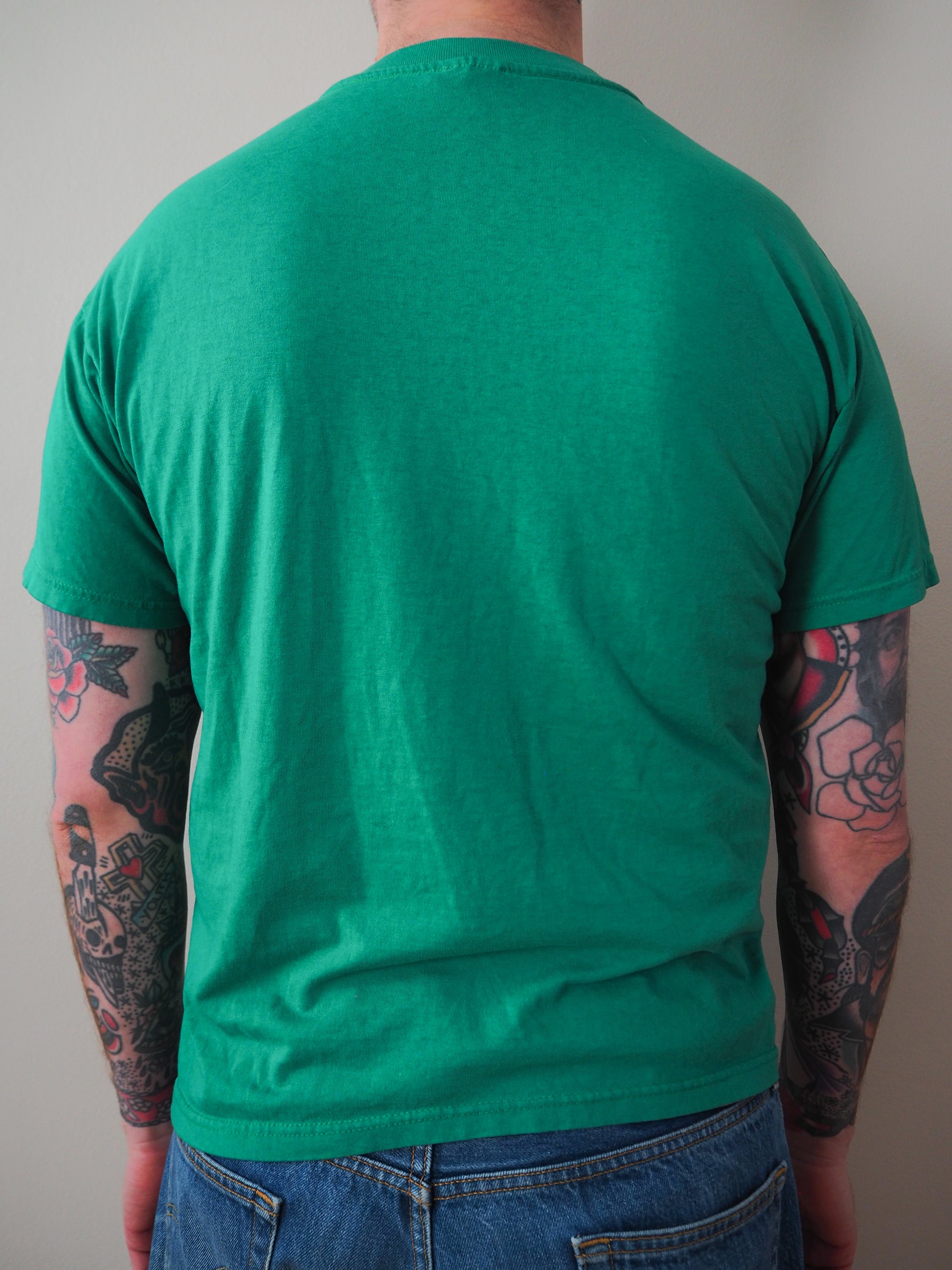 Printed on a Hanes heavyweight 50/50 tagged large. Great fade and cracking in the graphic. small smudge on front. Double stitched top and double stitched bottom