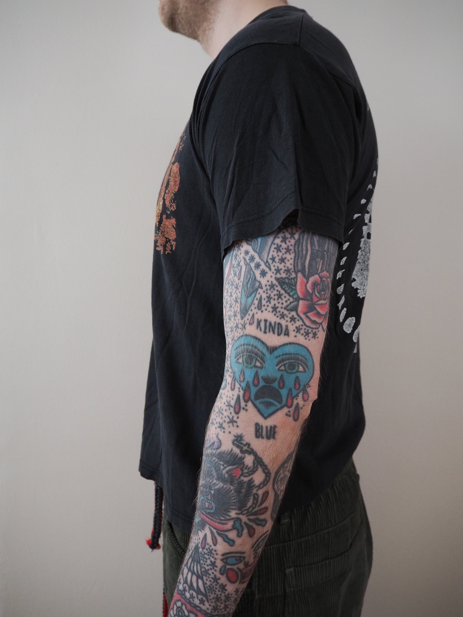Faded out tag. Great fade and wear. Some cracking on the graphic. Double stitched top and double stitched bottom.