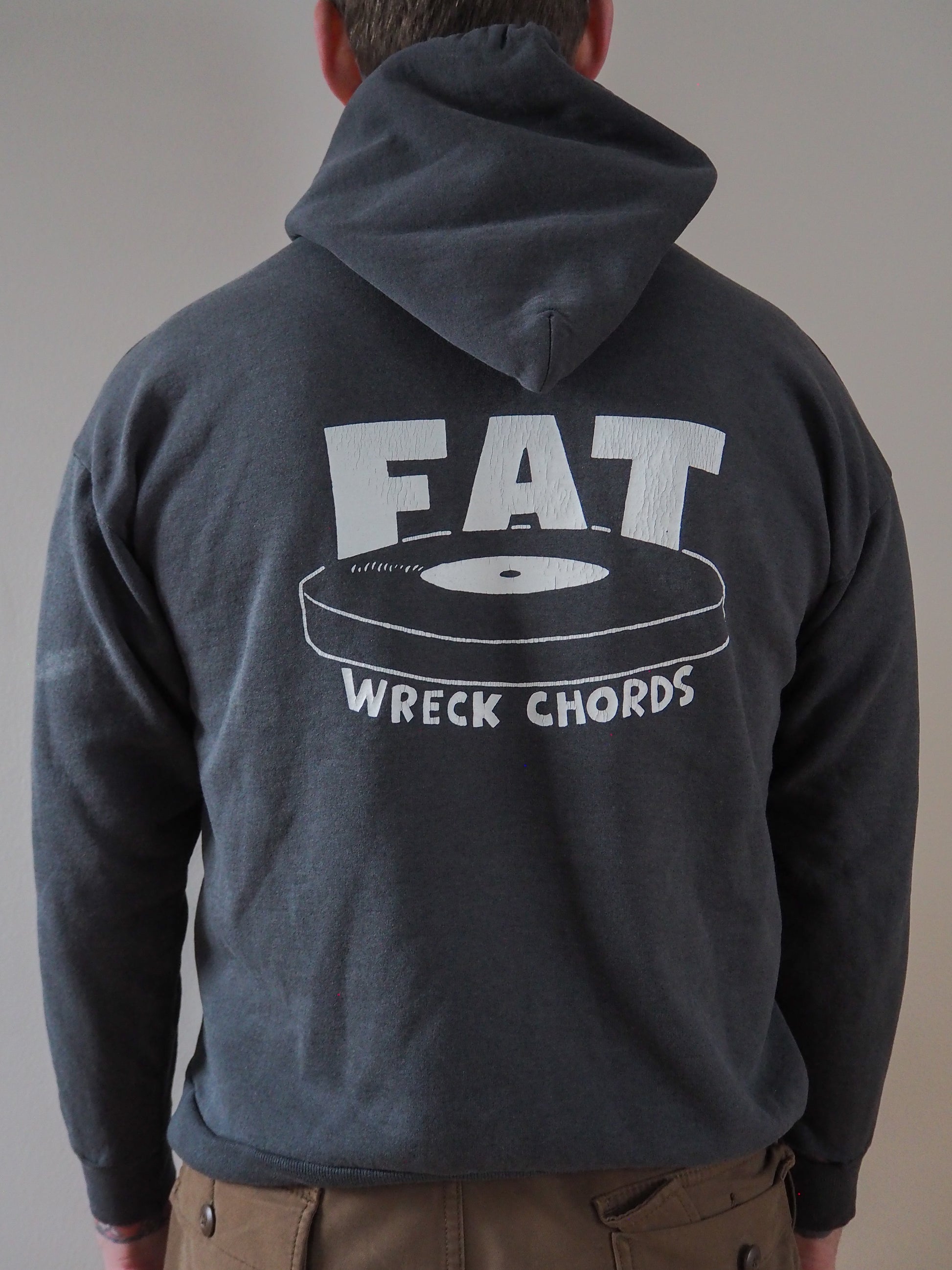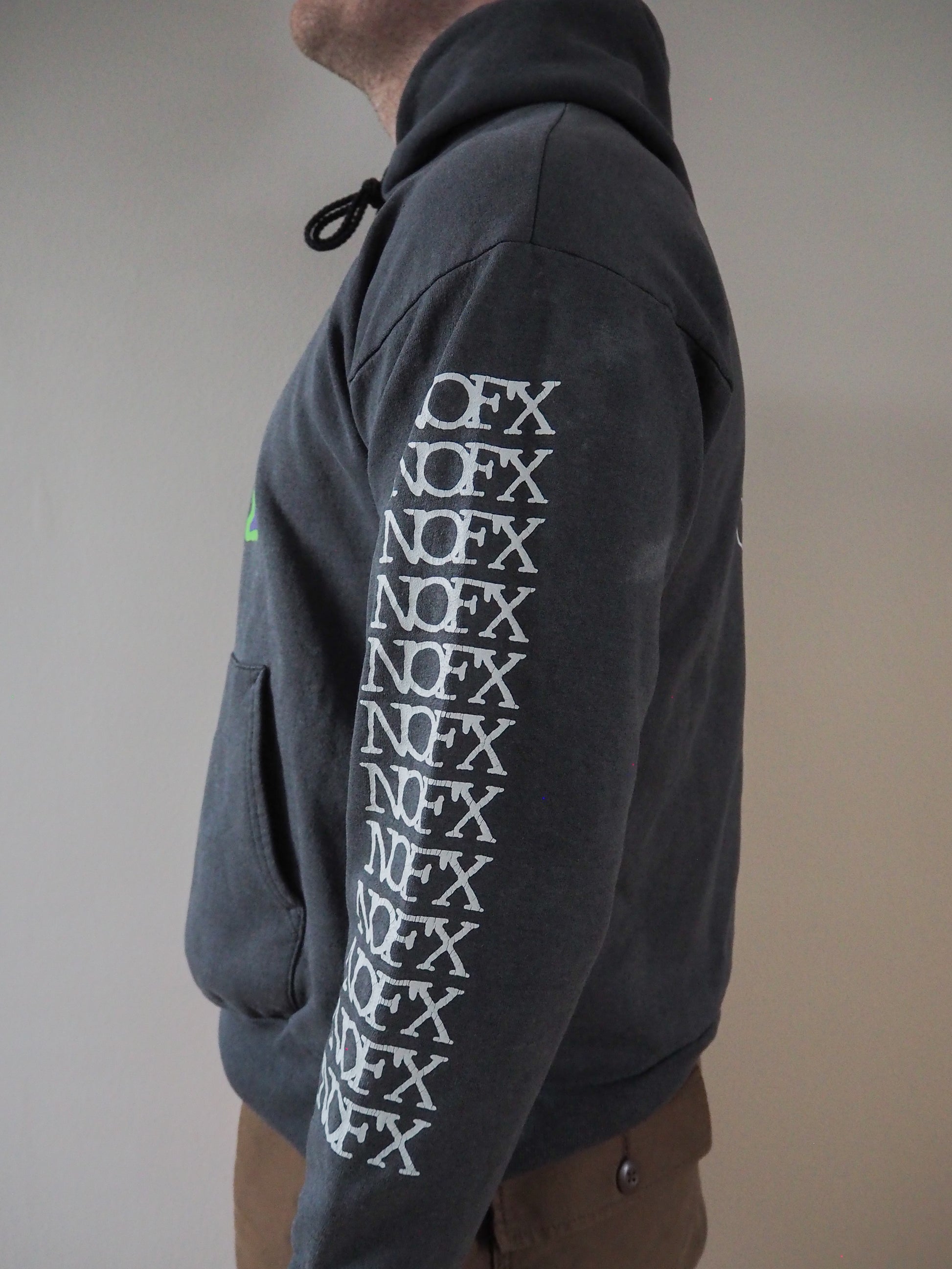 Printed on a Hanes Comfortwear tagged large. great fade, cracking in graphic and heavily worn right cuff.