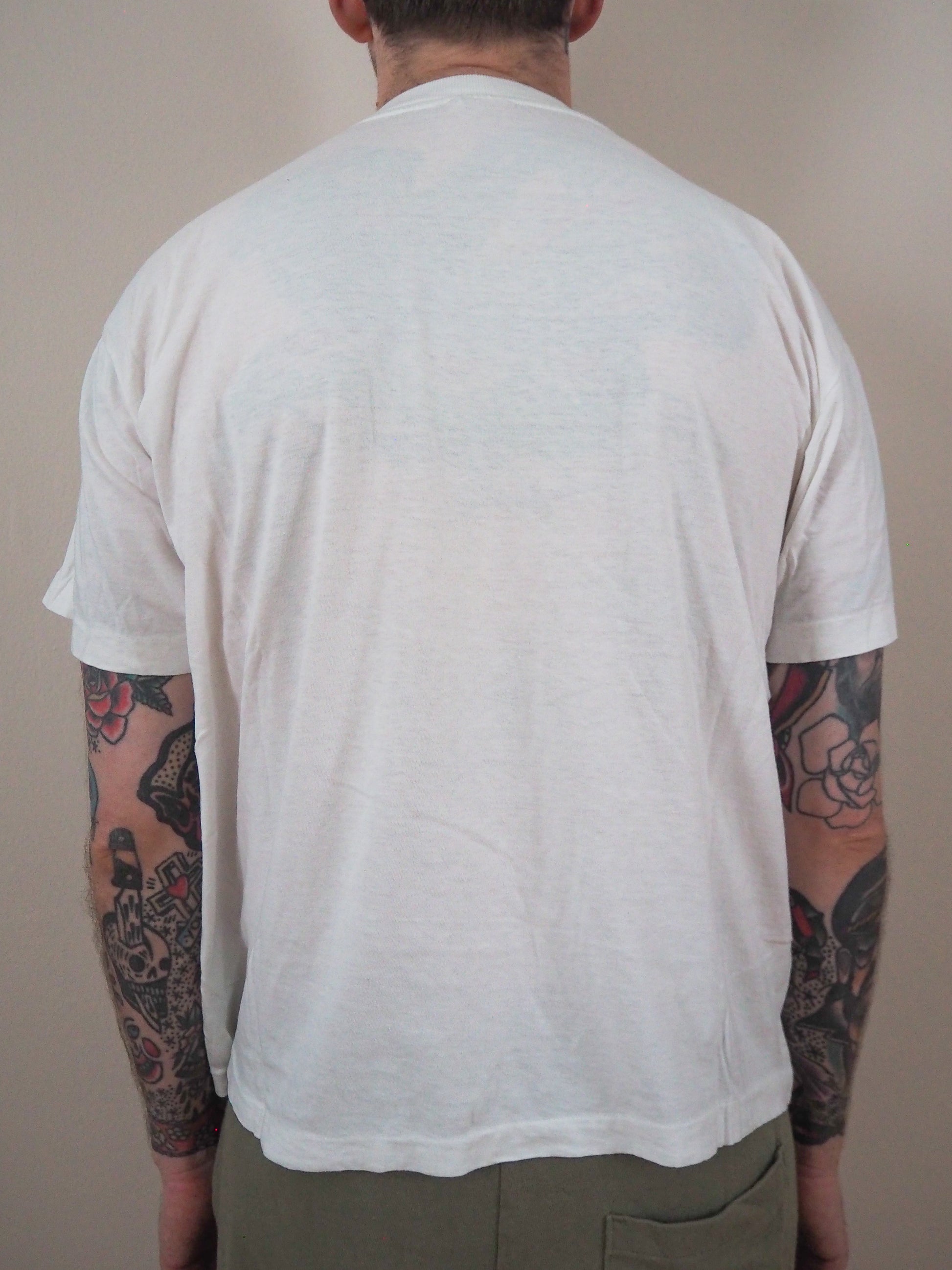 Printed on a Airak tagged XL. Some small marks throughout. Single stitcehd top and single stitched bottom.