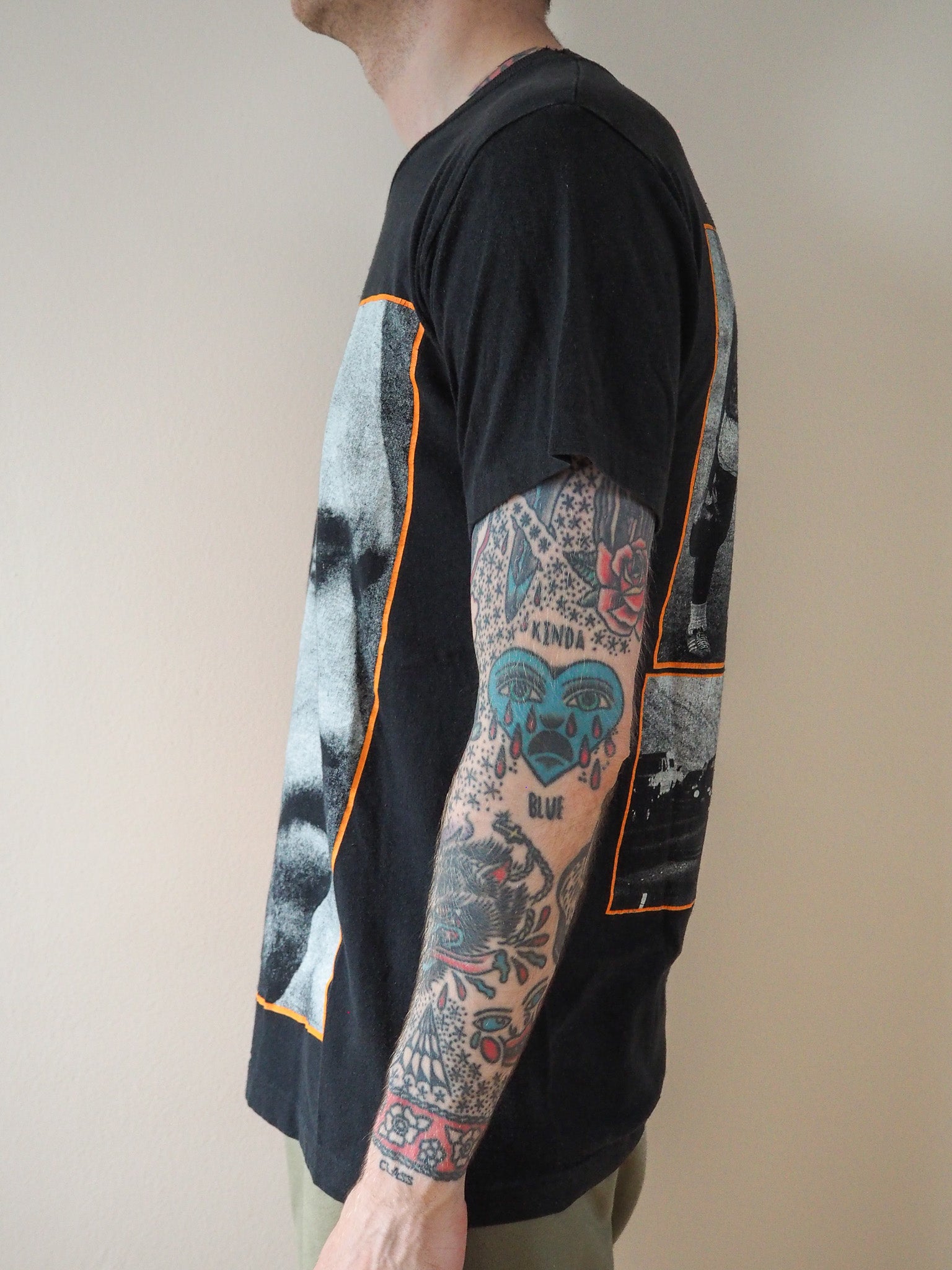 Printed on a faded out tag. Good fade. Some cracking in graphic and light stains in pits. Single stitched top and single stitched bottom.