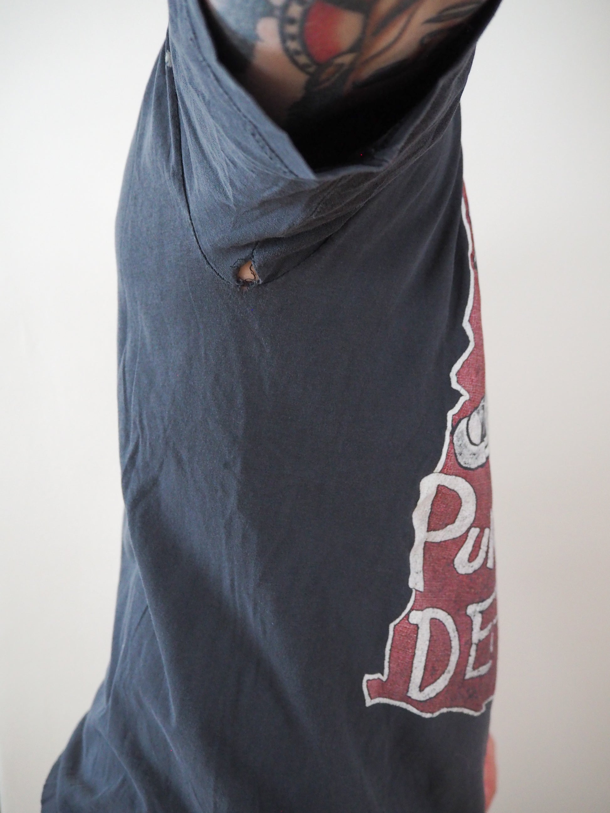 Printed on a Top Shirt tagged Large. Bleaching and staining throughout, hole in the pit, great fade, cracking on graphic. Double stitched top and double stitched bottom.