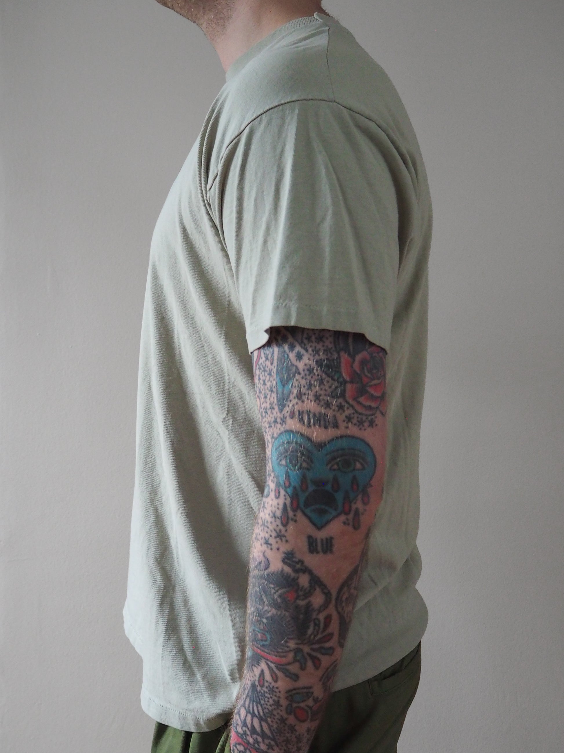 Printed on a Hanes Heavyweight tagged size XL. Single stitched top single stitched bottom. No major stains, holes, small bleach stains on back. Great fade.