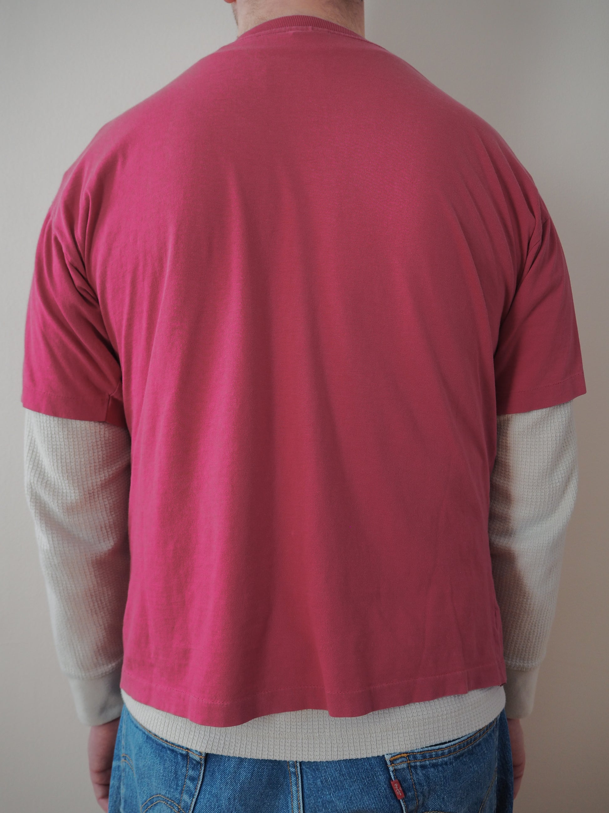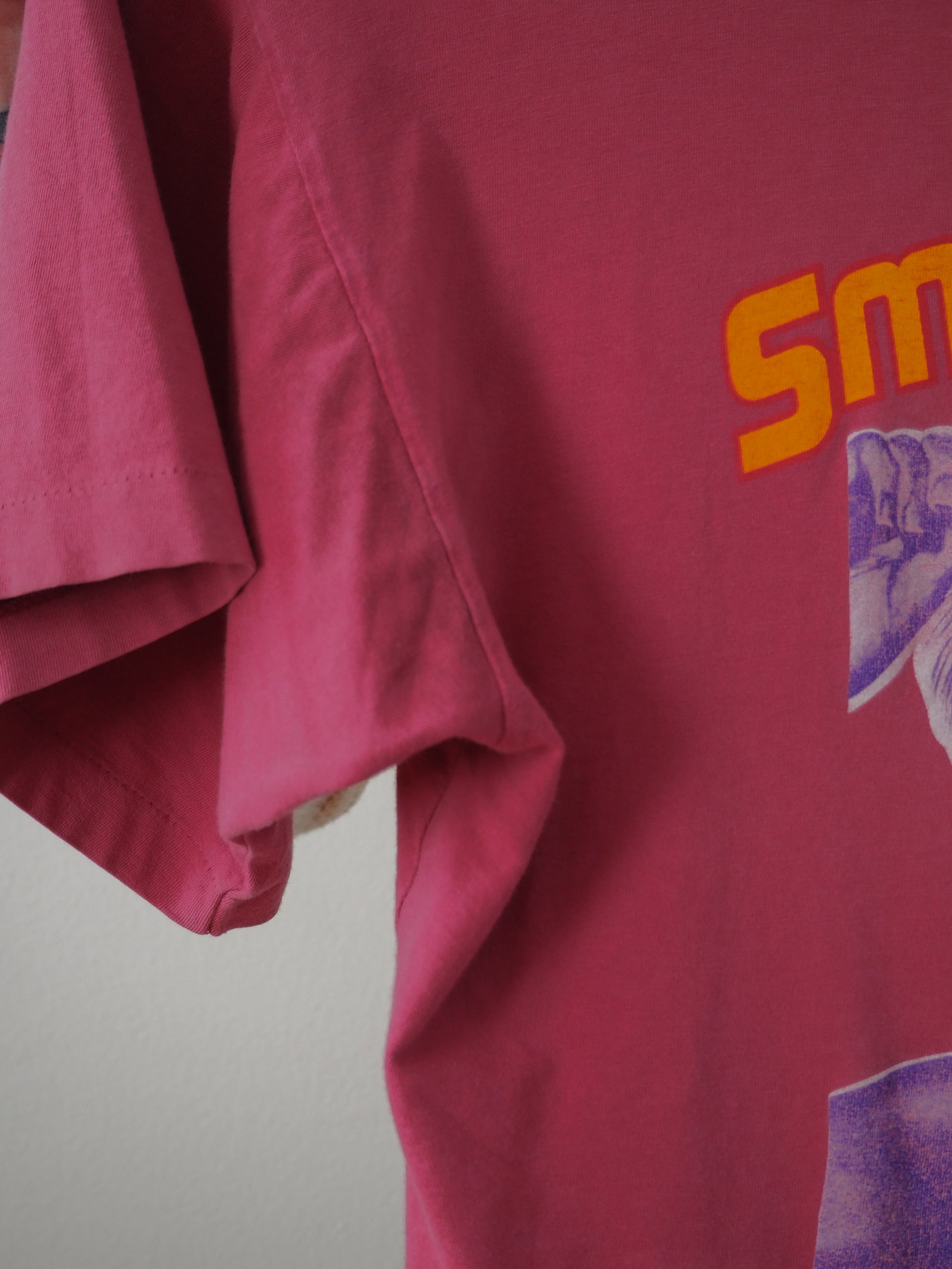 Printed on a Firefox tagged XXL. Discoloration in pits and some threads missing on bottom of shirt. Single stitched top and single stitched bottom