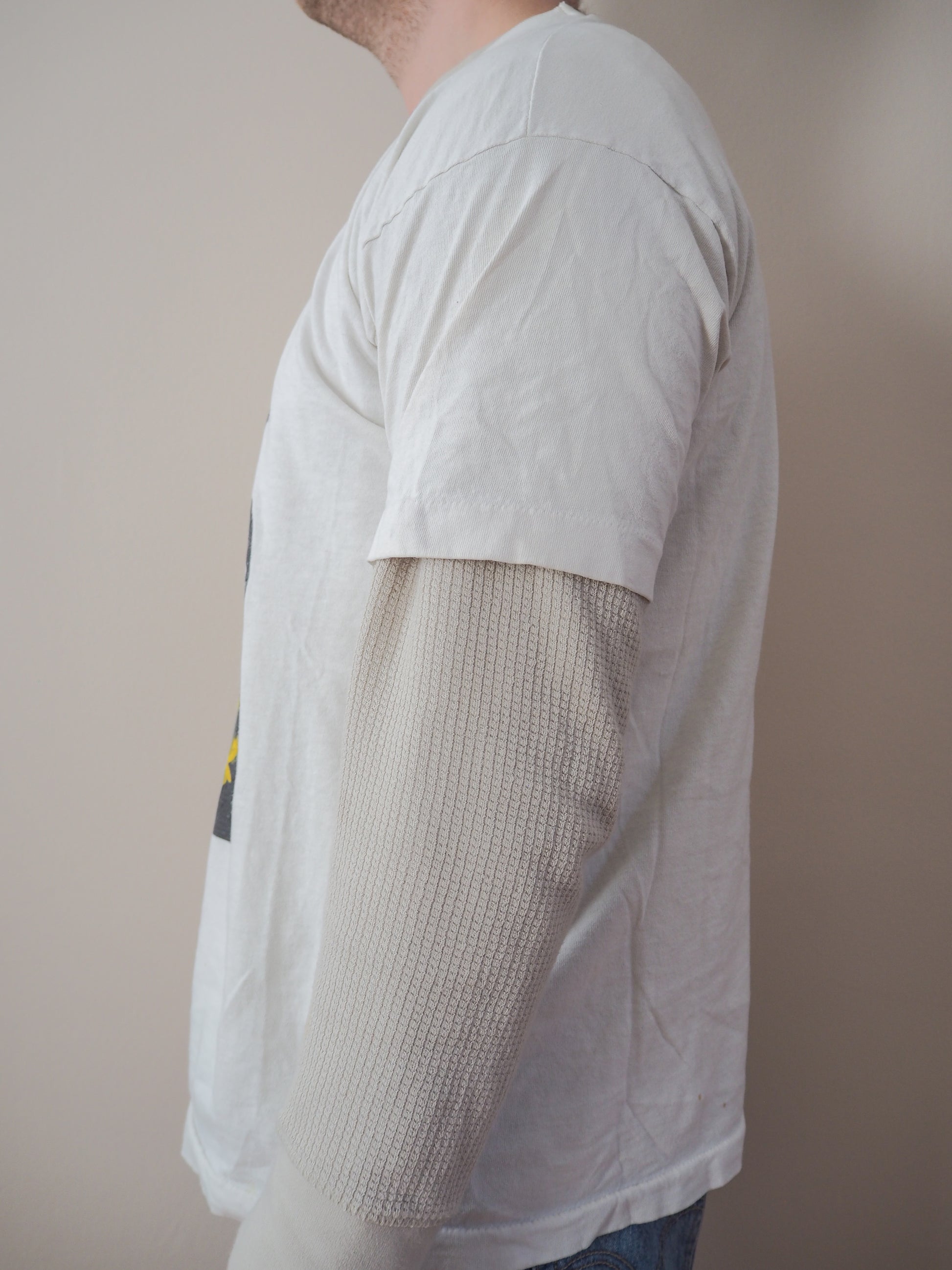 Printed on a Fruit of the Loom tagged XL. Some pinholes and light staining thoughout. Single stitched top and single stitched bottom.