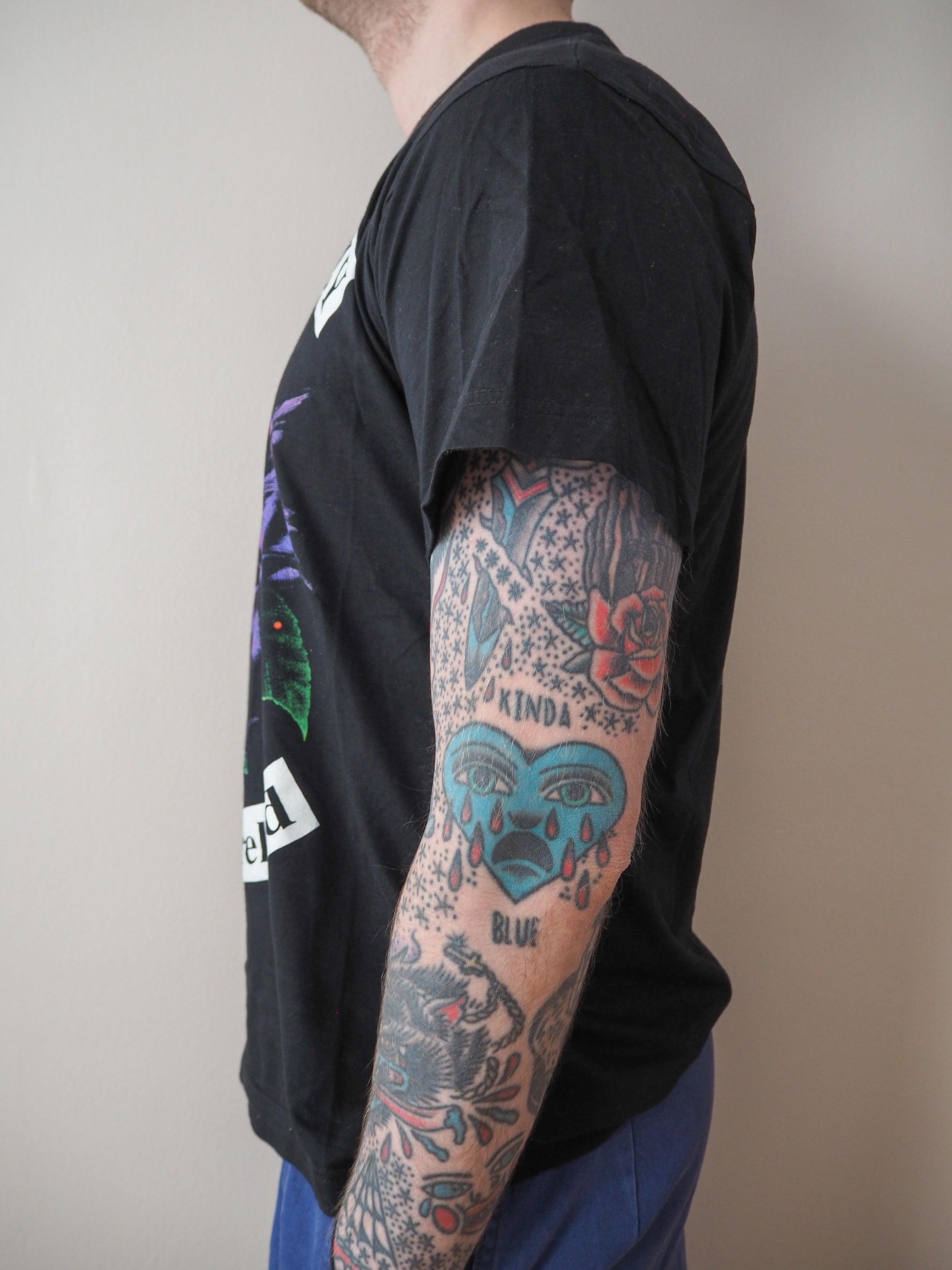 Printed on a euro combed cotton tagged large. Light cracking in graphic with overall good condition. Double stitched top and double stitched bottom.