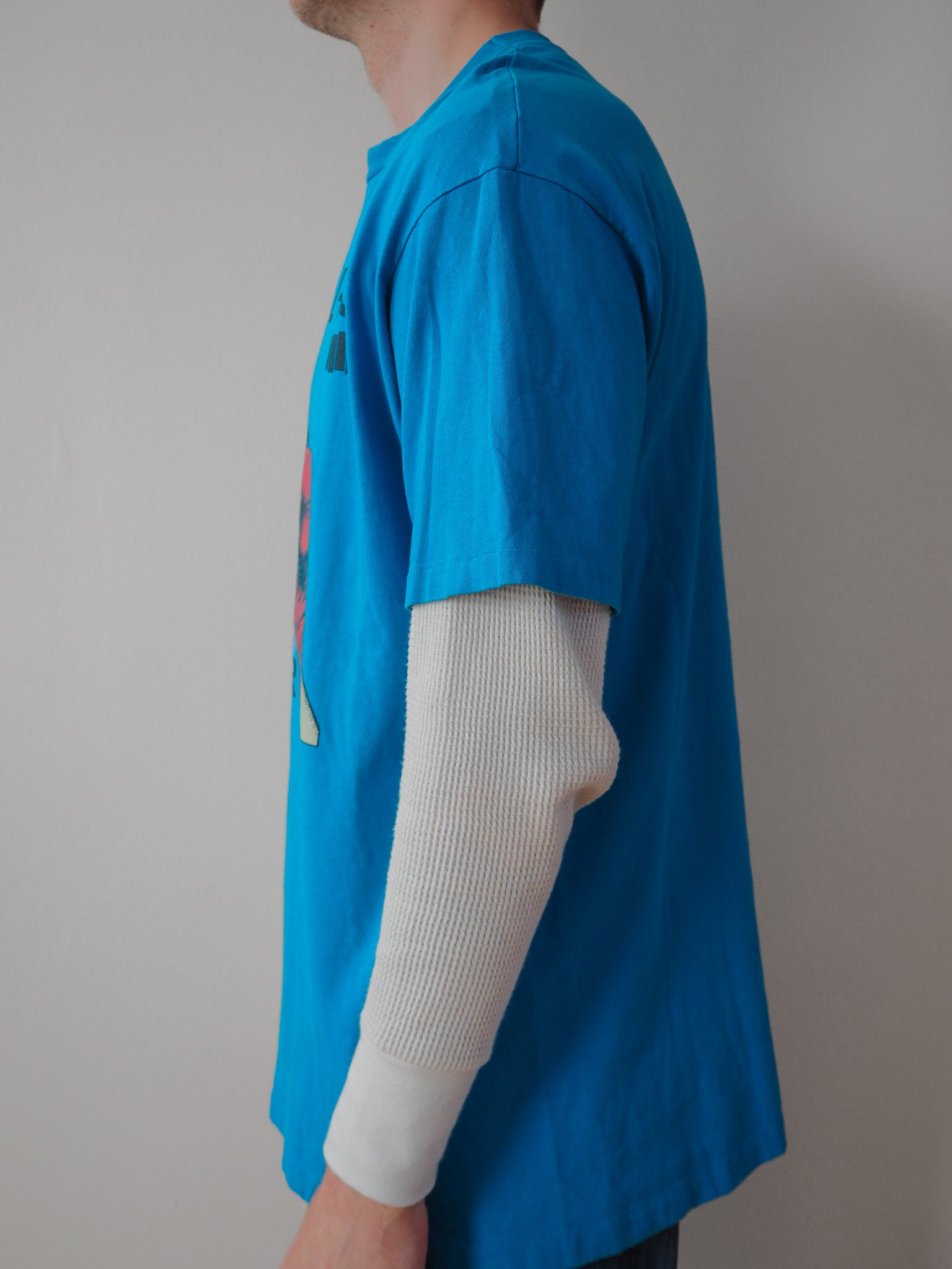Printed on a 80s SST tagged XL. Good quality on blank. Cracking throughout graphic. Single stitched top and single stitched bottom.