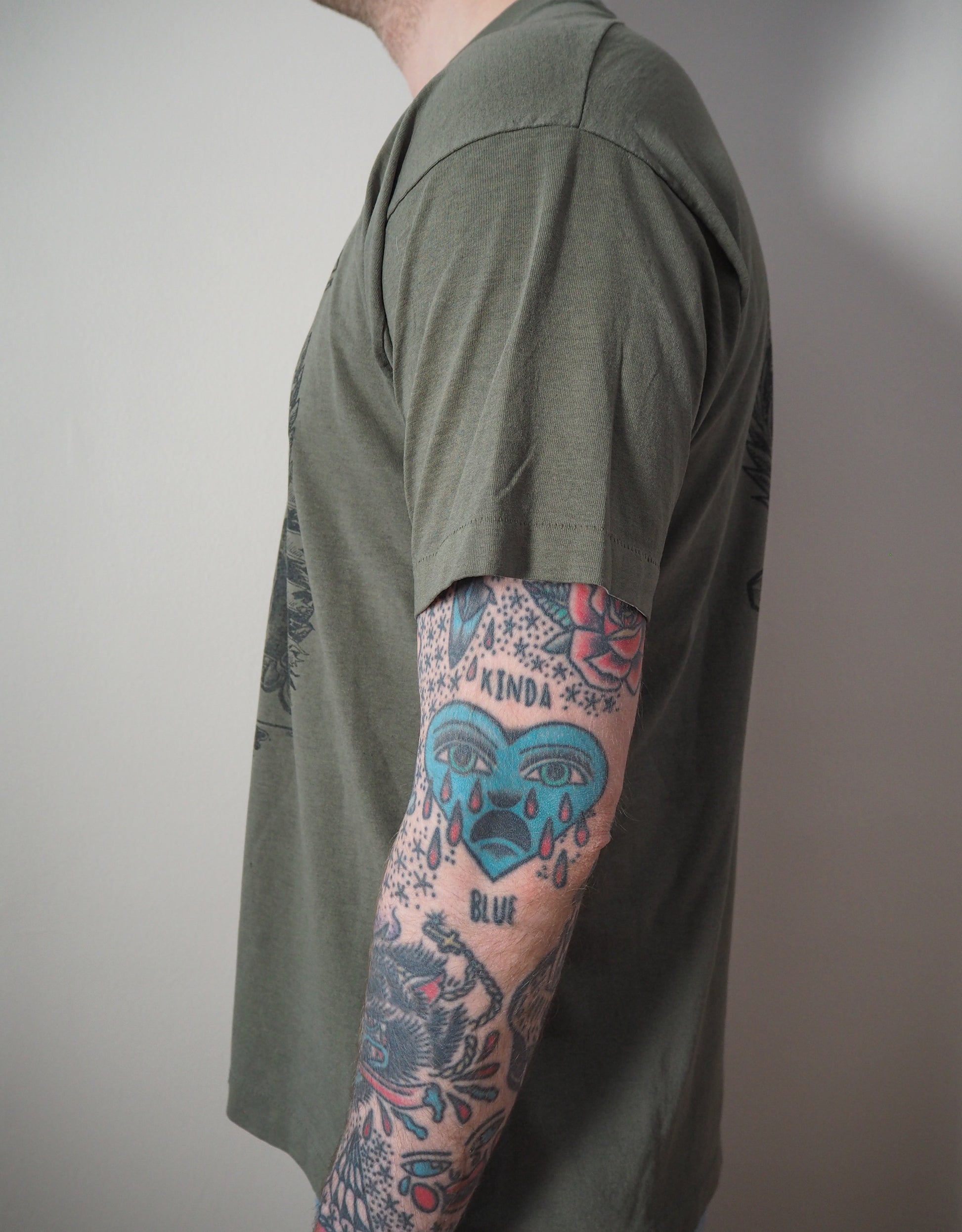 Printed on a cut Fruit of the Loom Best 50/50. Very nice fade, pinholes throughout shirt. Single stitched top and single stitched bottom.