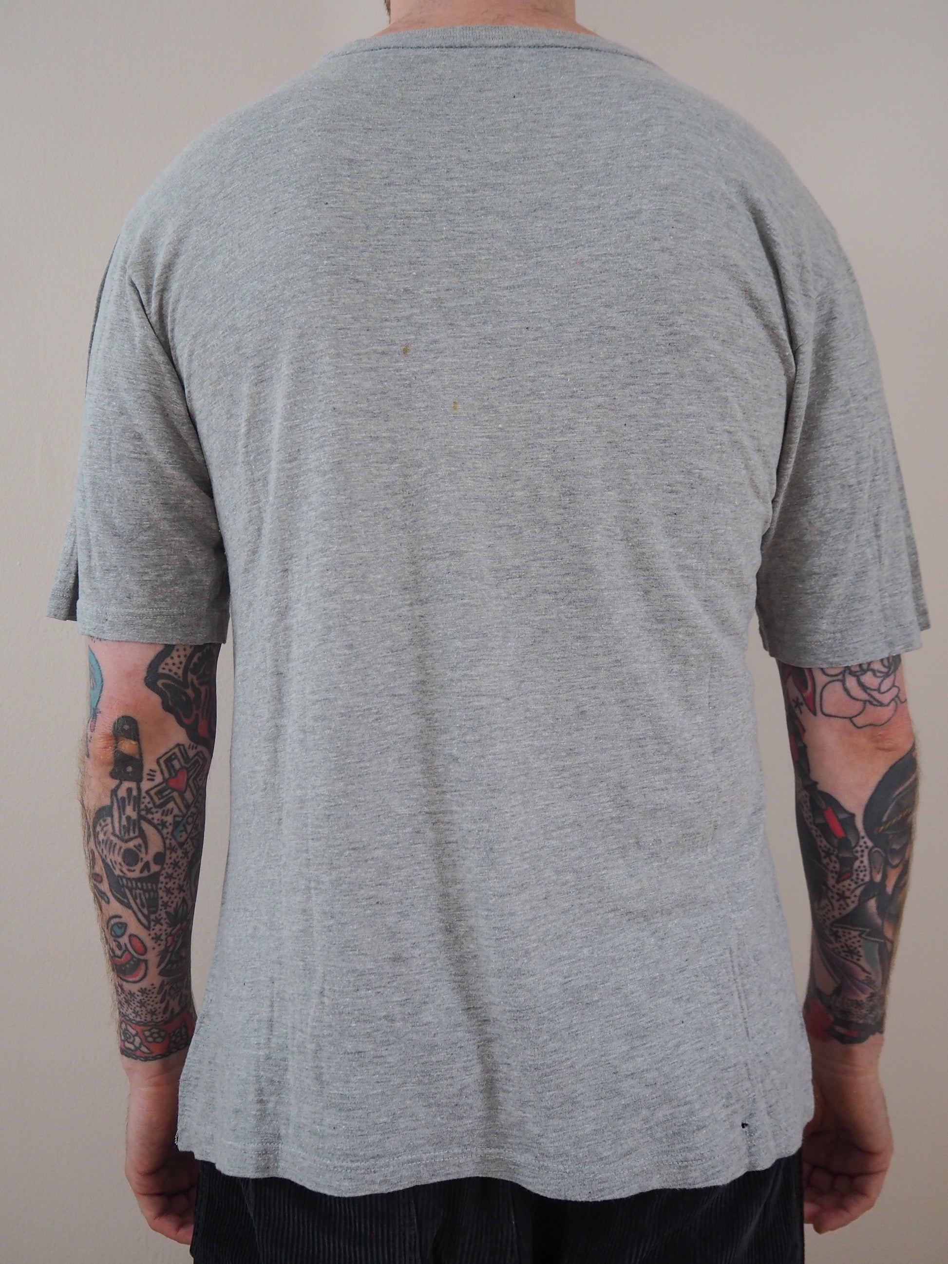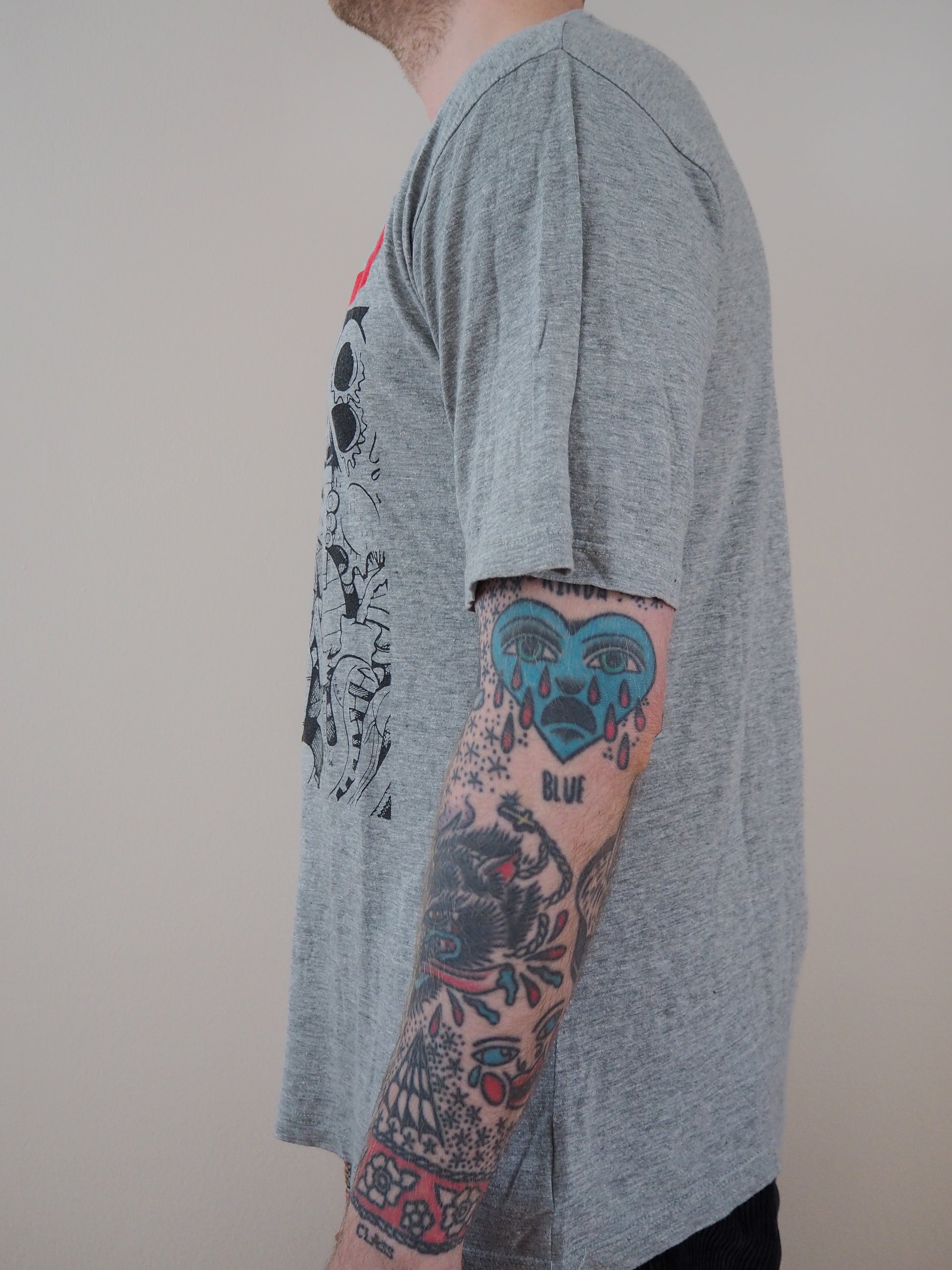 Printed on a cut tag. Good fade, some cracking in the grpahic. Euro sleeves. Double stitched top and Double stitched bottom.