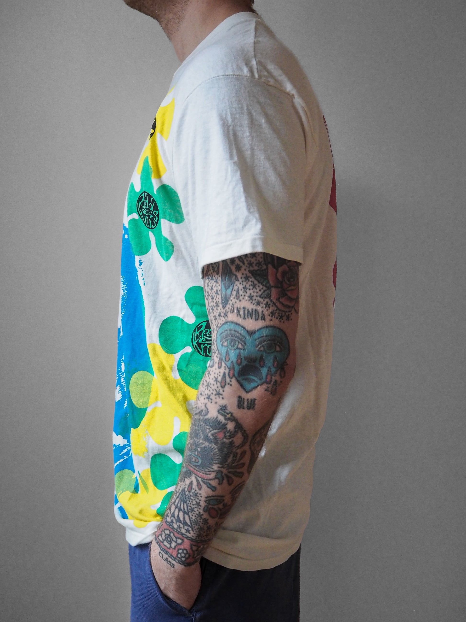 Through a meticulous two-print process, this shirt showcases vibrant flowers and celebrity prints from the 80s by Bill Mooney on a Stedman XL shirt. The narrative takes an exclusive turn in 2023, as Bill of Tannis Root handcrafts and adds badges, making it a one-of-a-kind 1-3 configuration—the only XL ever to grace the public eye.