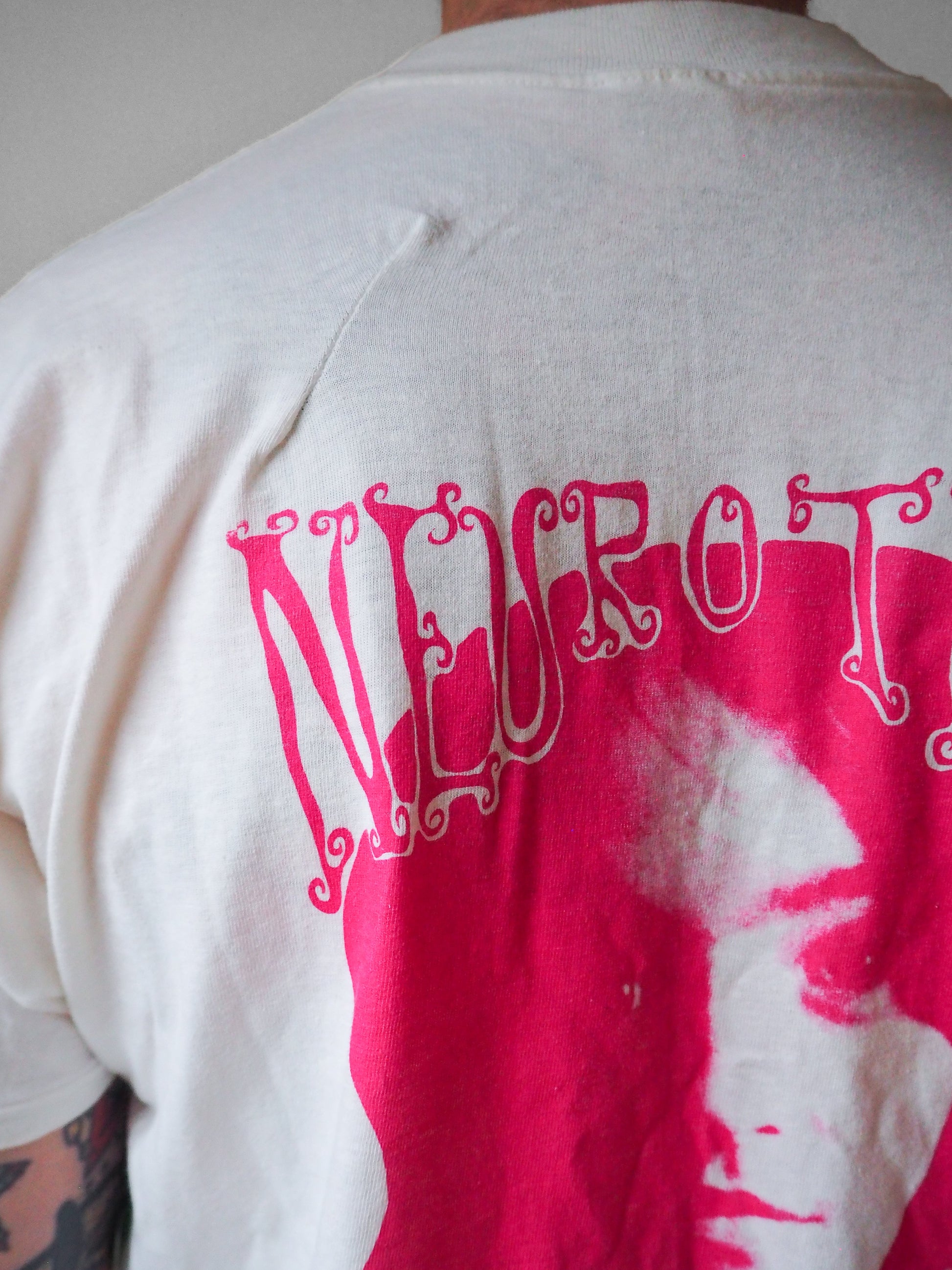 Adding to its charm, the shirt boasts a carefully repaired gash from Tannis Root's archives. With single-stitched sleeves and double-stitched bottom.